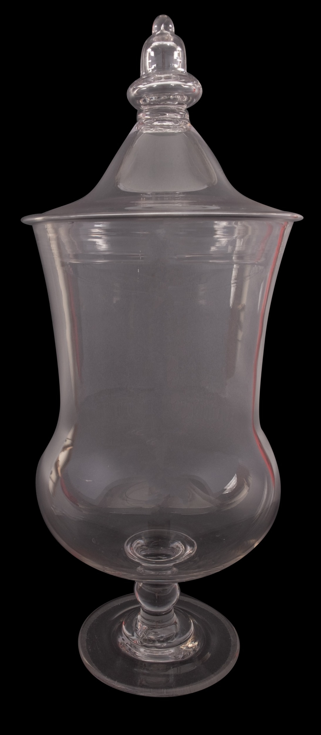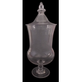 A large clear glass apothecary jar and cover with acorn finial and on single knopped stem, circa 1820-40, 47cm.