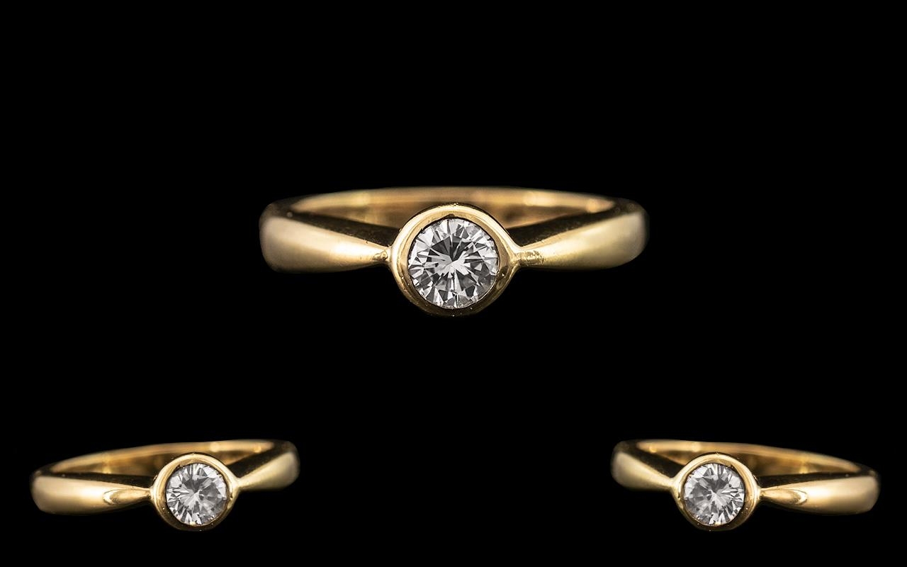 18ct Yellow Gold - Attractive Pave Set Single Stone Diamond Ring. Full Hallmark for London 1994. The Round Brilliant Cut Diamond of Excellent Colour and Clarity. Est H - Colour, VSI Clarity, Diamond Weight Cal 0.33 pts. Marked to Interior of Shank. Ring Size - L. All Aspects of Condition Including Shank and Setting Are Excellent - Please Confirm with Photo.