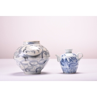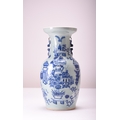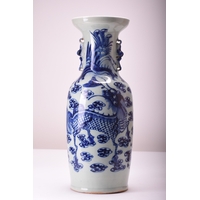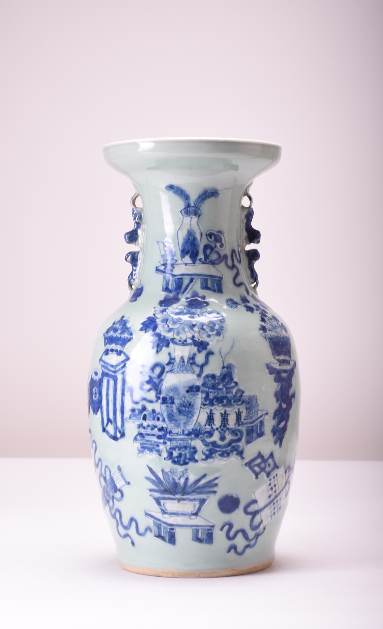 A large Chinese blue and white celadon vase, 19th century With twin lion dog handles, decorated with precious objects and shou symbols. 44cm high