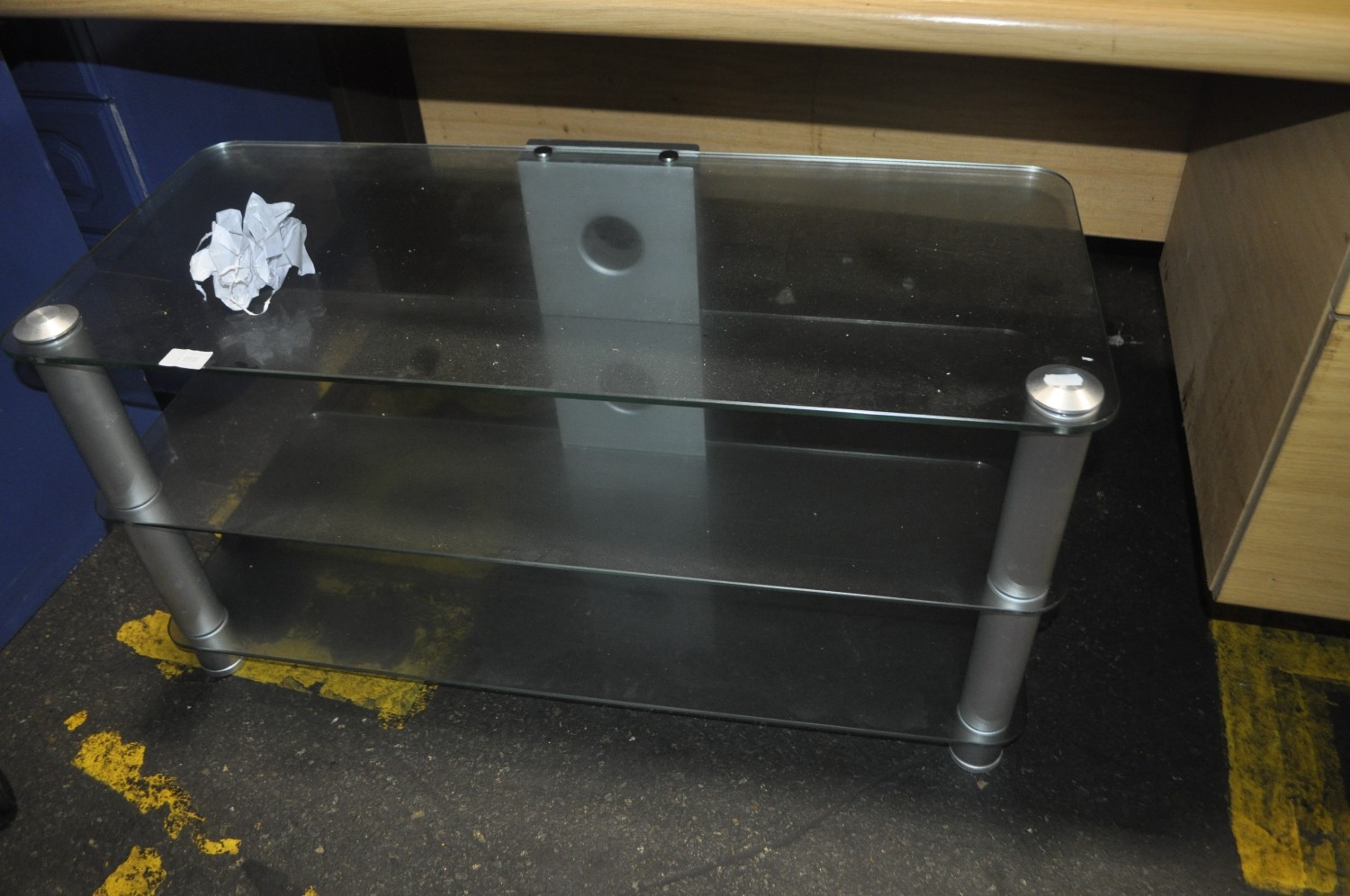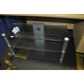 A MODERN THREE TIERED GLASS SHELVED ENTERTAINMENT UNIT