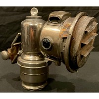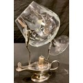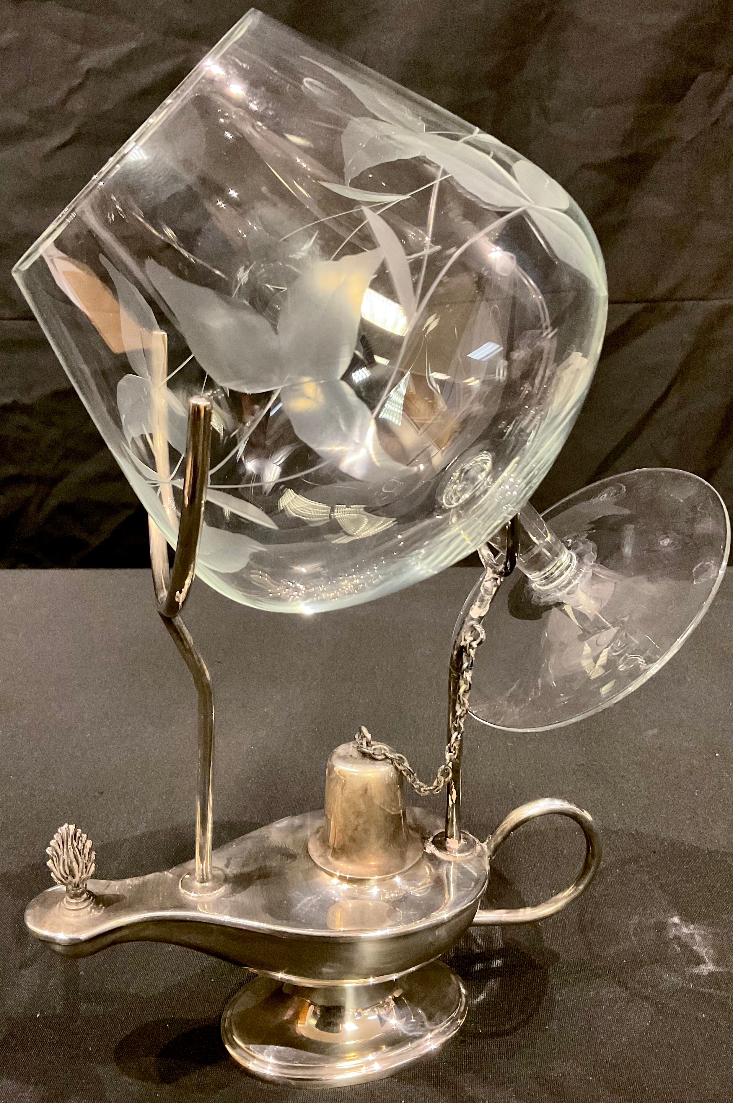 A silver plated Roman candle brandy warmer, with large acid etched brandy balloon glass