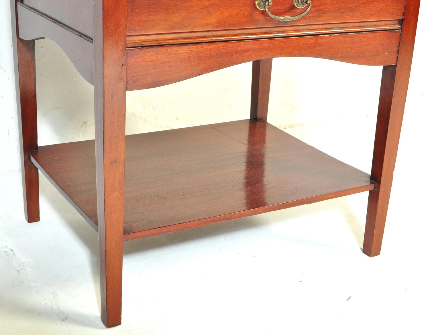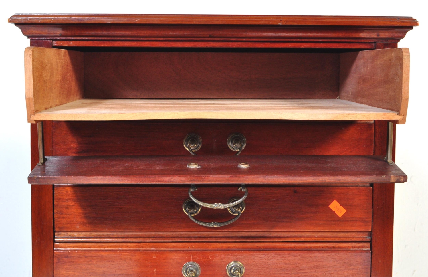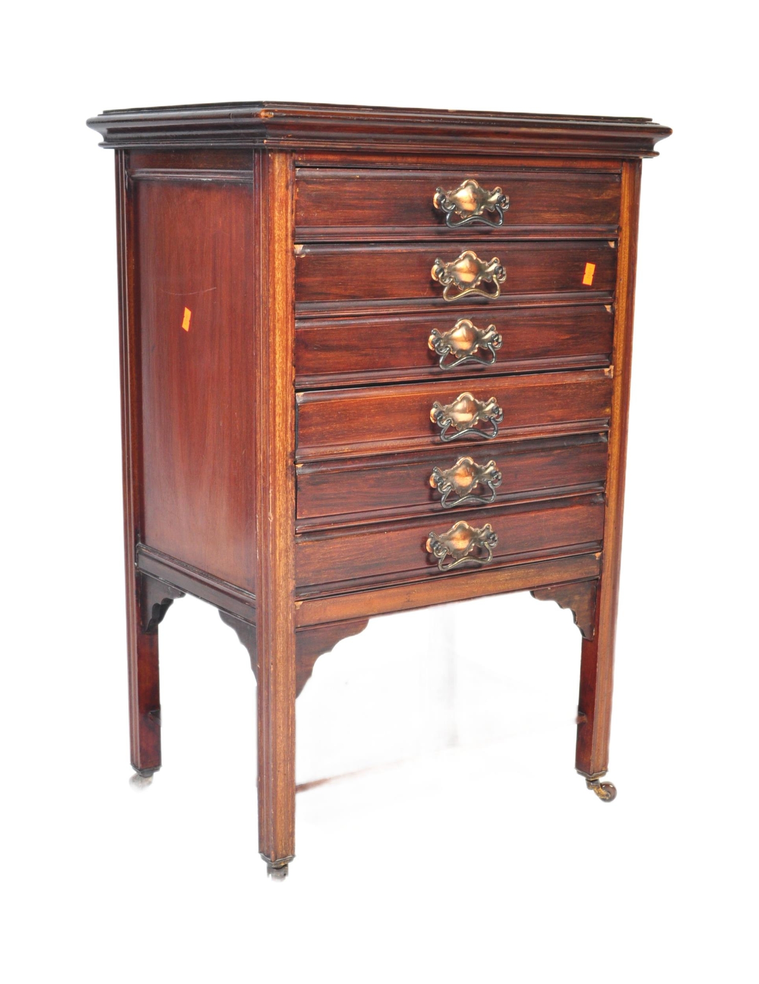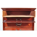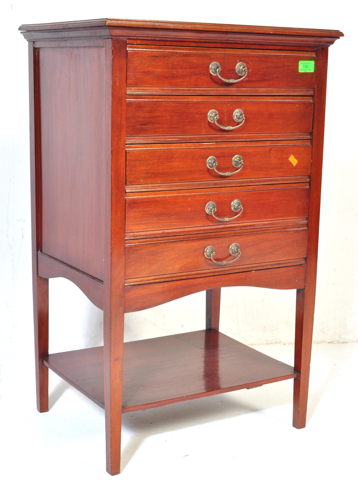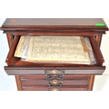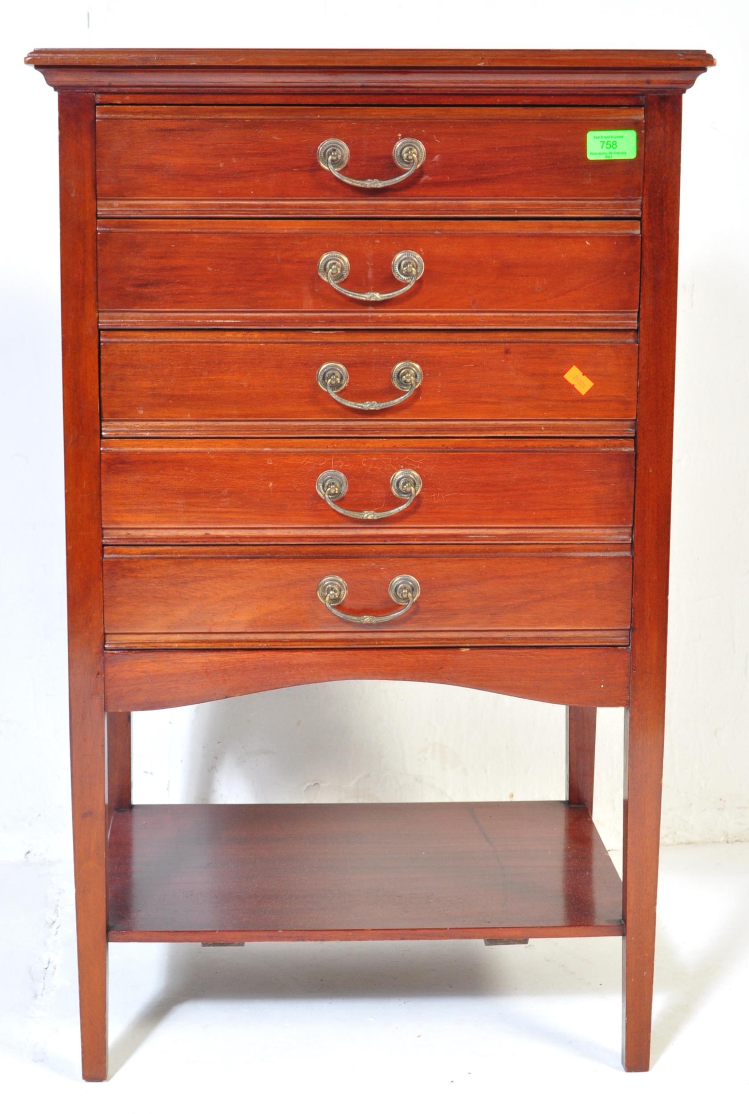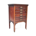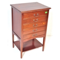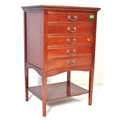 A 20th century 1920's style music cabinet having a bank of five music sheet filing drawers with hinged fall front and slide function and swan neck handles, with under tier beneath.
