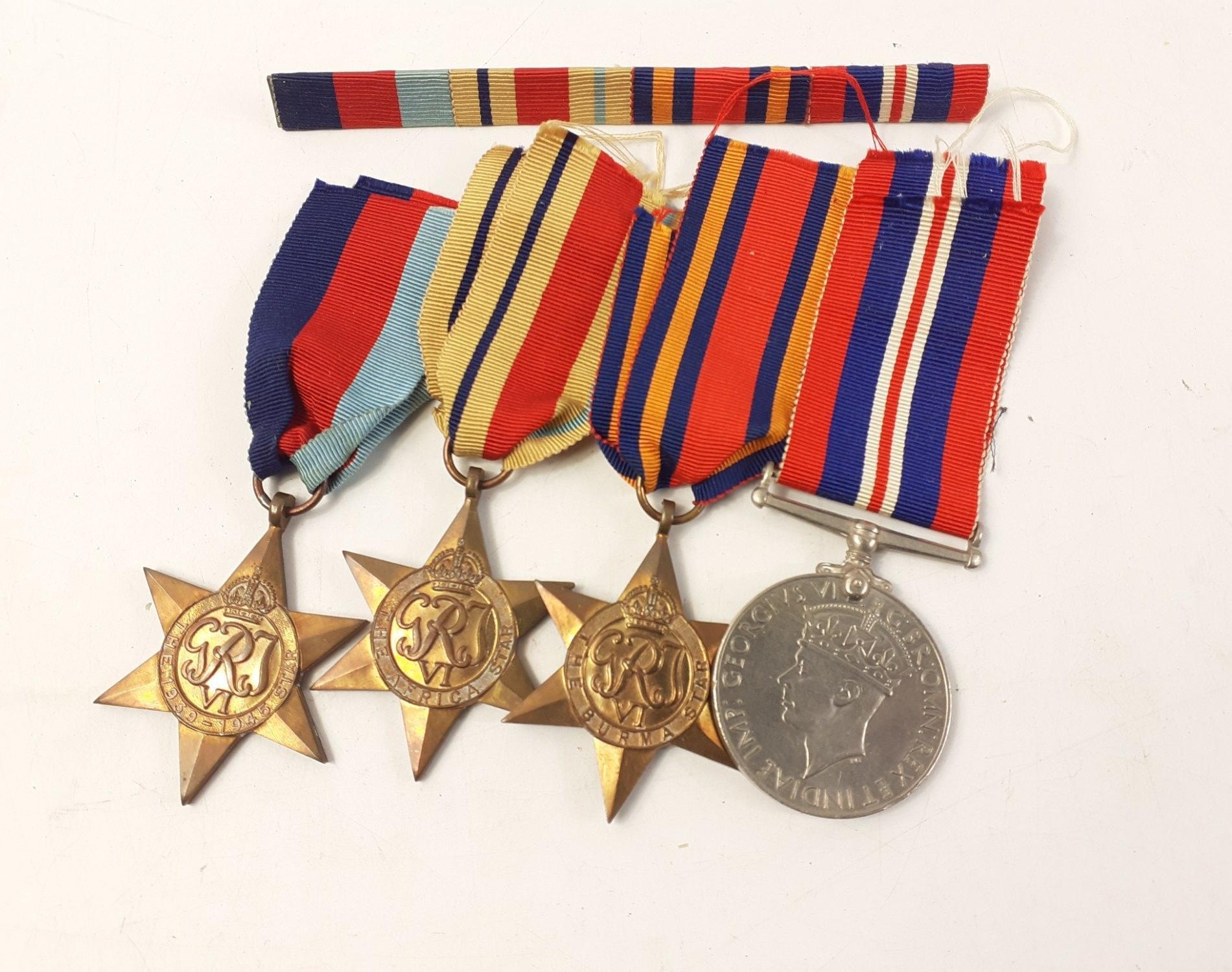 WWII - a suite of medals to include The BURMA STAR, the AFRICA STAR, the 1939-1945 STAR and GENERAL SERVICE MEDAL plus ribbon