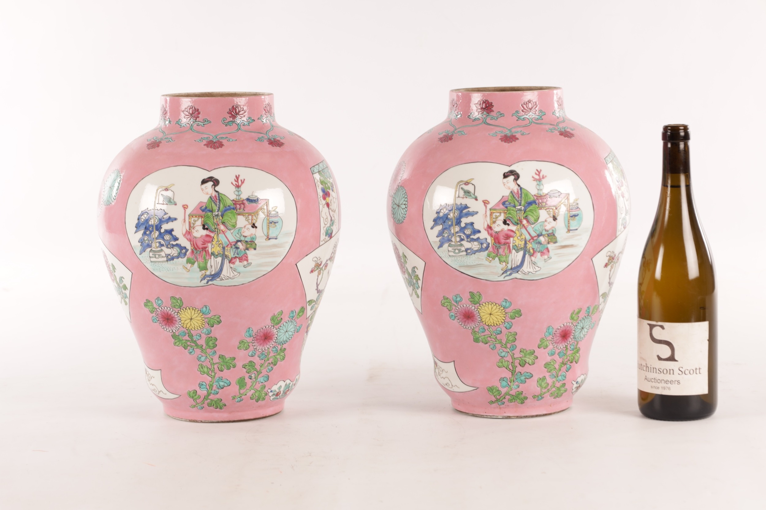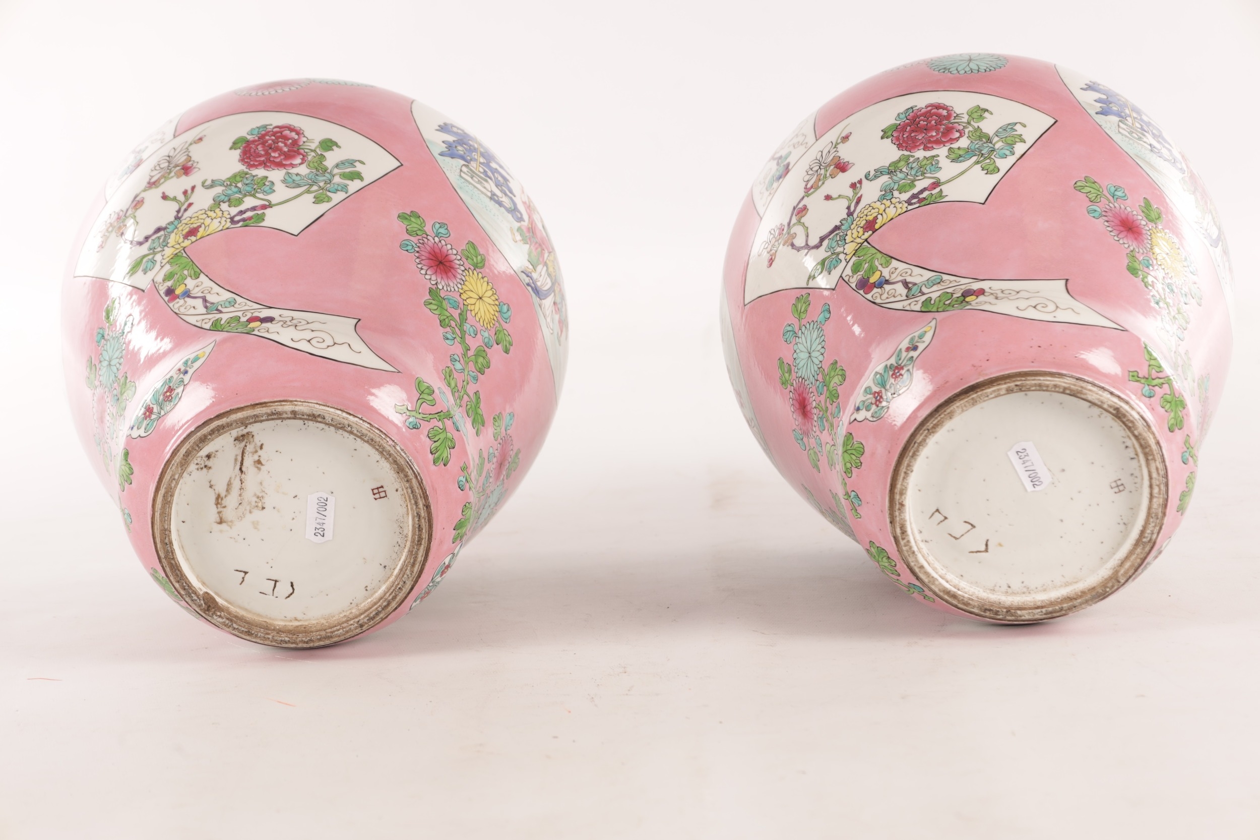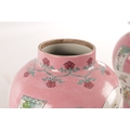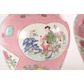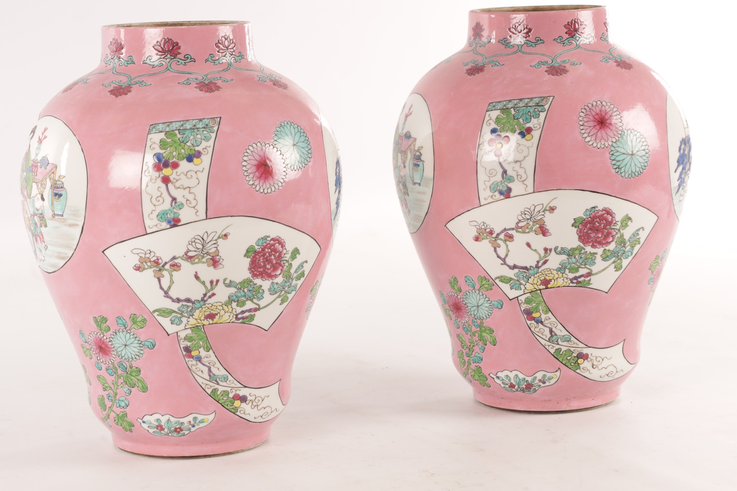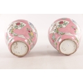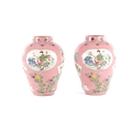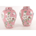 A PAIR OF CHINESE FAMILLE ROSE PINK GROUND BALUSTER VASES with panelled figural garden scenes and floral designs - marked beneath (34cm high)