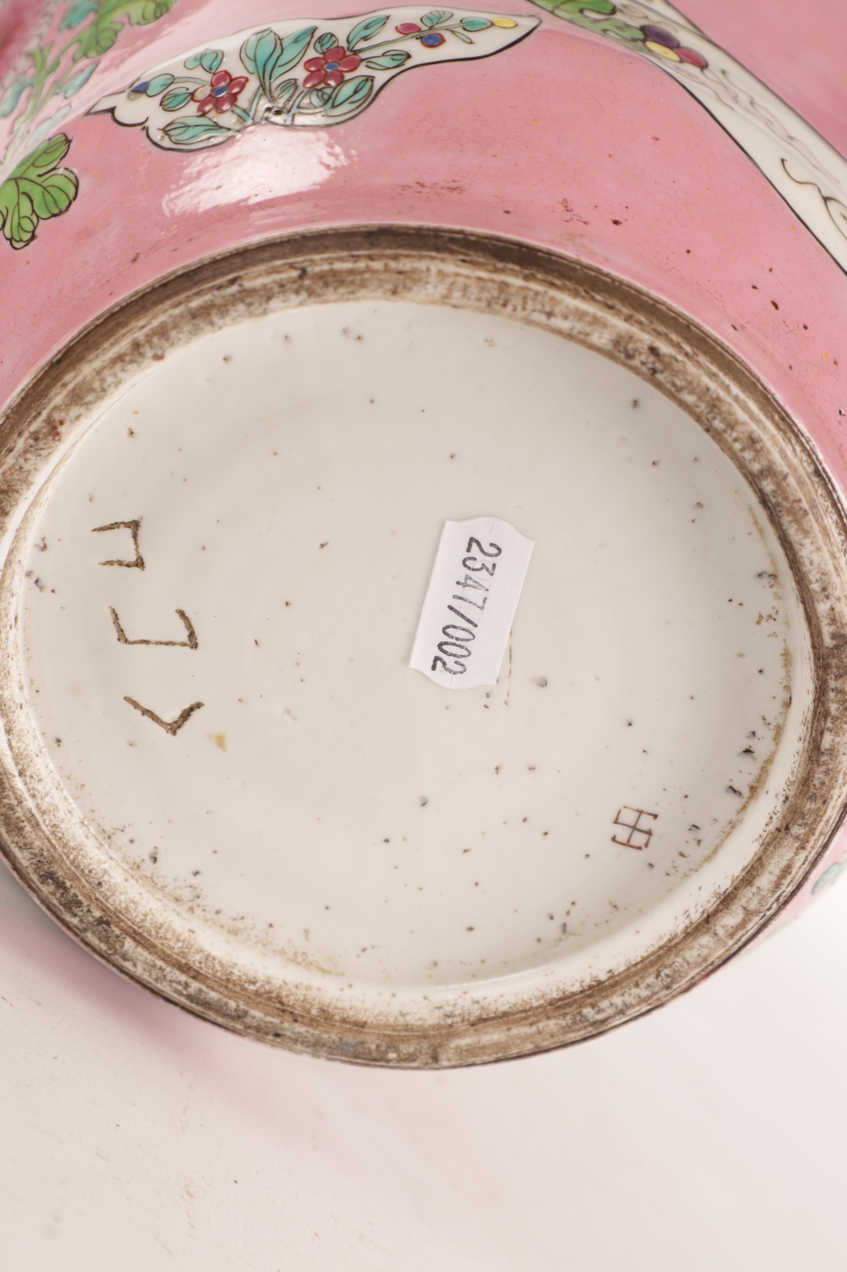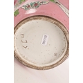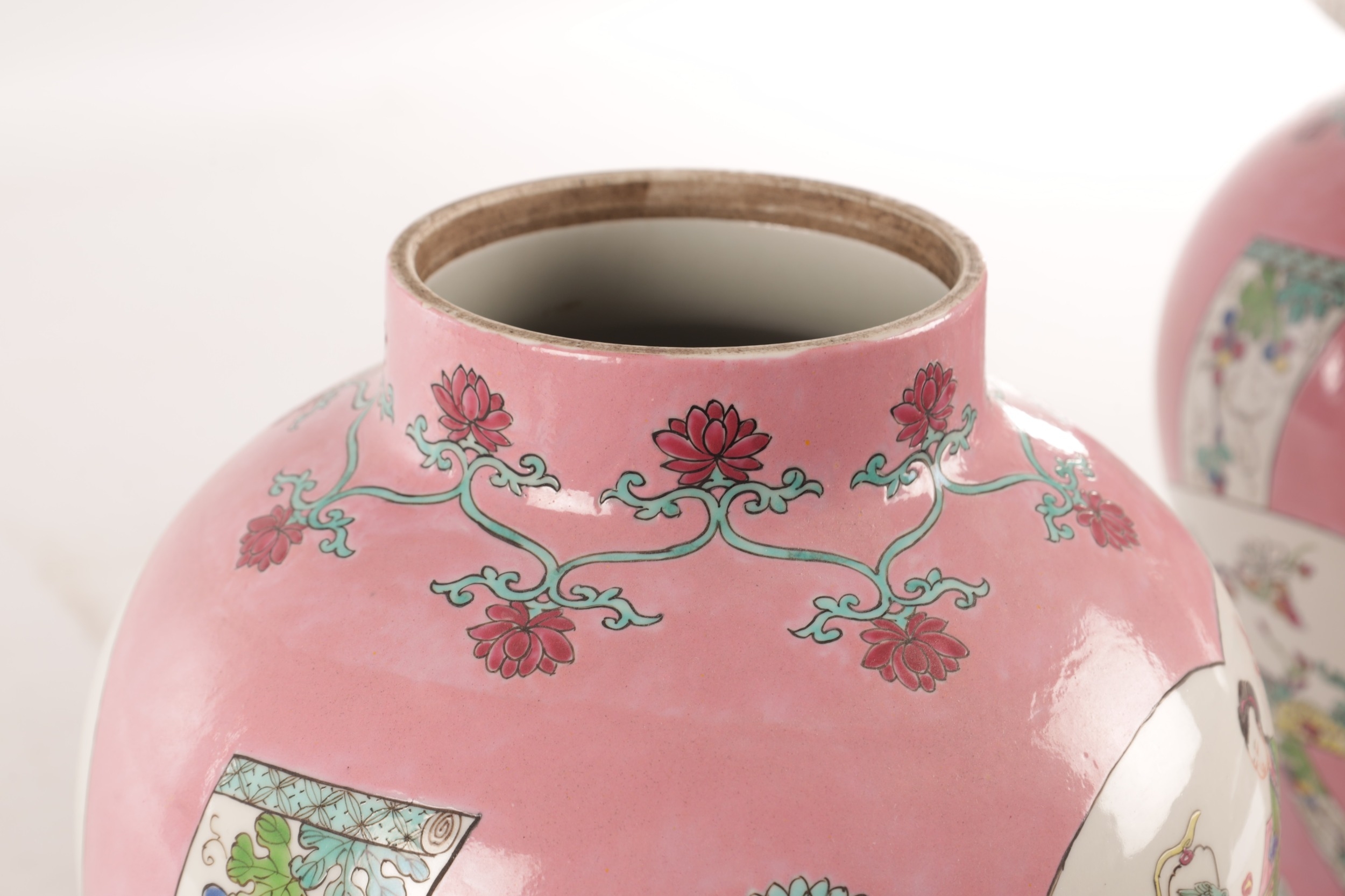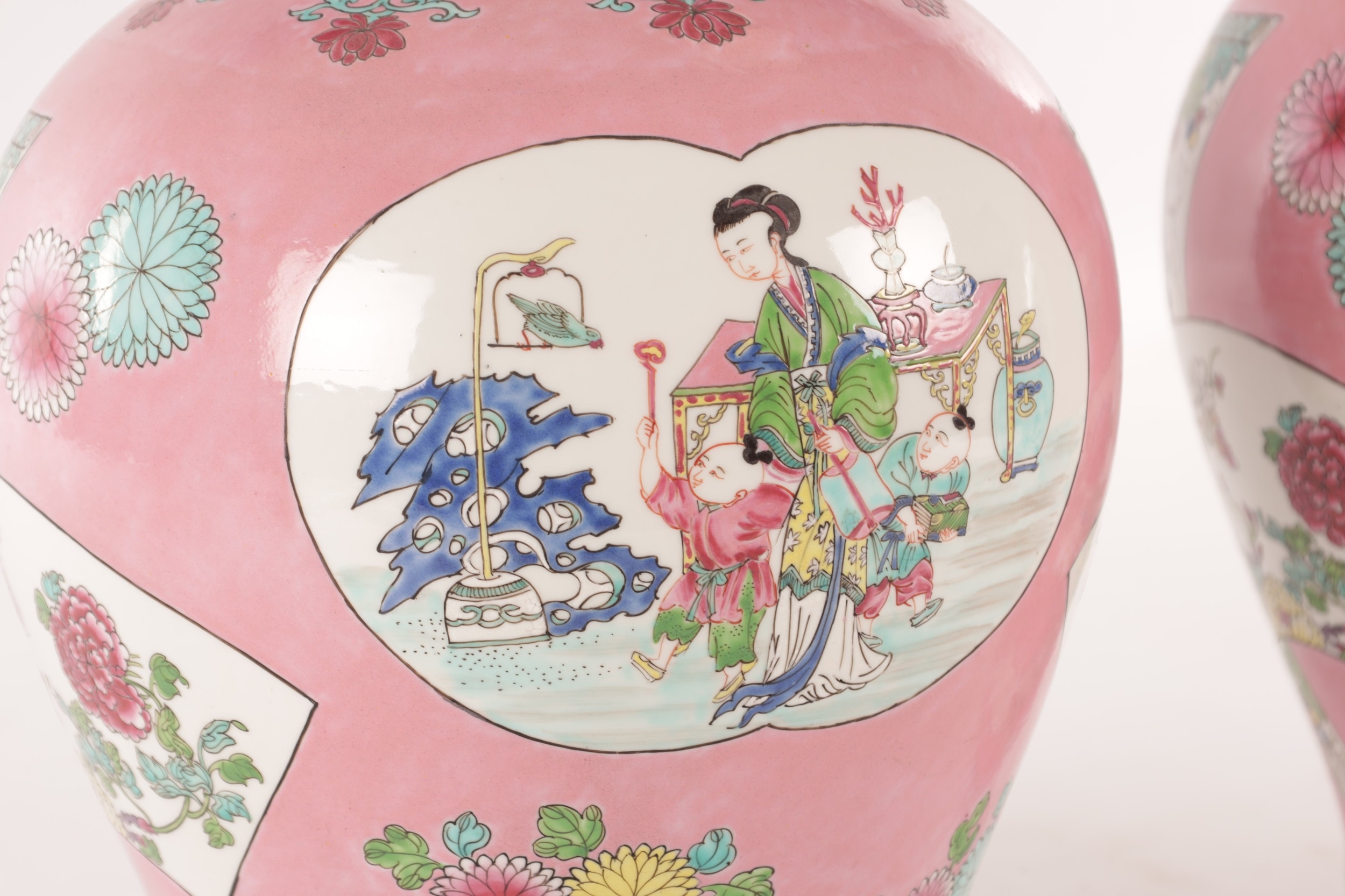 A PAIR OF CHINESE FAMILLE ROSE PINK GROUND BALUSTER VASES with panelled figural garden scenes and floral designs - marked beneath (34cm high)