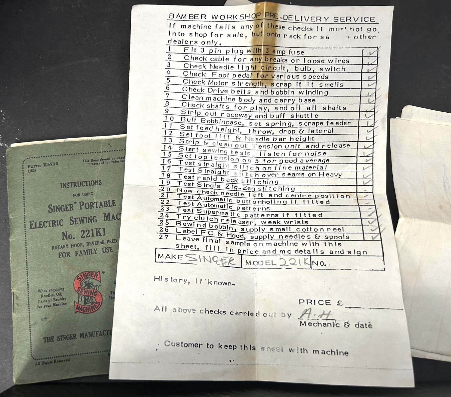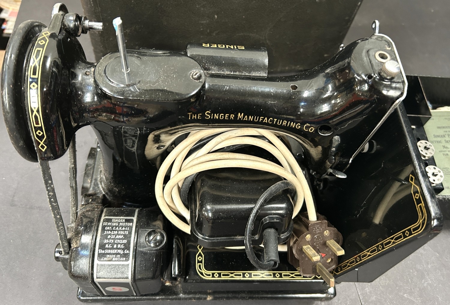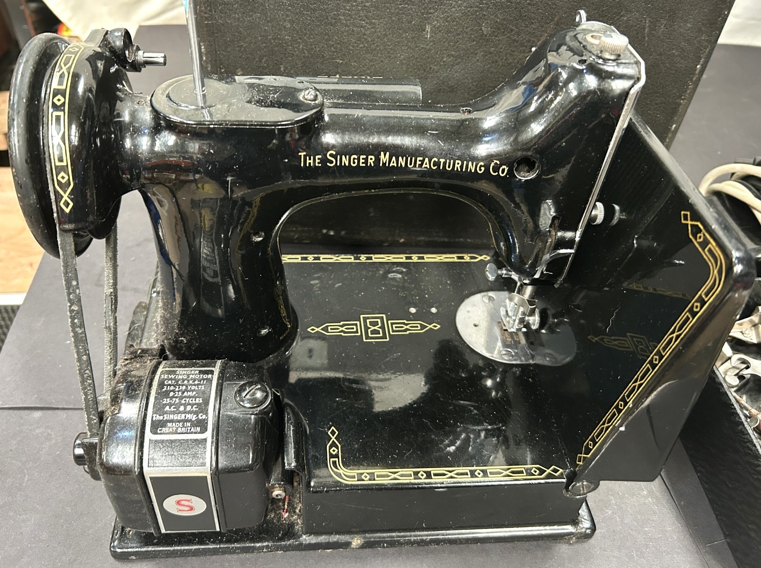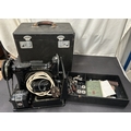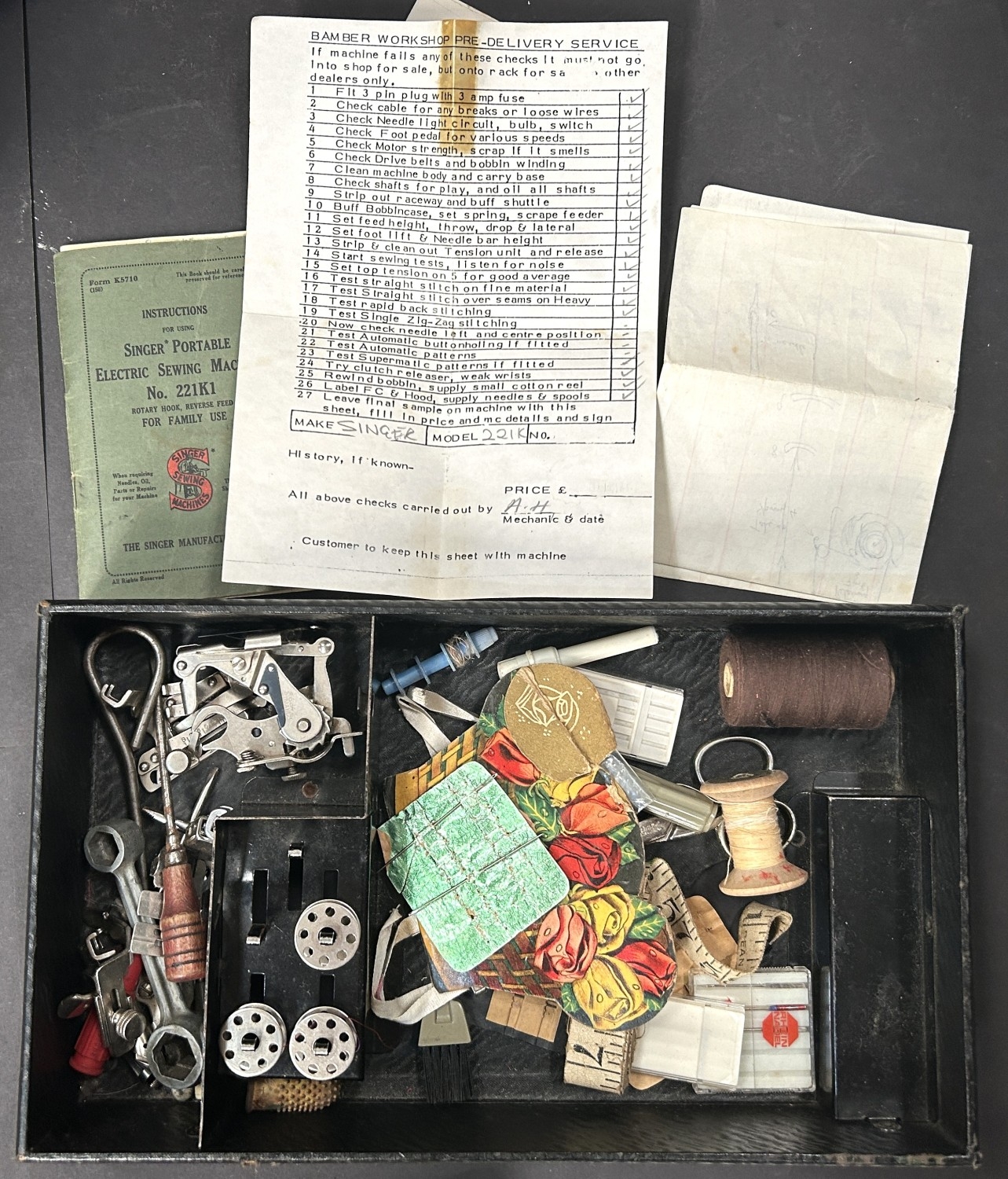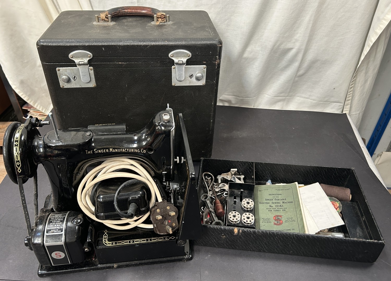 An early 20th century cased Singer 221K sewing machine with accessories.