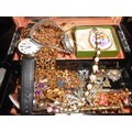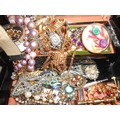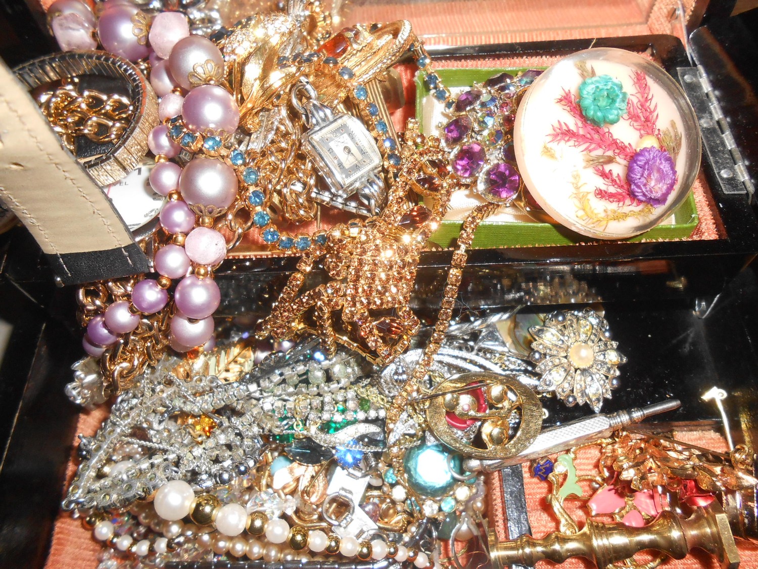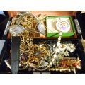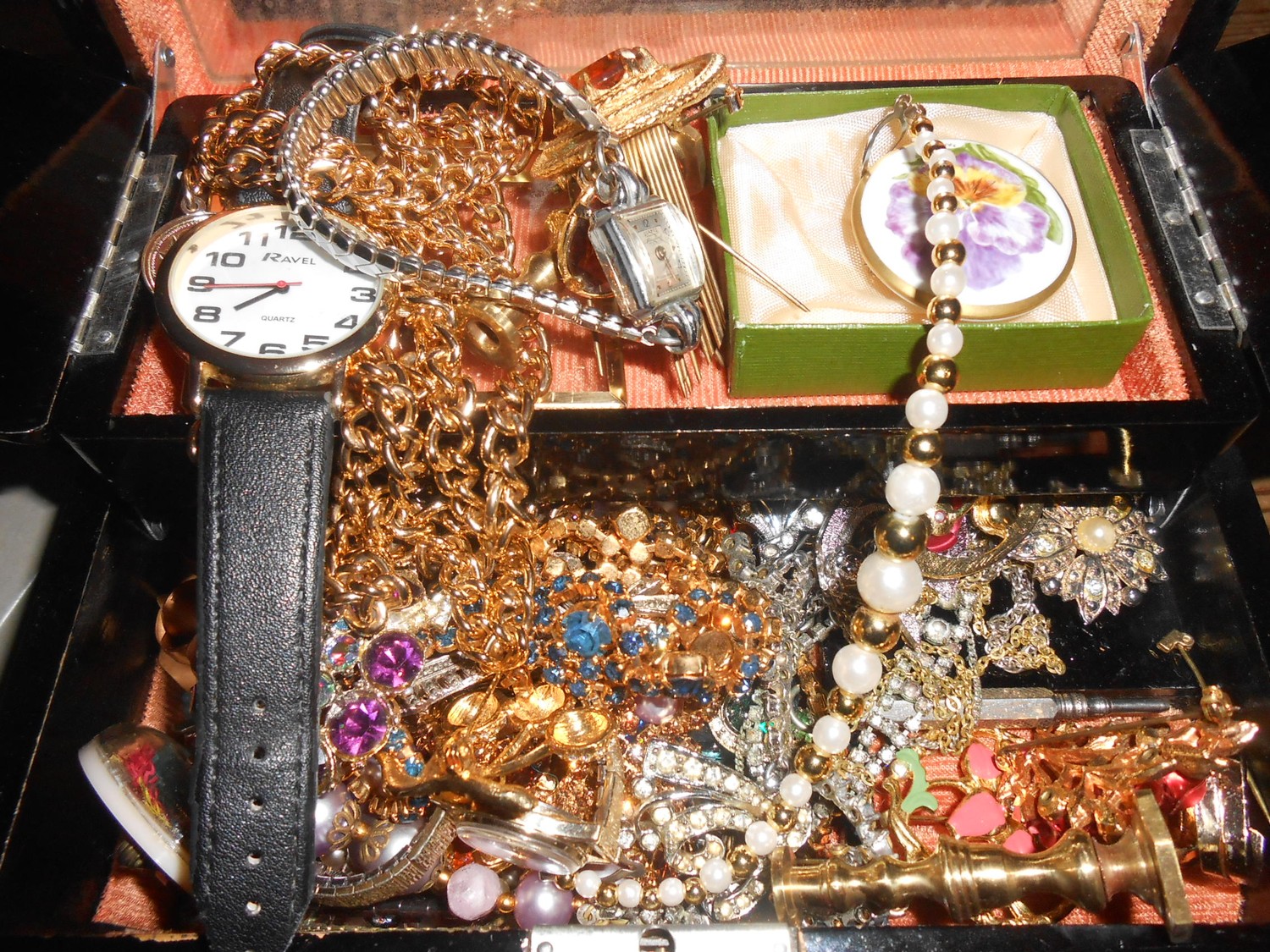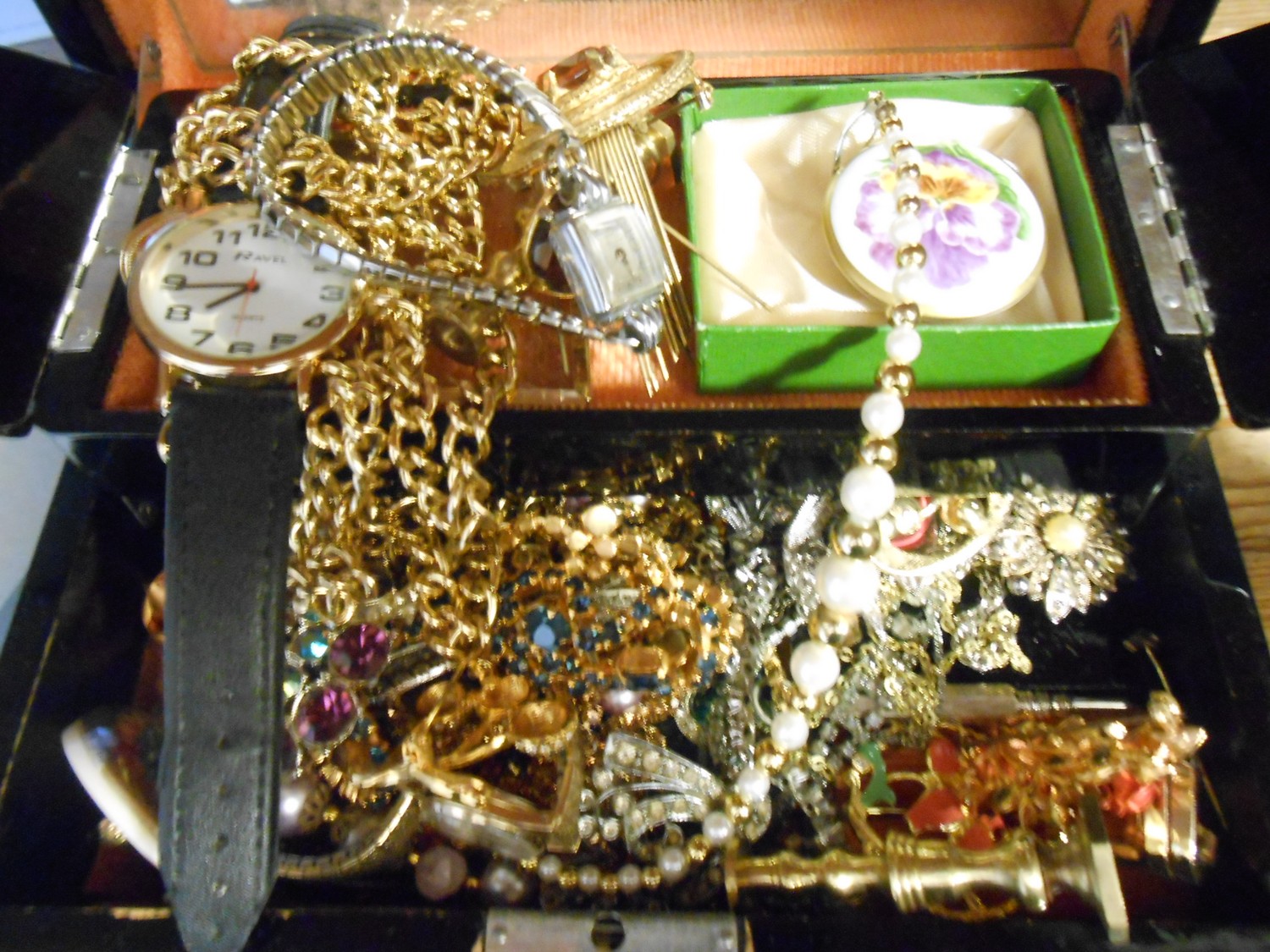 A black painted jewellery box decorated in the Oriental taste containing a selection of costume jewellery including necklaces, dress watches, brooches, a pair of miniature brass candlesticks etc..