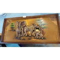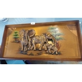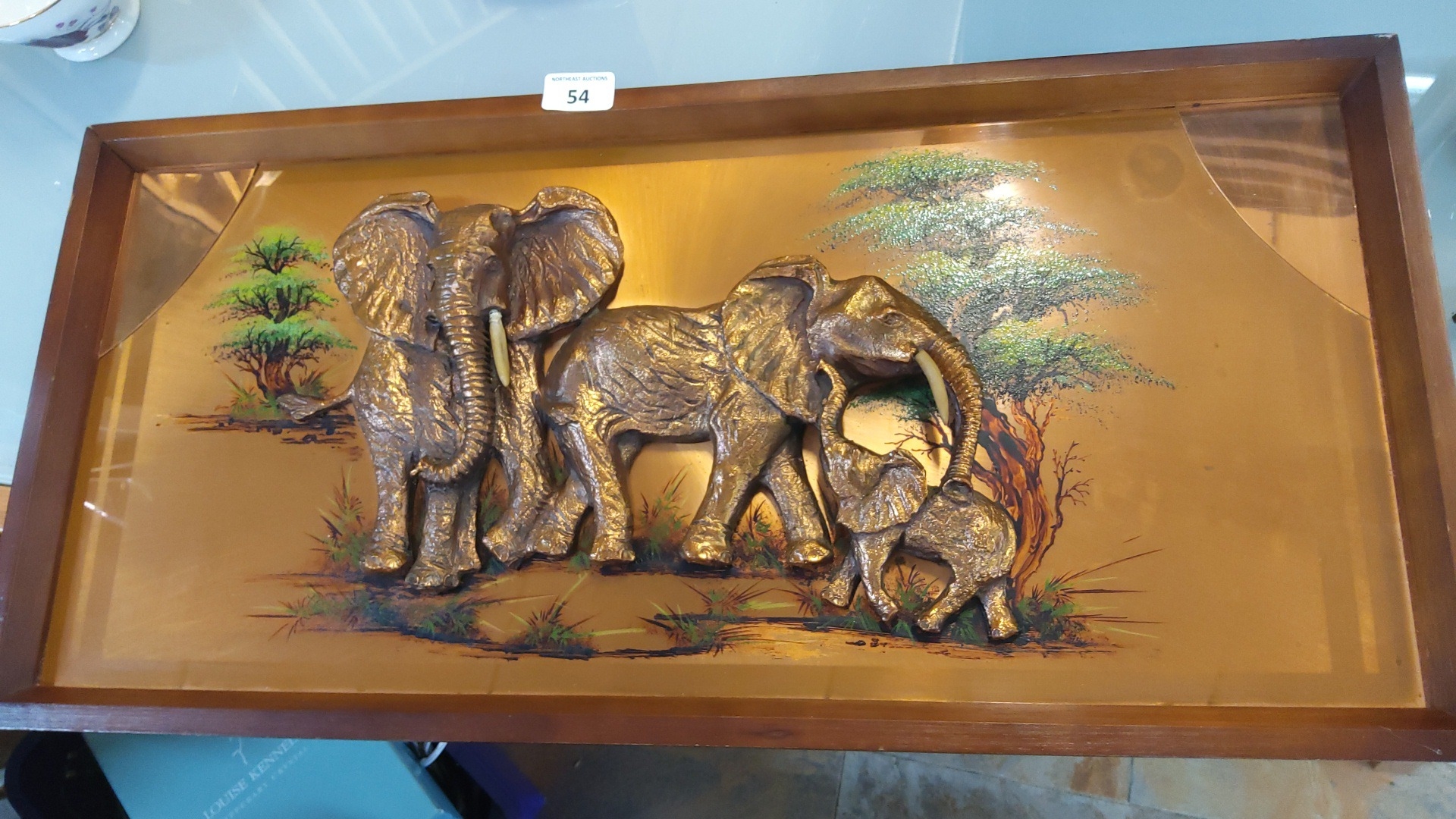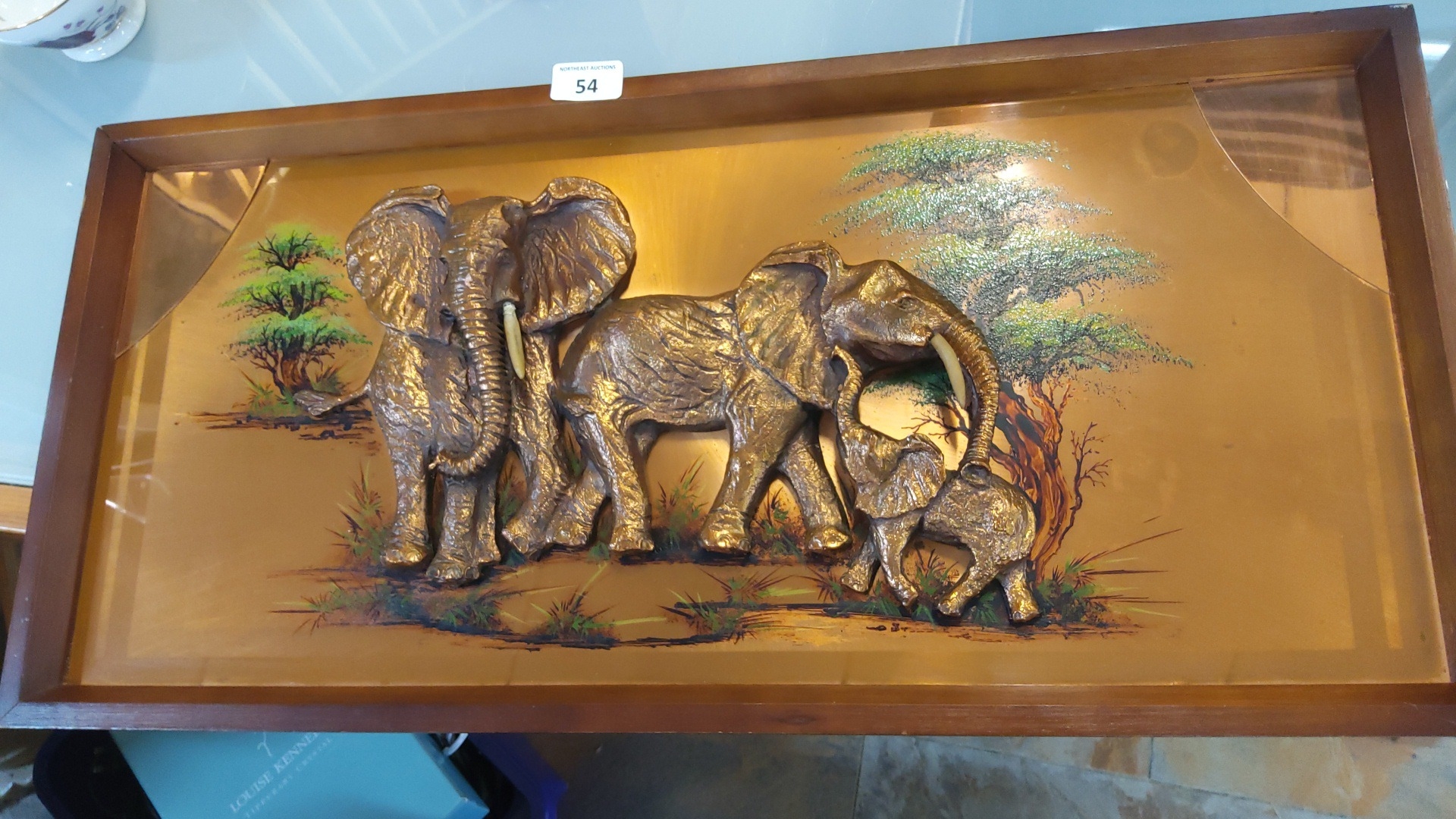 Wall-mounted shadow-box diorama—three-dimensional relief of elephants in gilt-toned metal with ivory-coloured tusks, set before a painted savannah landscape, within a rectangular frame.