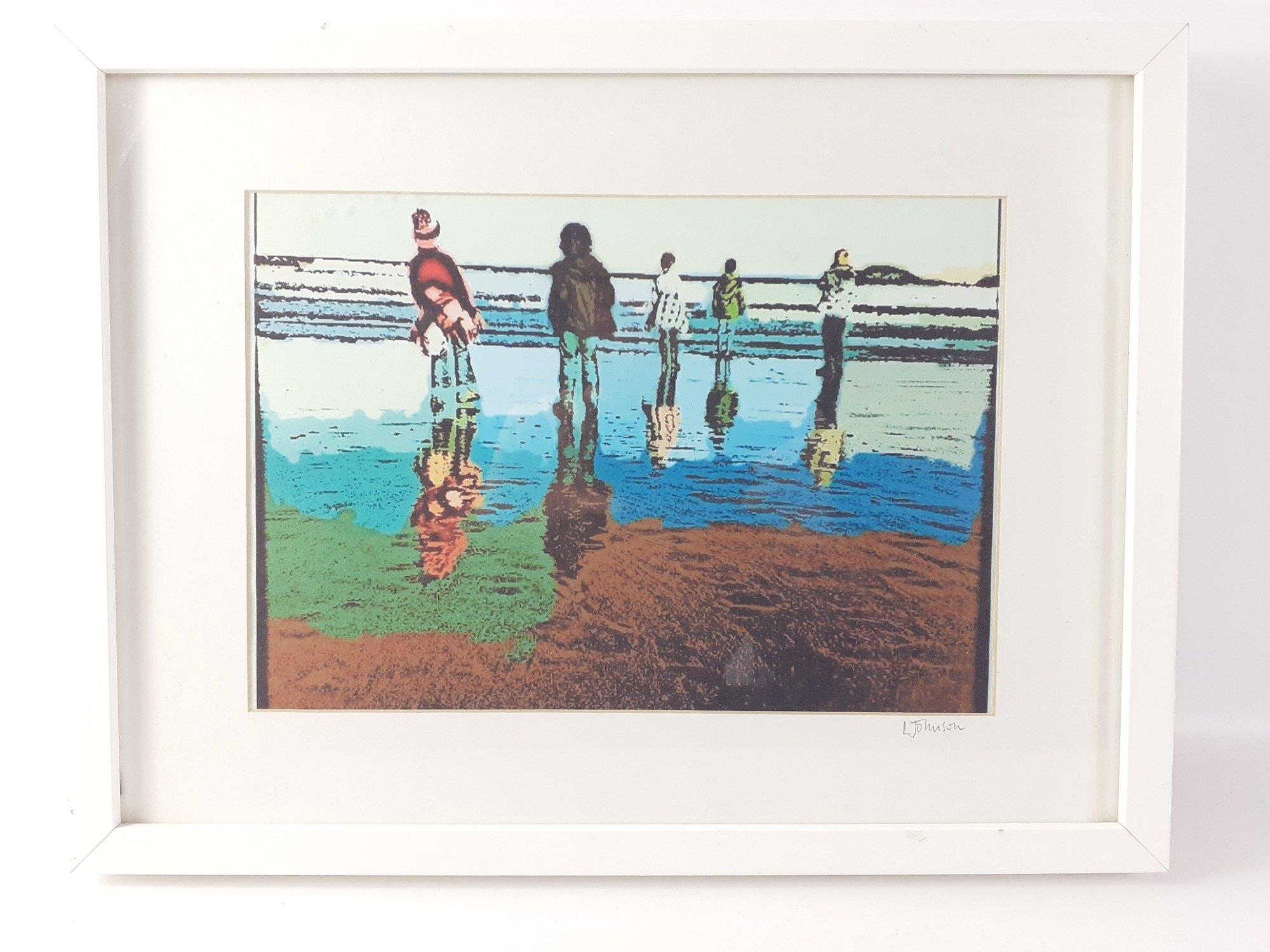 An original work of art by a SCOTTISH BORDERS ARTIST, LESLEY JOHNSON depicting 5 figures on a beach gazing out to sea. Artwork measures approx. 28cm in length x 20cm in height.