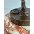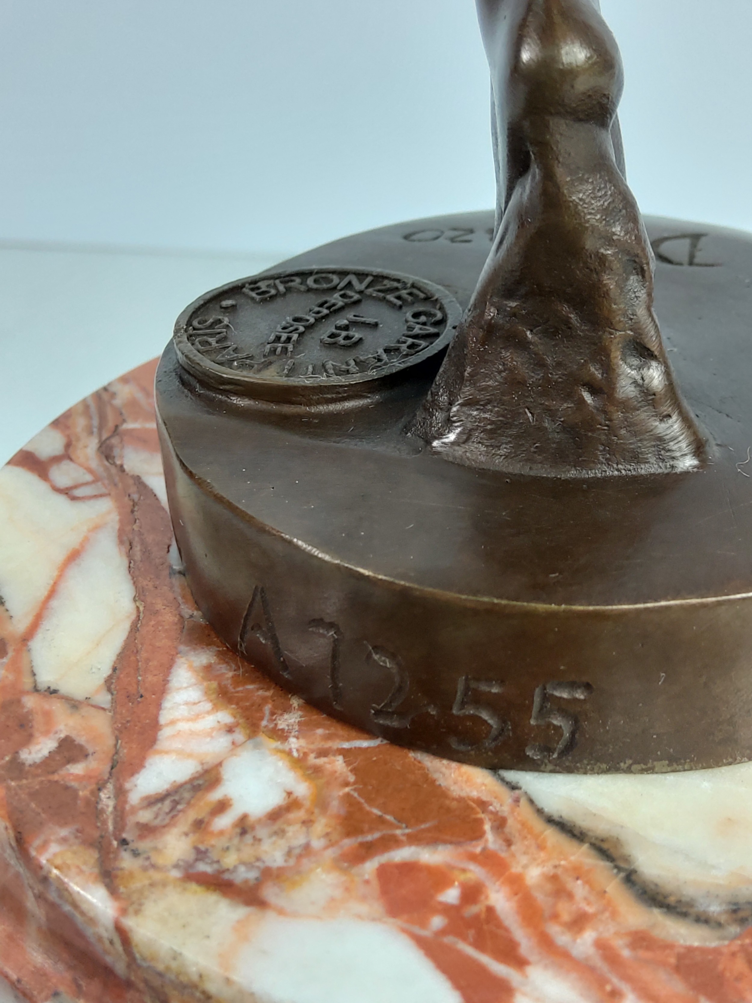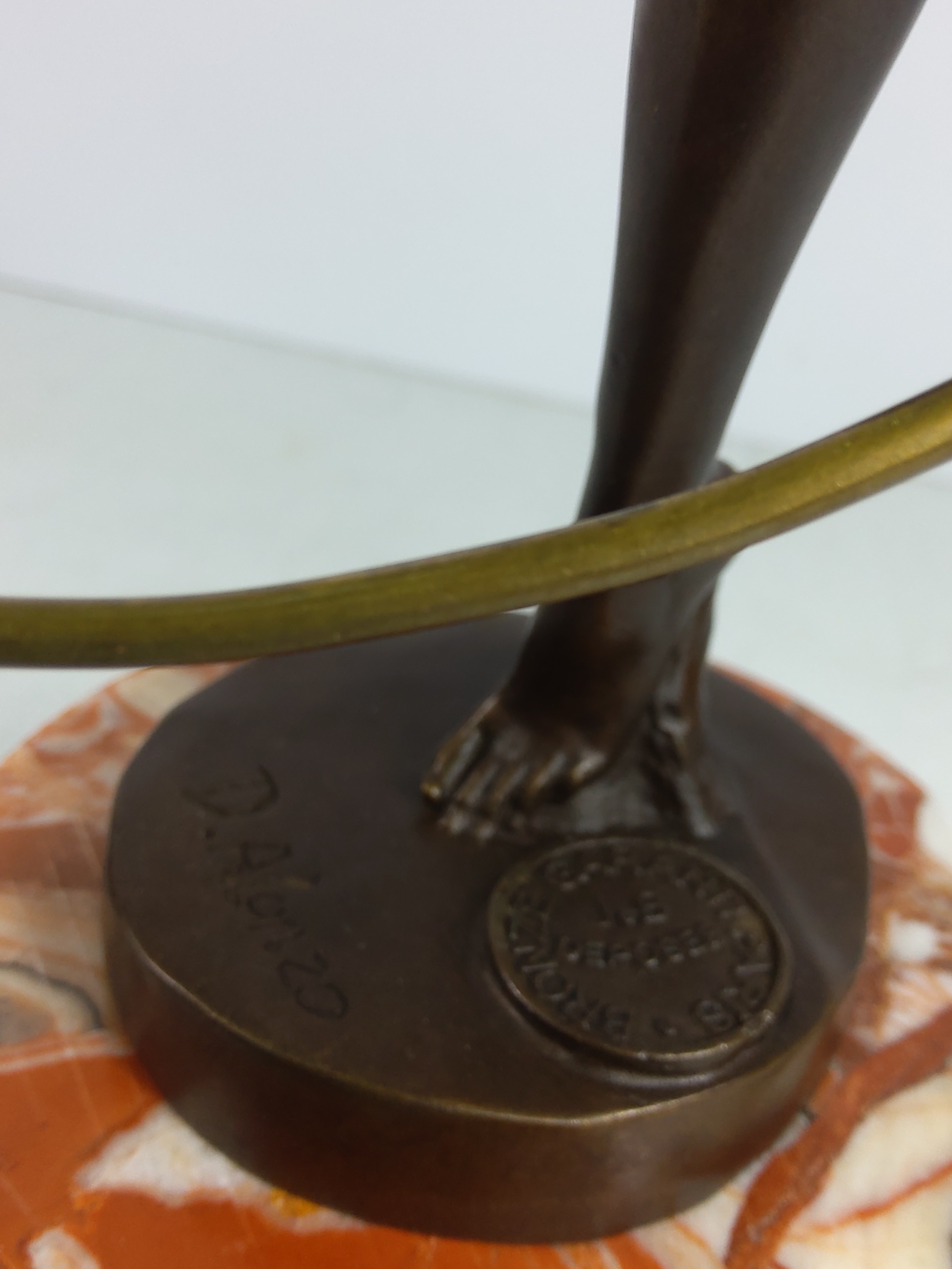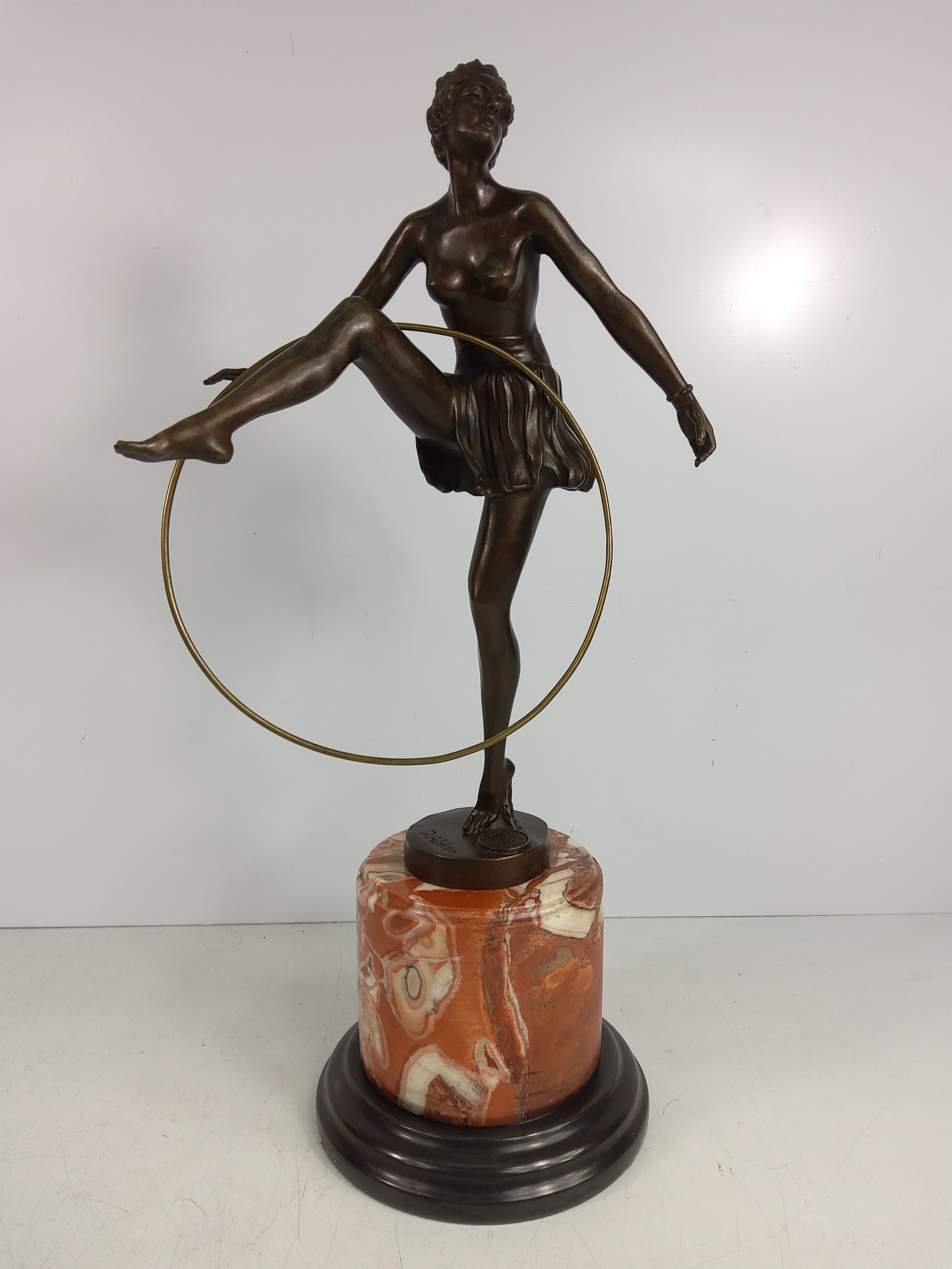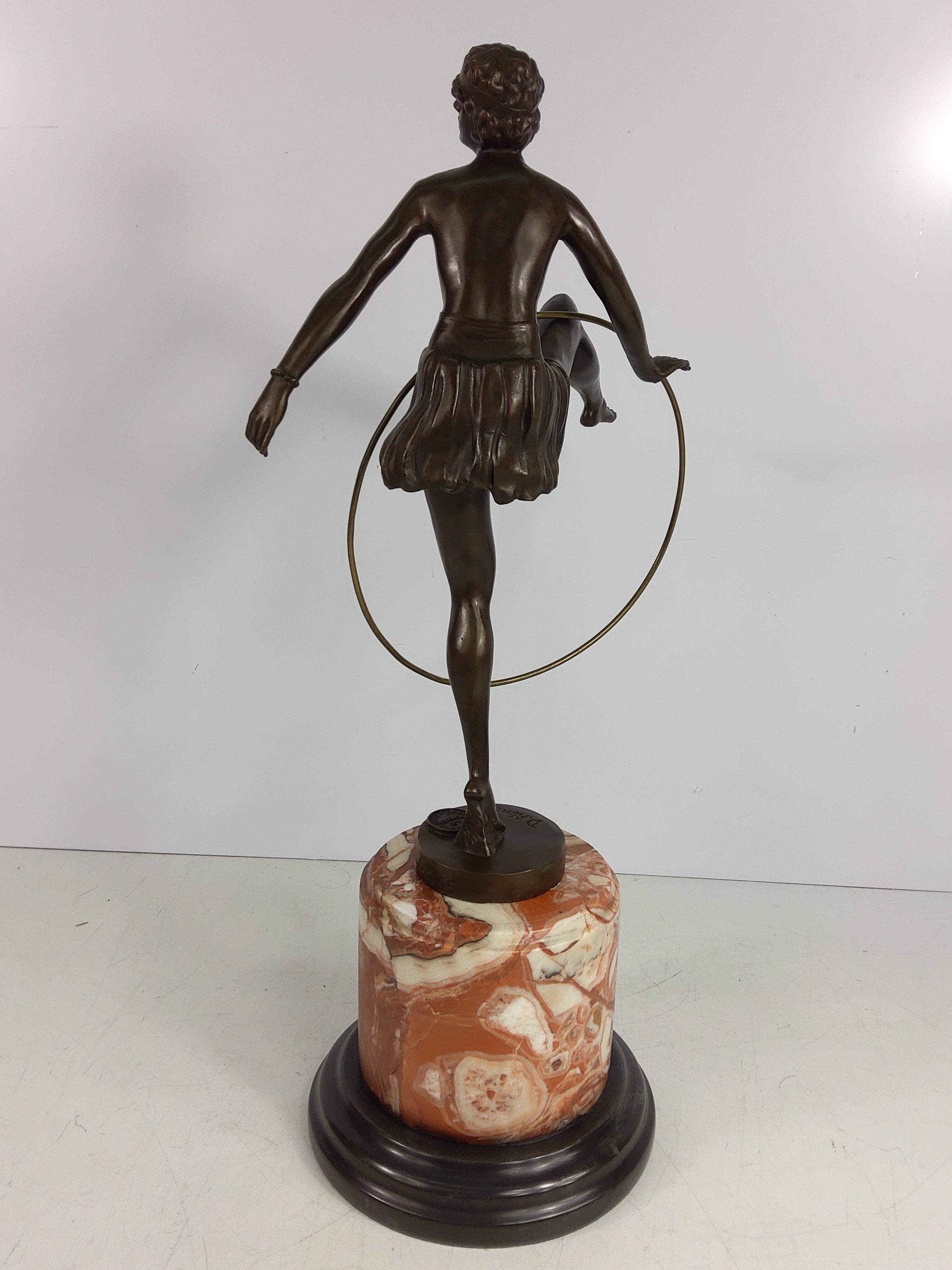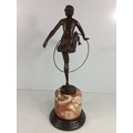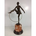 Cast bronze figure of a dancing lady with hoop on marble base, 48cms in height
