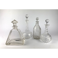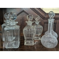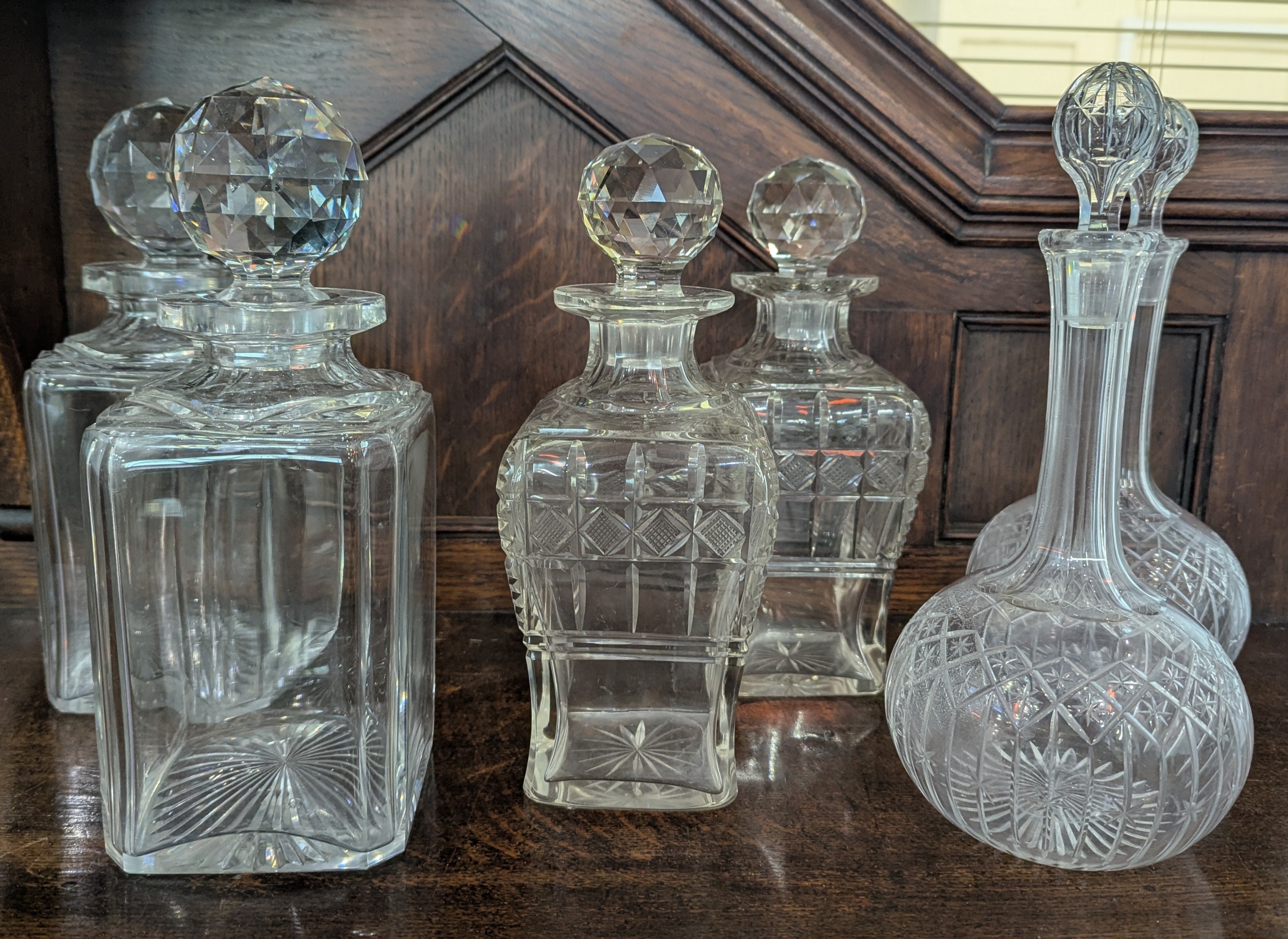 Three pairs of glass decanters comprising a pair of cut glass globe and shaft decanters and stoppers 26cm high, and two pairs of bottle decanters and stoppers (6)