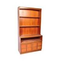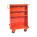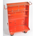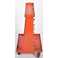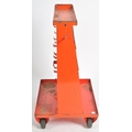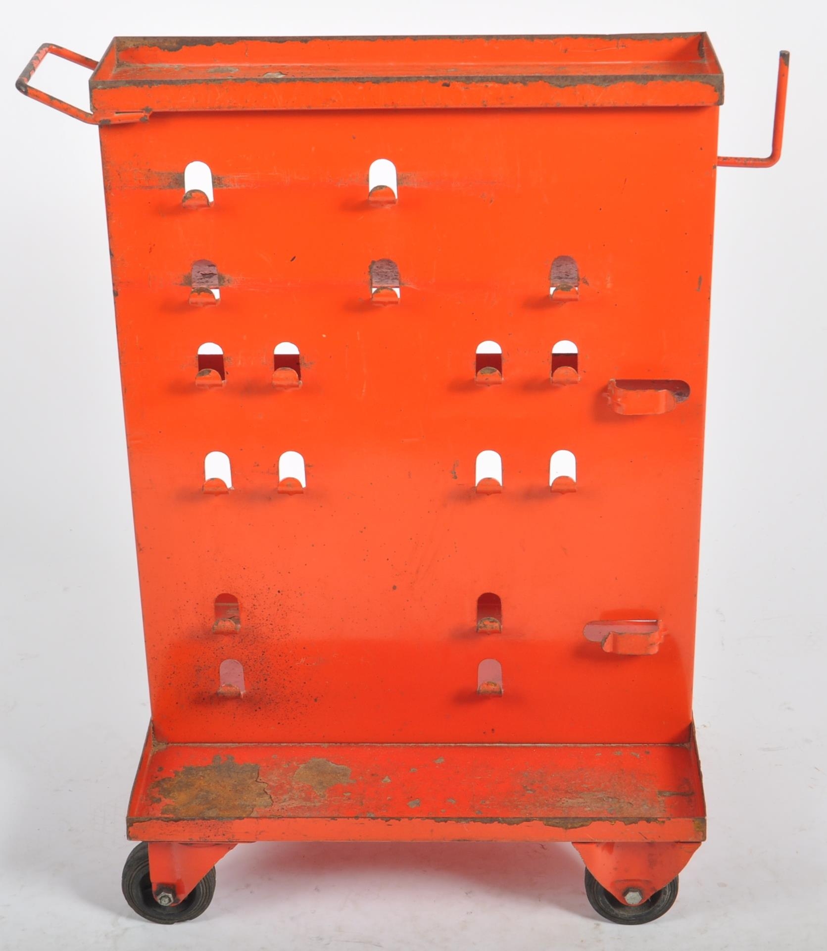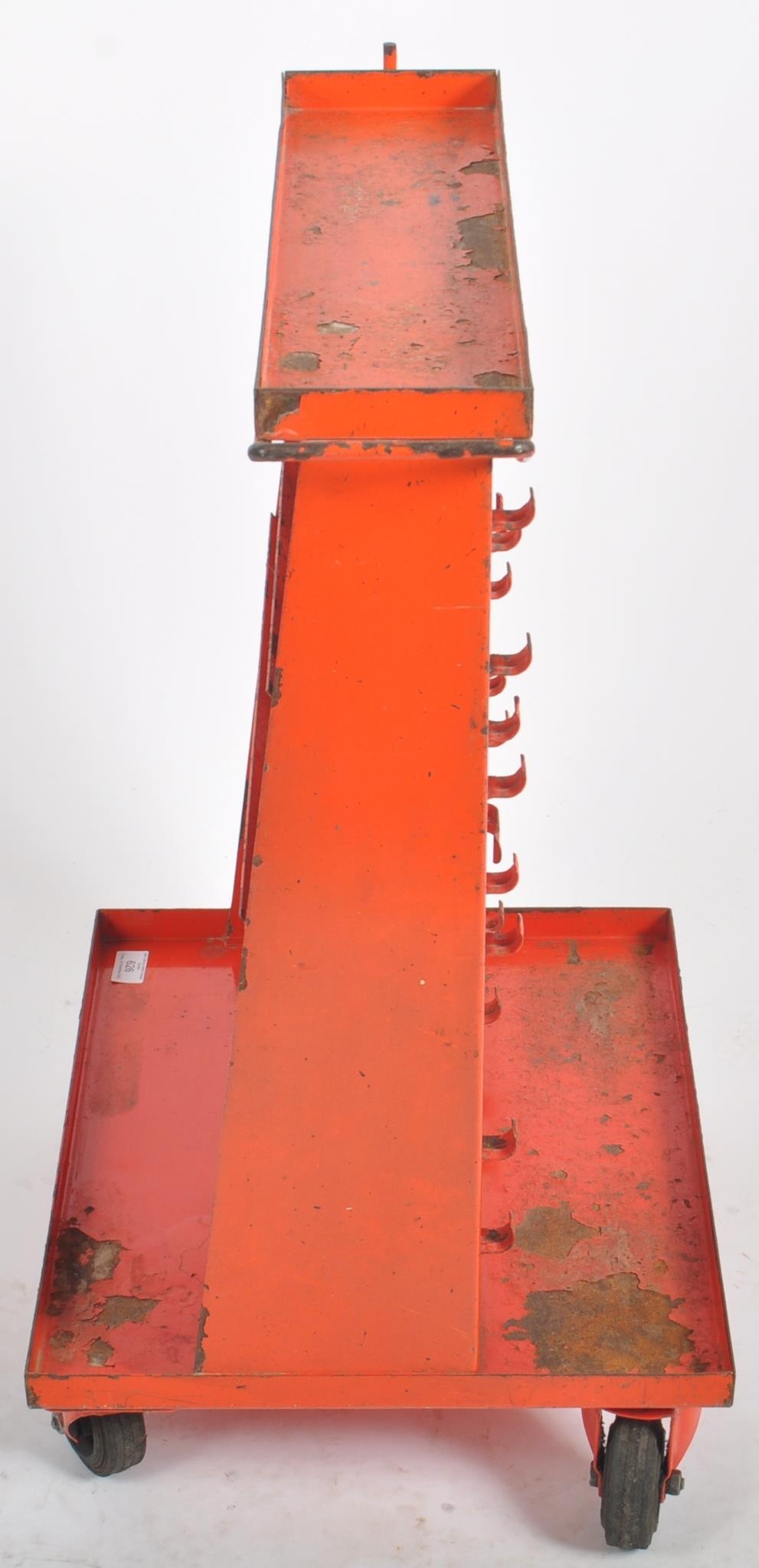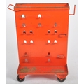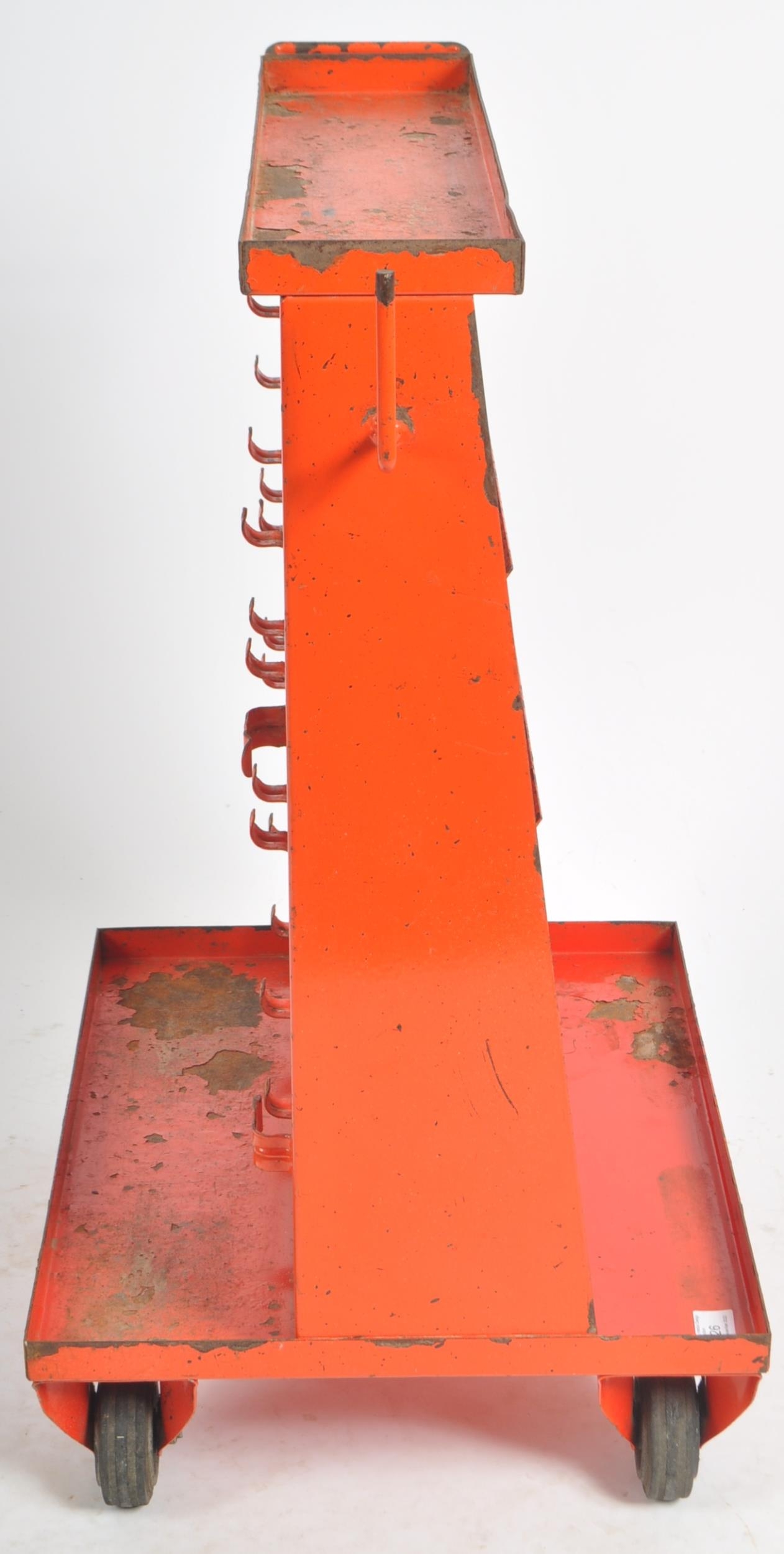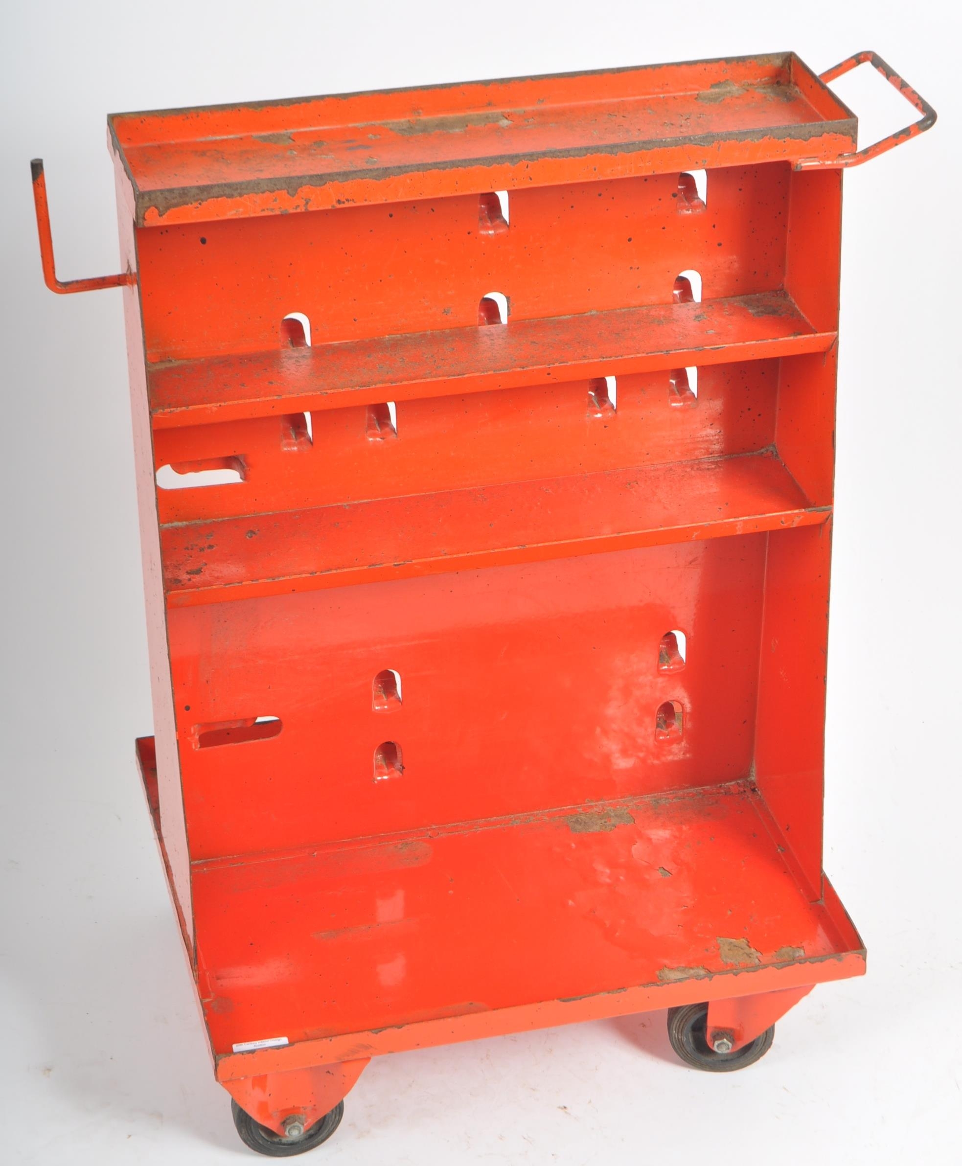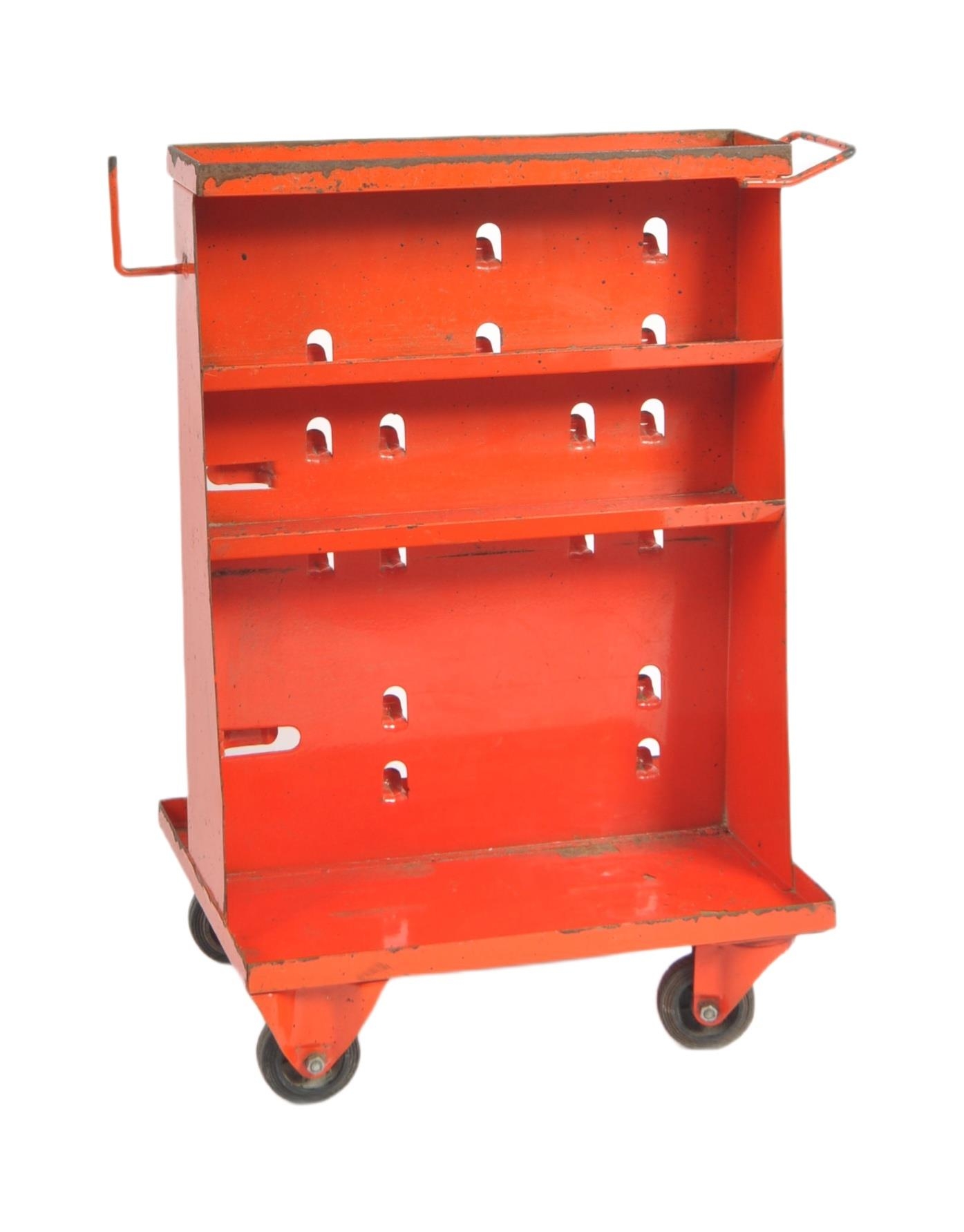 A retro vintage mid 20th Century industrial red metal engineering trolley / tool trolley. Angular A frame form with wheeled lower tier. Red painted enamel finish. Measures approx; 71cm x 47cm x 39cm.