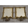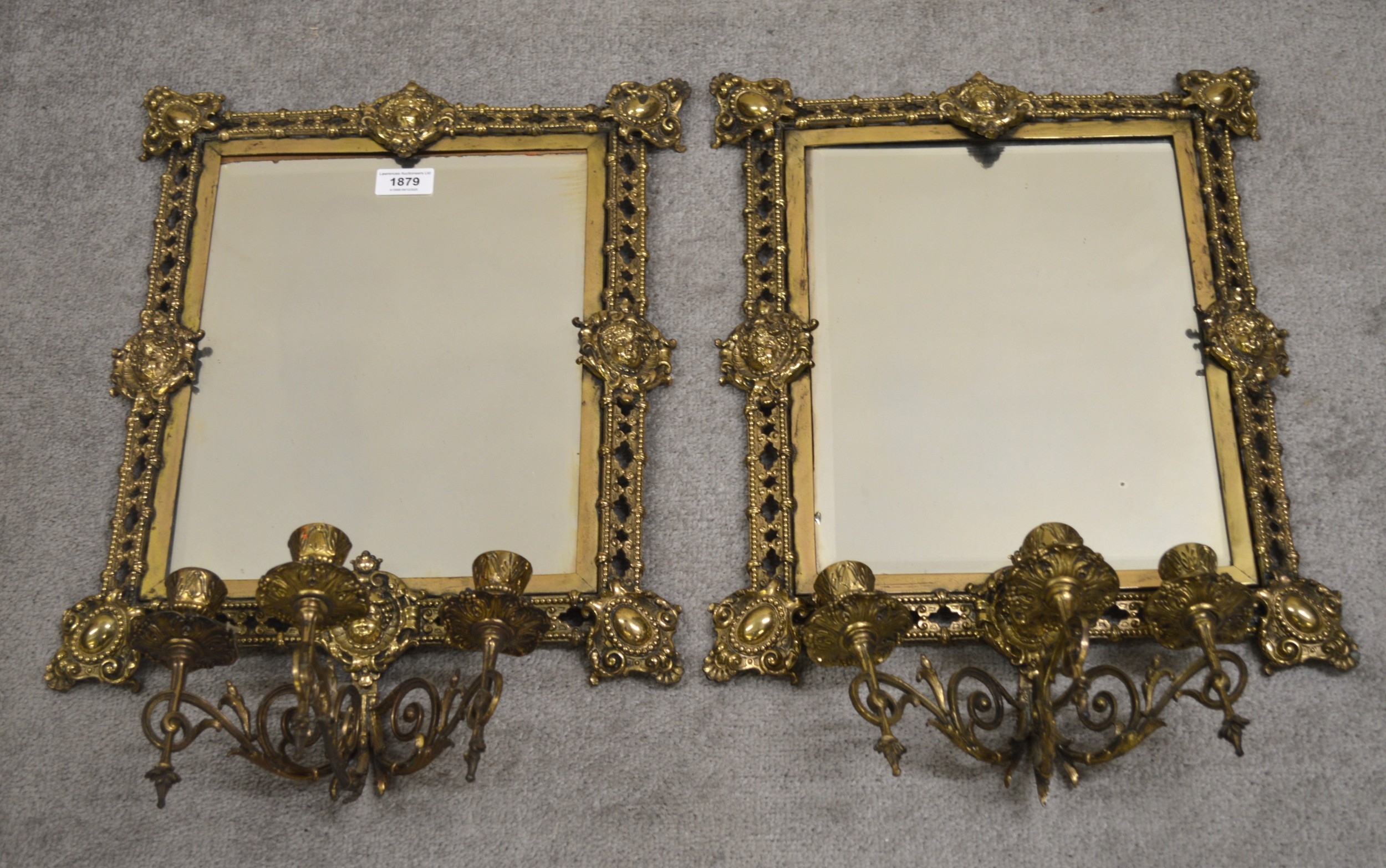 Pair of Victorian gilt brass three branch mirror inset girandoles