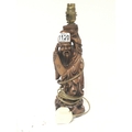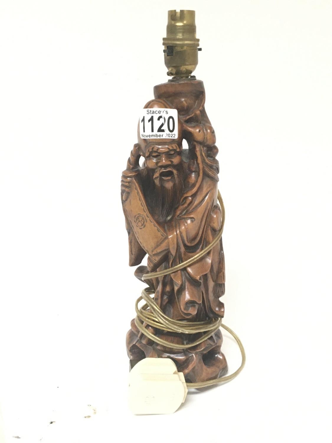 A carved hardwood oriental sage figure converted to a lamp. Height 36cm