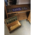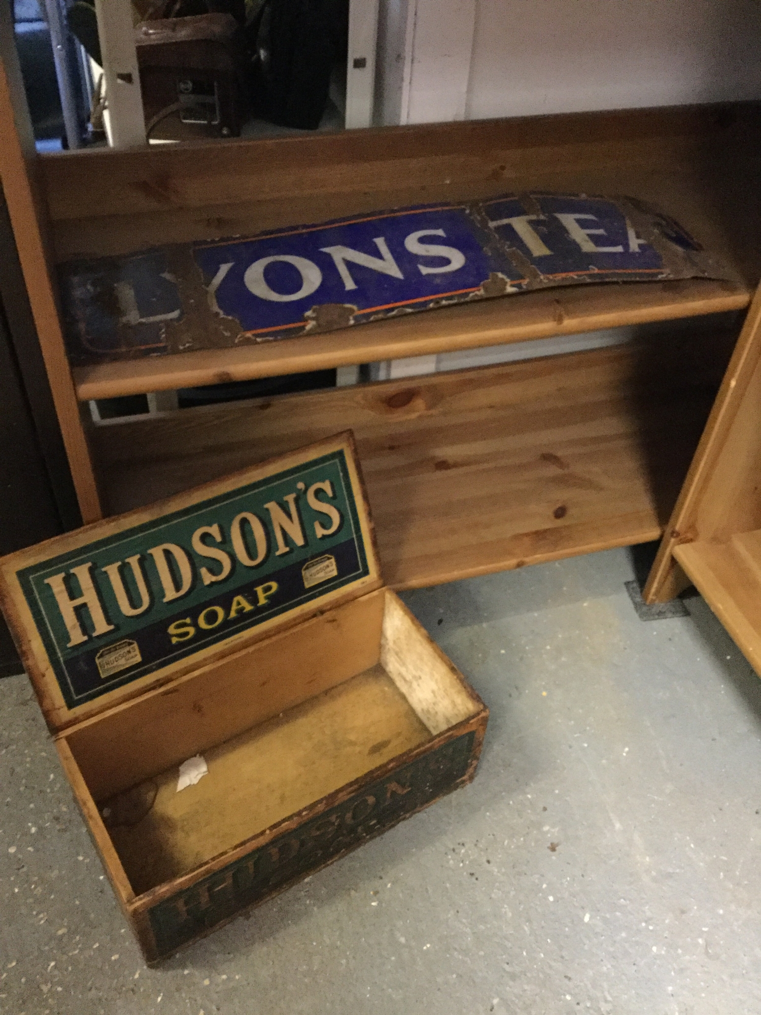 A vintage Lyons enamel tea sign, together with a Hudsons soap box -