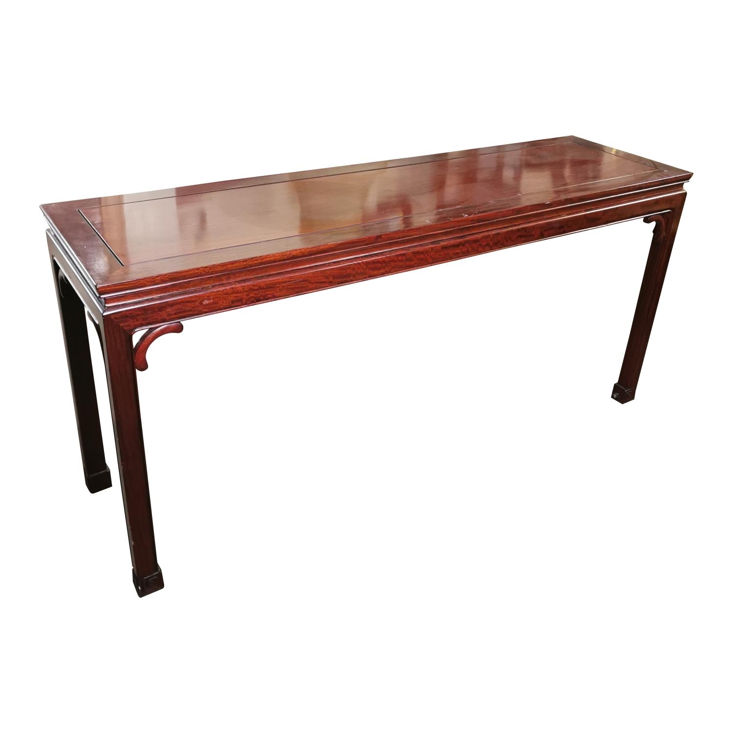 Good quality mahogany side table on square legs {76 cm H x 162 cm W x 46 cm D}.