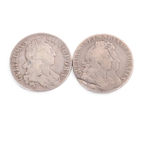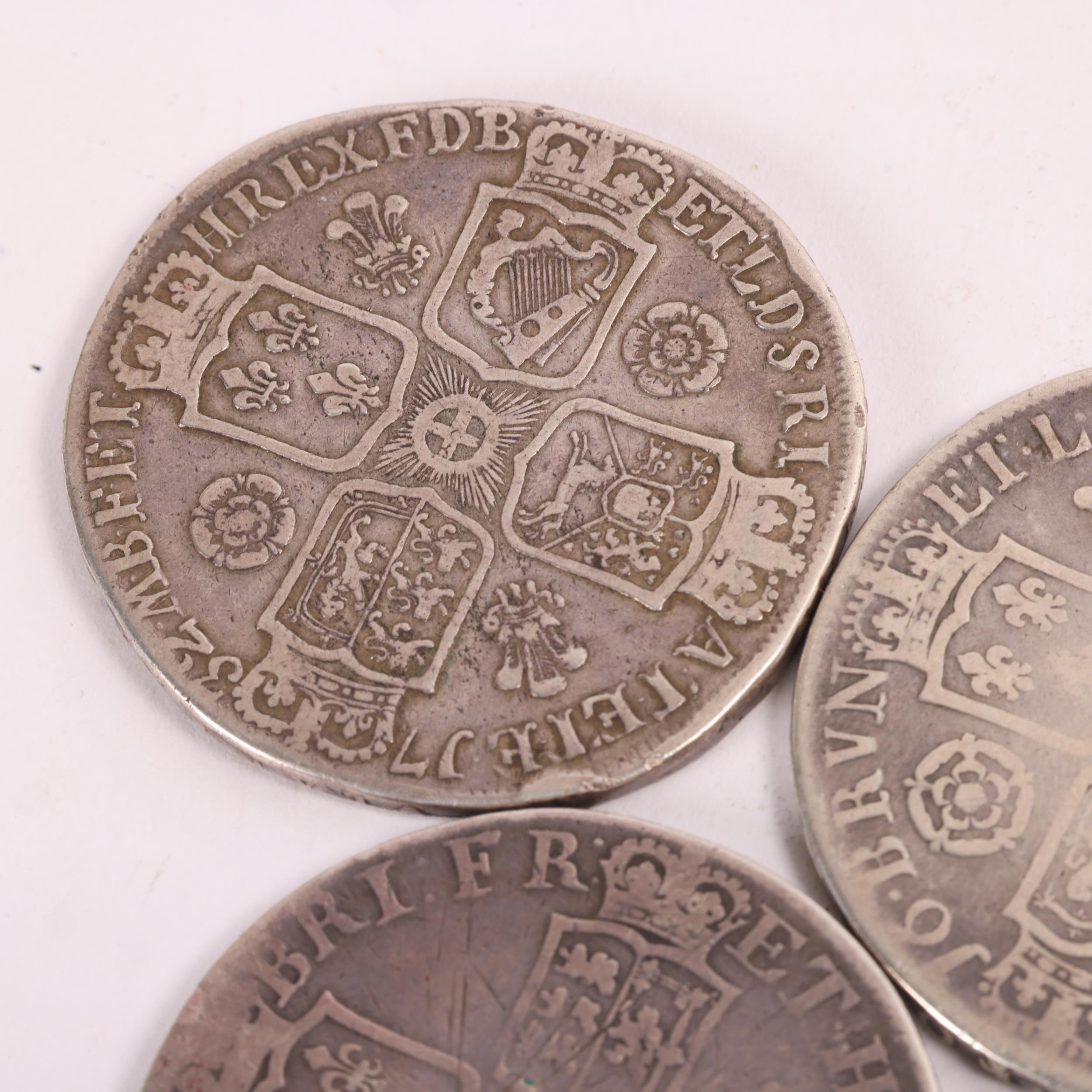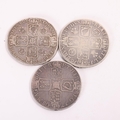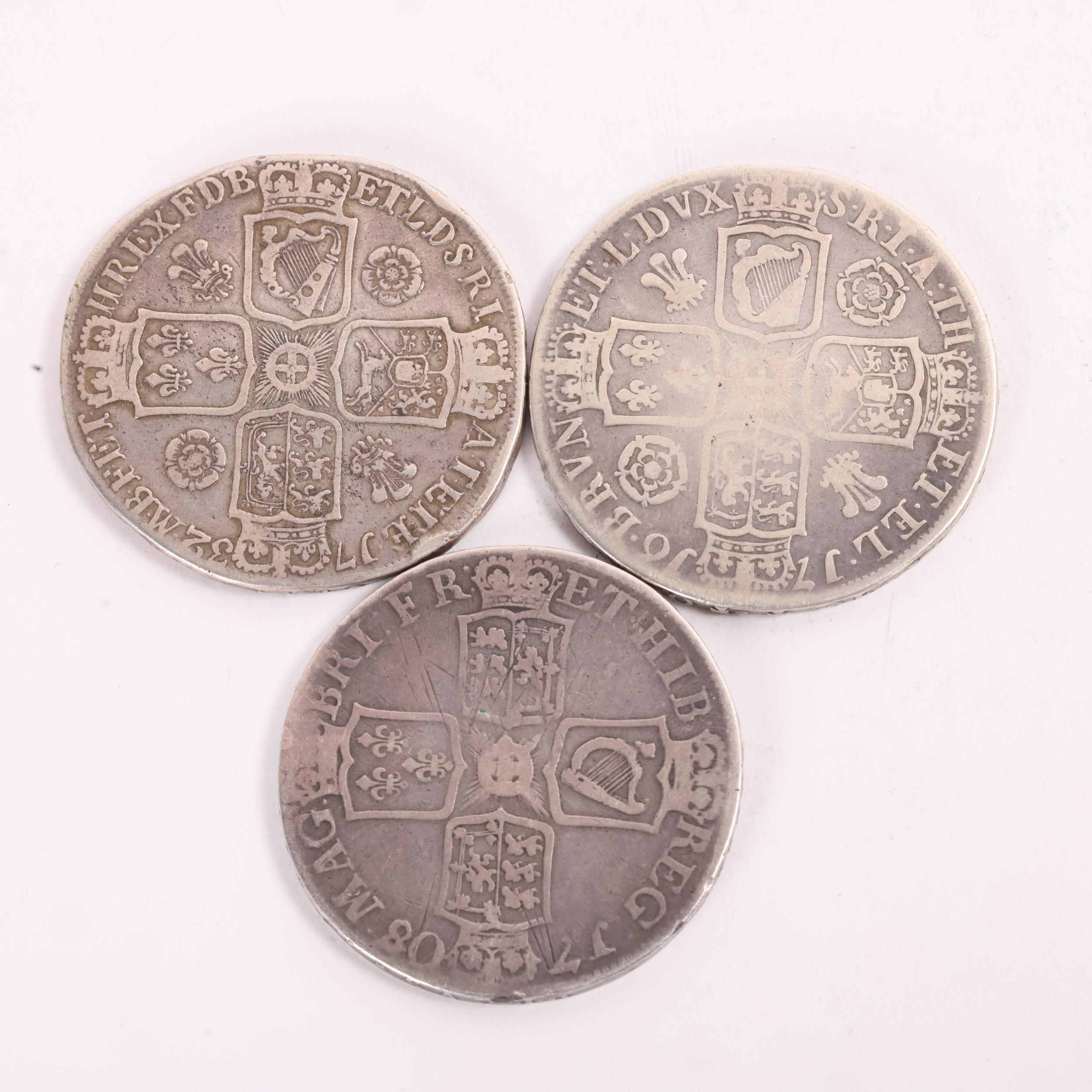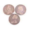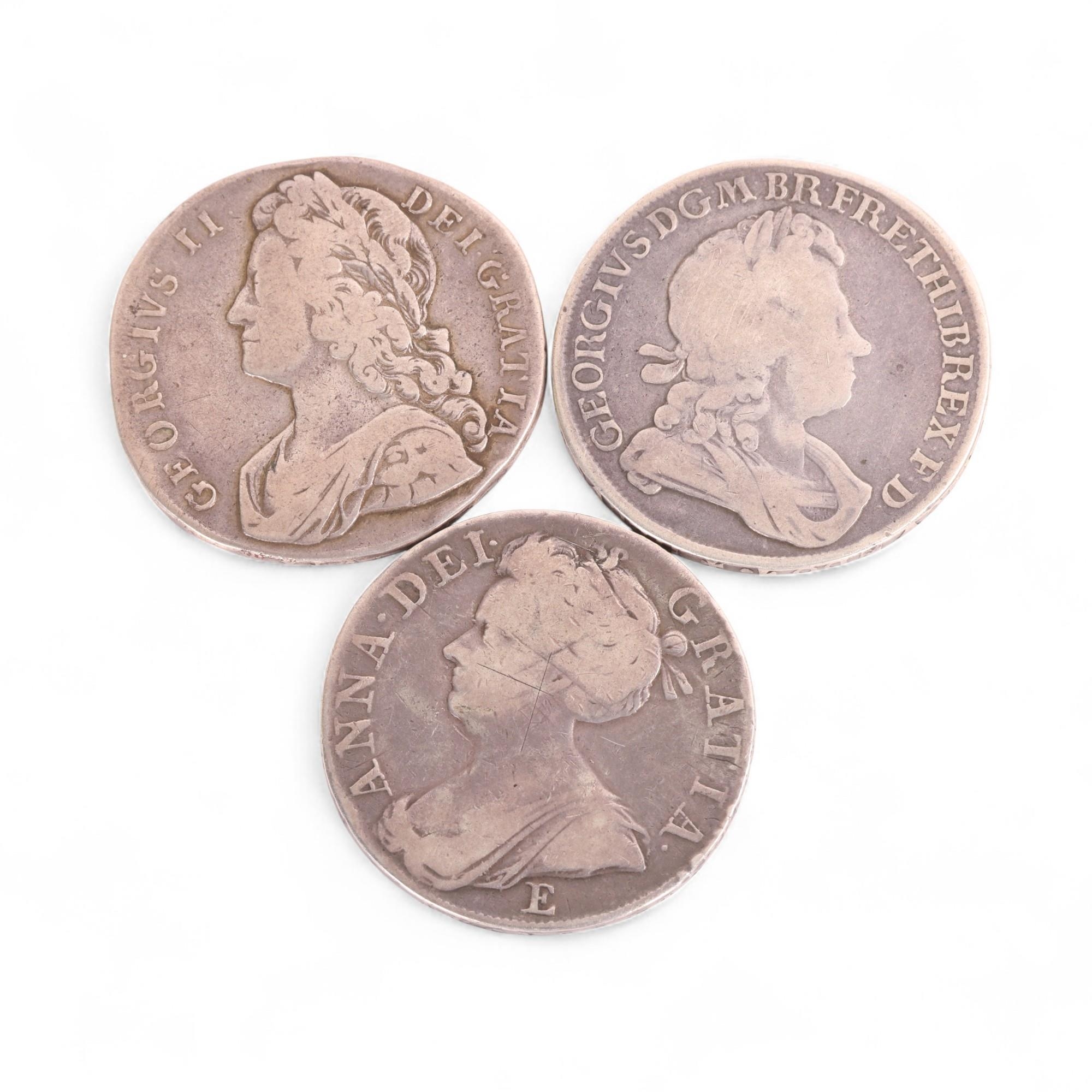 Three English Silver Crown coins, Queen Anne 1708, 29.6g, dia 39mm, George I 1716, 29.2g, dia 39mm, George II 1732, 29.2g, dia 39mm