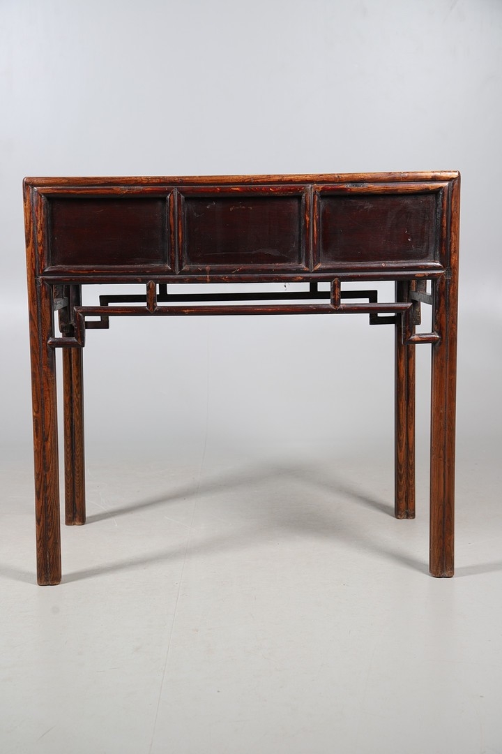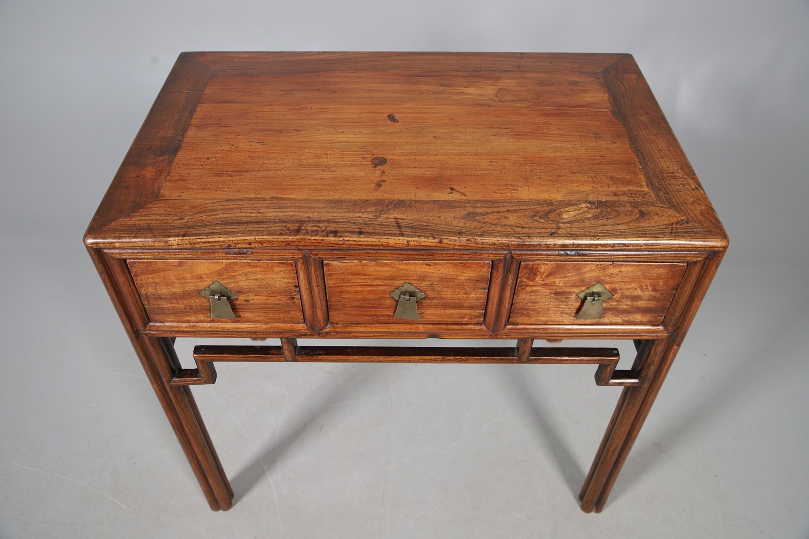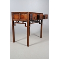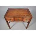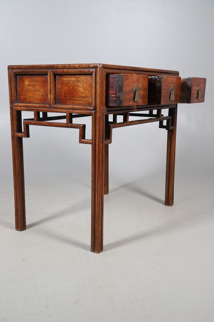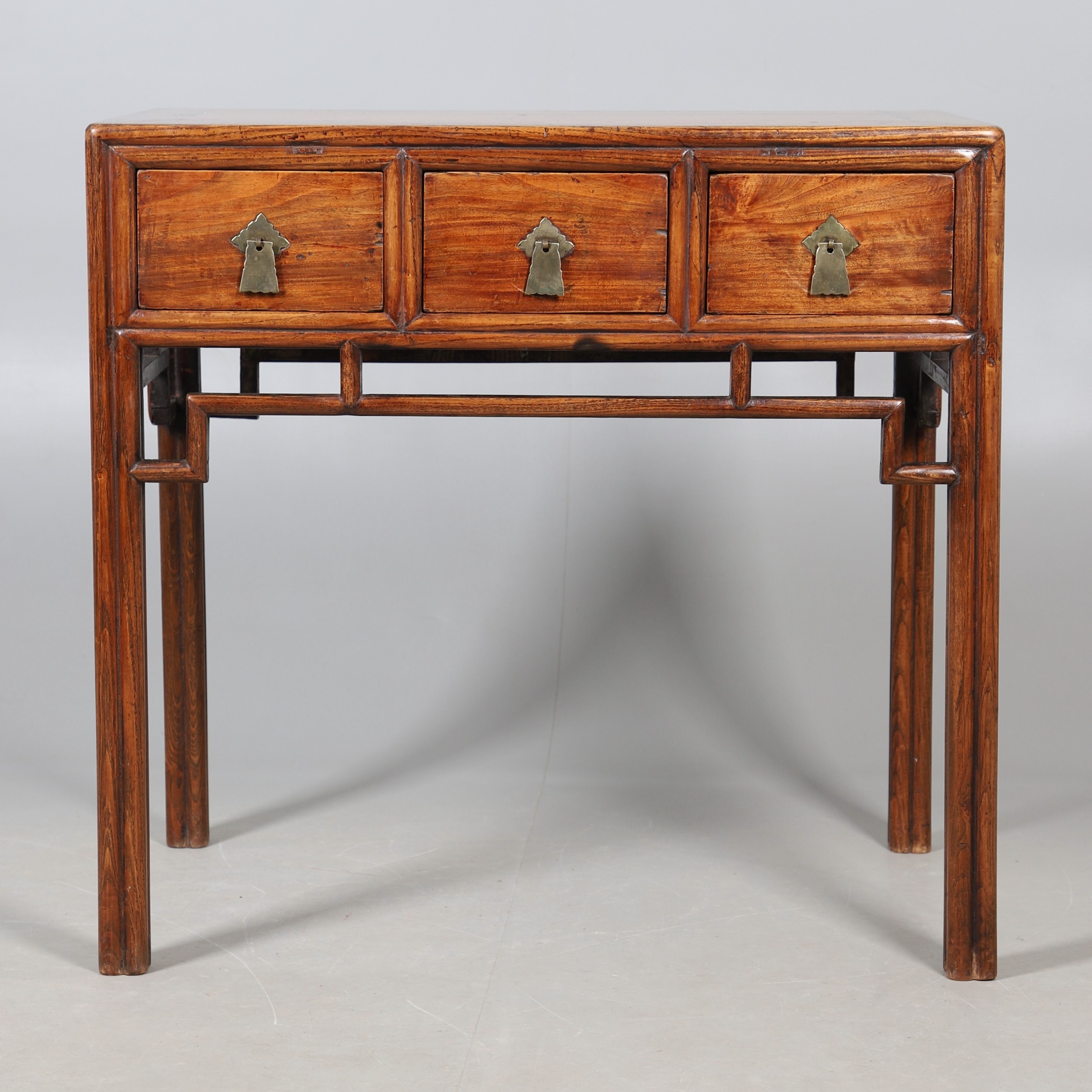 A LATE 19TH/EARLY 20TH CENTURY CHINESE DONGSHAN ELM DESK. with three deep drawers to an open framework apron and framed panelled sides, 82cm, width 87cm, depth 54cm.
