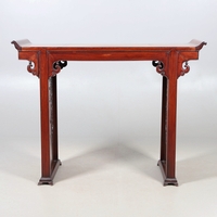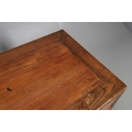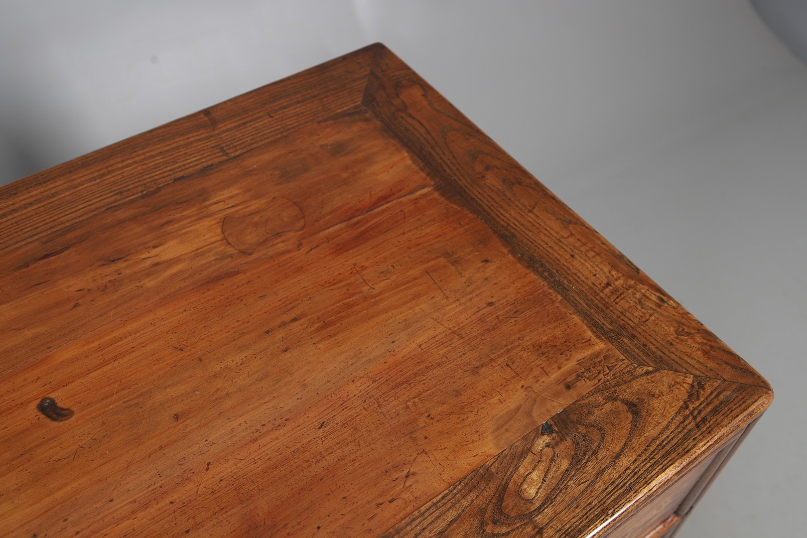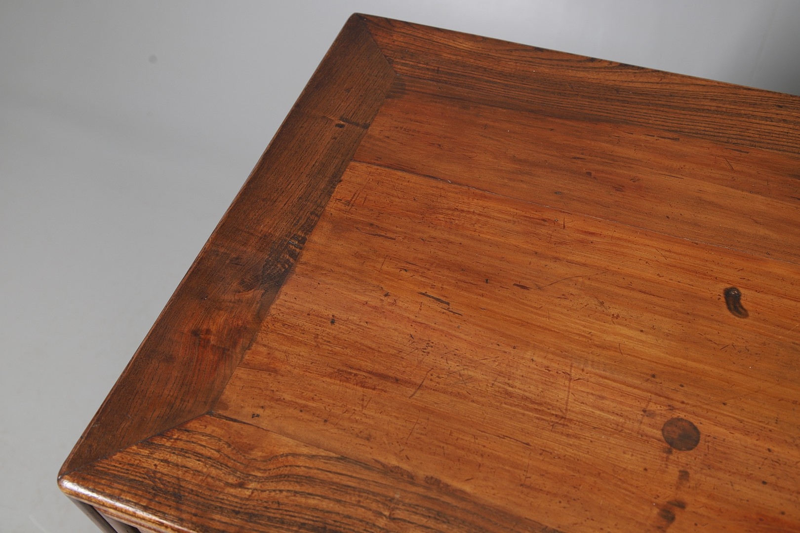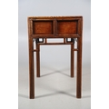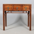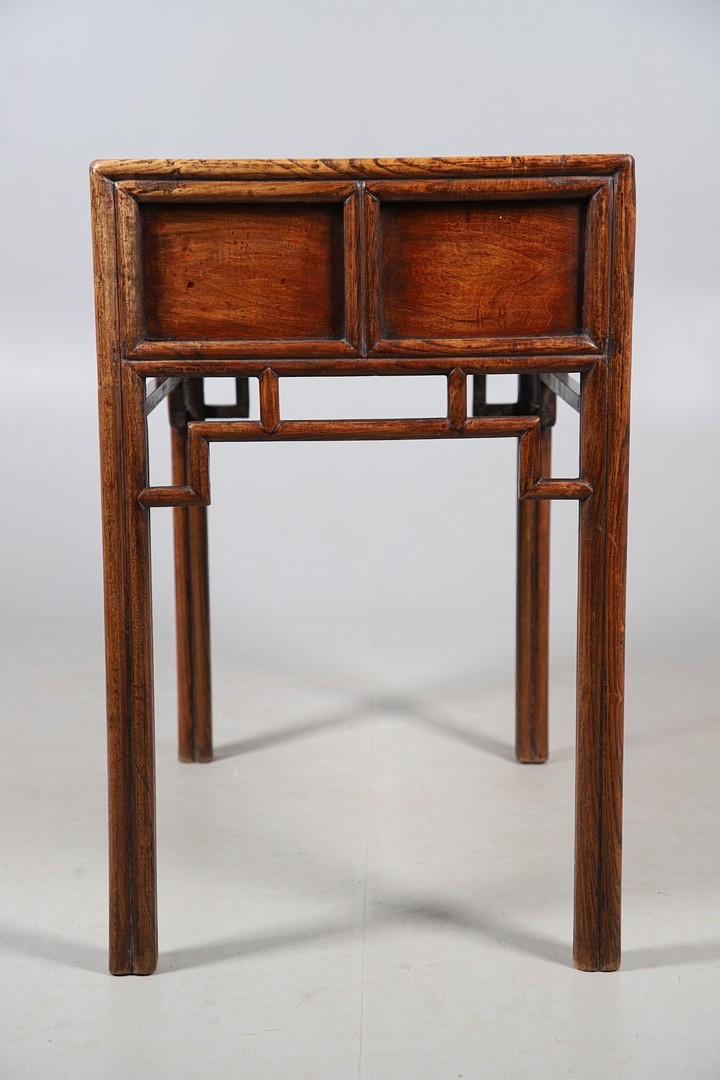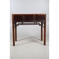 A LATE 19TH/EARLY 20TH CENTURY CHINESE DONGSHAN ELM DESK. with three deep drawers to an open framework apron and framed panelled sides, 82cm, width 87cm, depth 54cm.