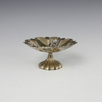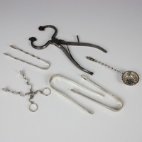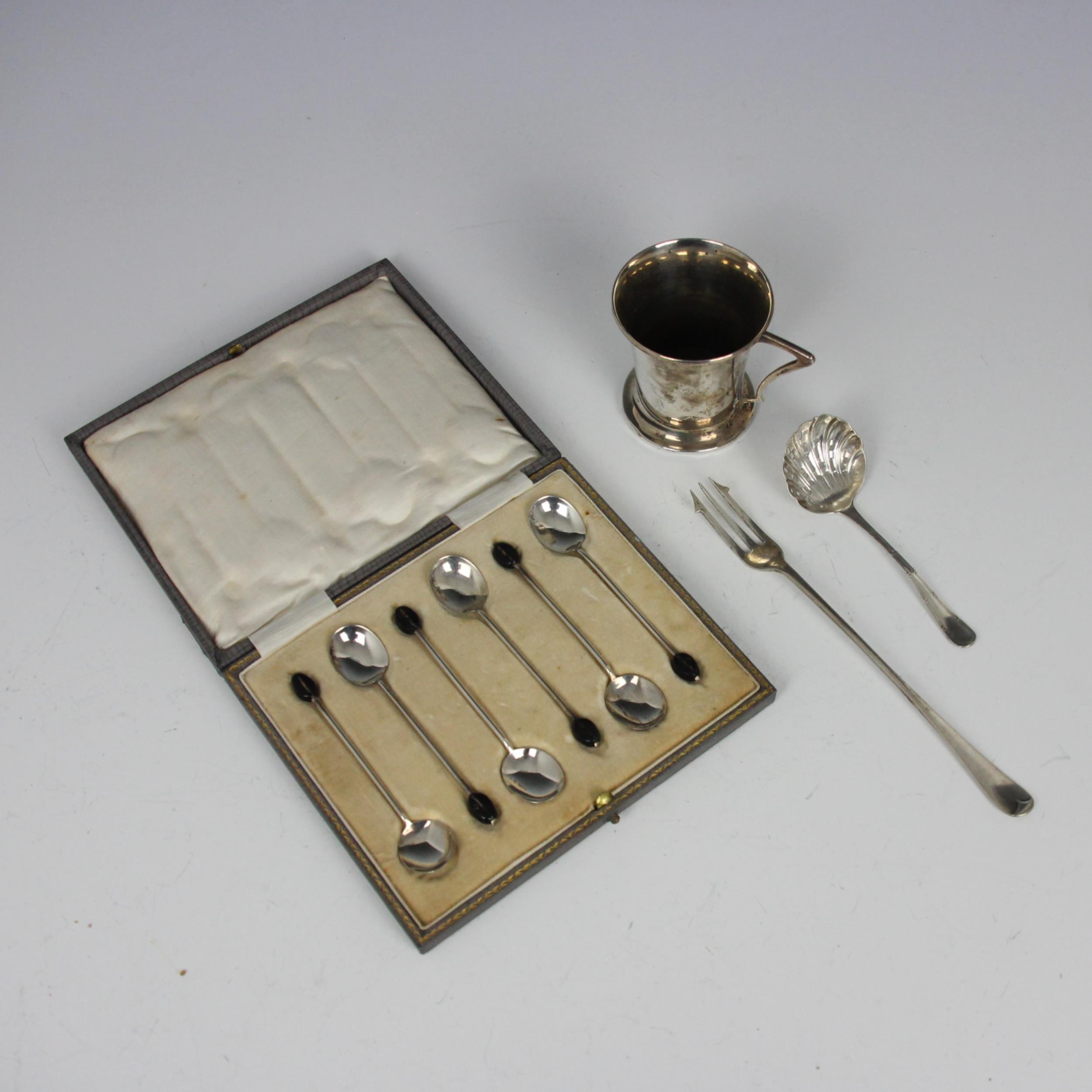 A mid 20th century silver mug, Sanders & Mackenzie, Birmingham 1952, of tapered form with shaped handle, upon pedestal foot, 7cm high, with a silver pickle fork, a silver sugar sifter spoon and a cased set of silver coffee bean spoons, gross weight 4ozt (4)
