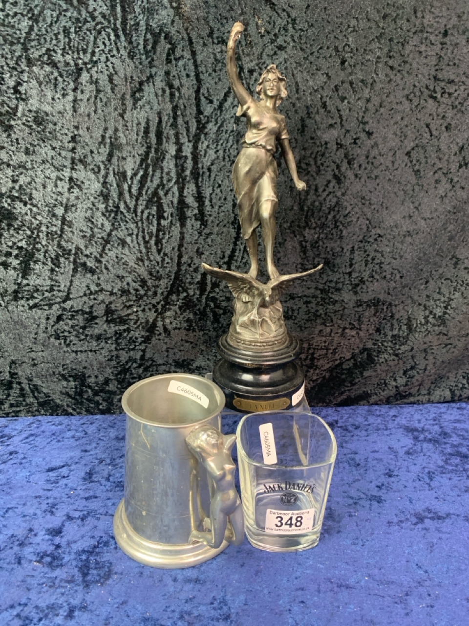 A metal figure entitled ‘La Nuit’ (a/f), a Falstaff pewter tankard with a naked lady handle and a Jack Daniels glass