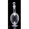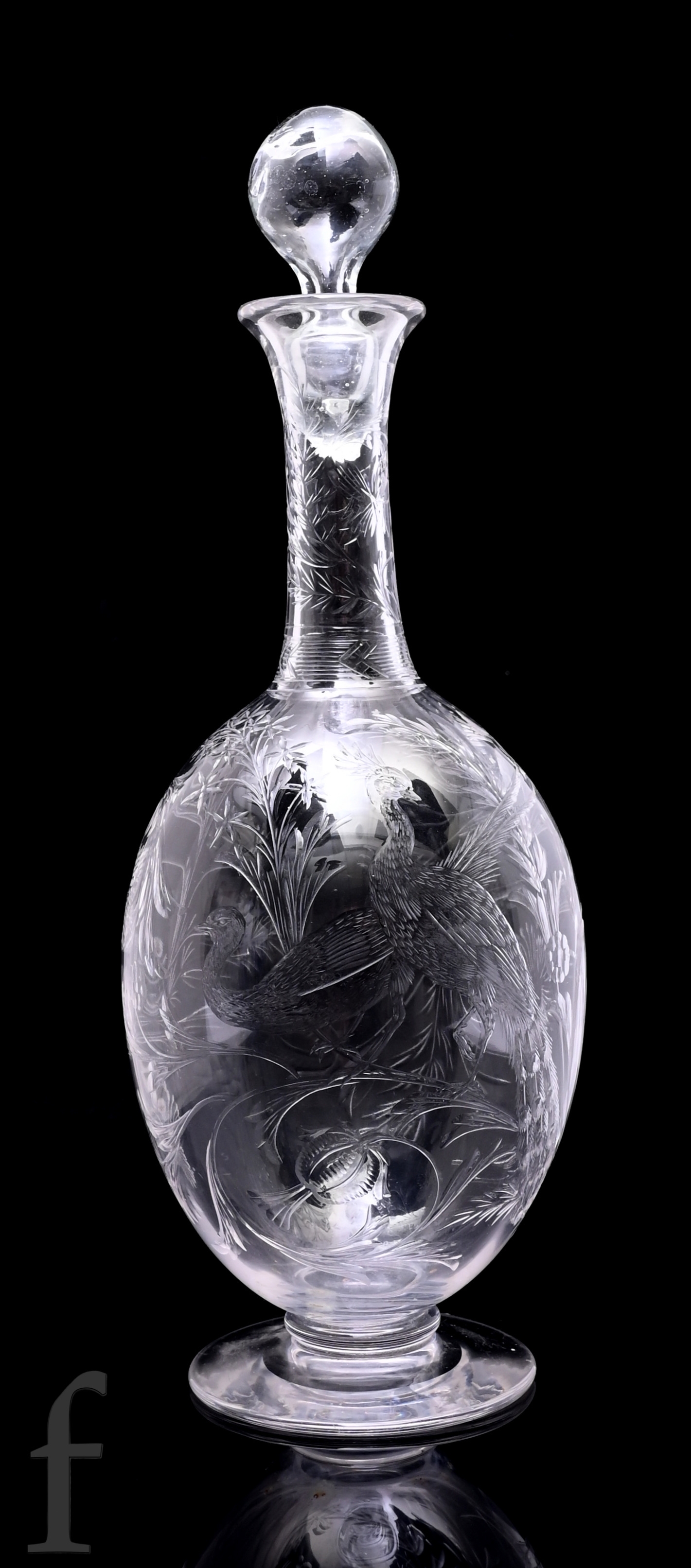 A late 19th Century Stourbridge Thomas Webb & Sons 'rock crystal' style crystal glass decanter of footed ovoid form with slender collar neck, polished intaglio cut with two peacocks amongst stylised floral and foliate scrolls, height 31cm.