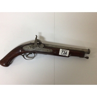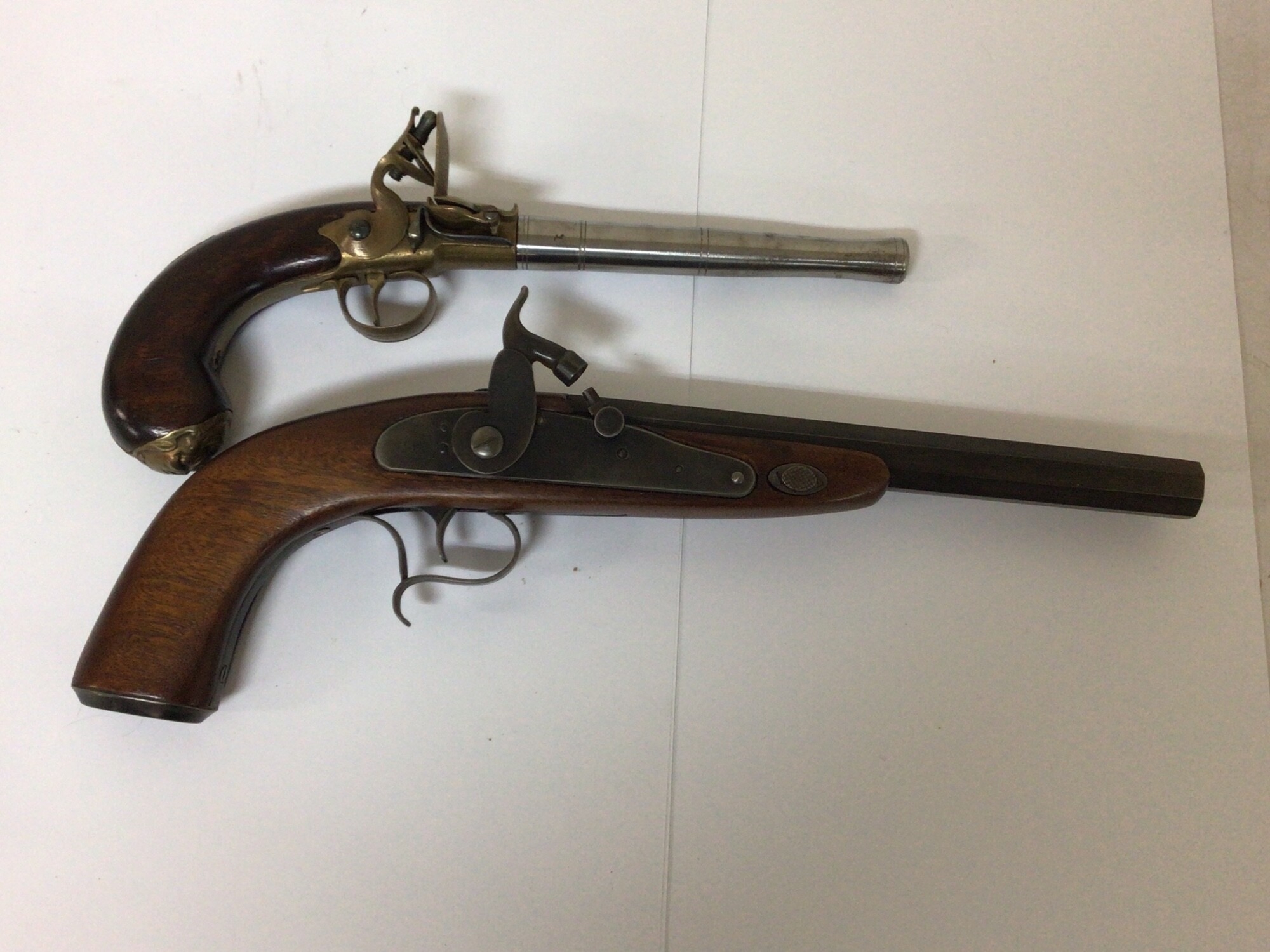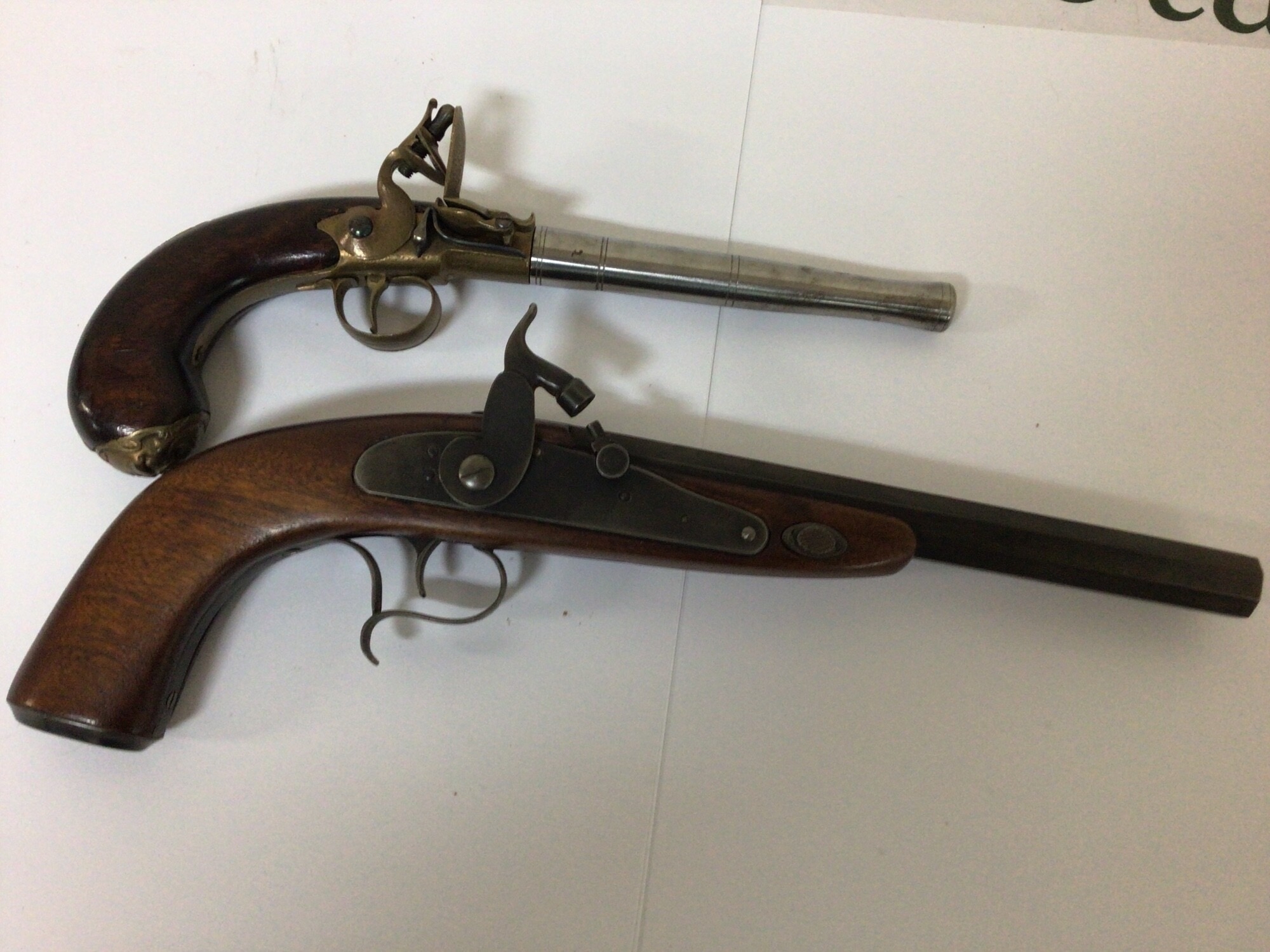 Two good quality Replica antique pistols a flintlock with steel canon barrel and a percussion pistol non firing ornaments (2)