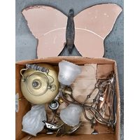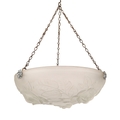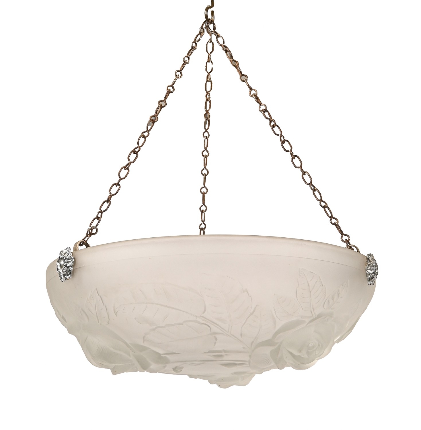 A French frosted glass hanging lightshade, early 20th c, moulded with roses, 34cm diam