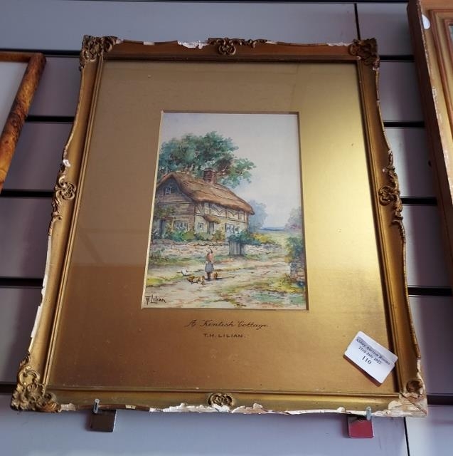 Framed Watercolour Of A Kentish Cottage. Signed T.H.Lillian. Damage To Frame