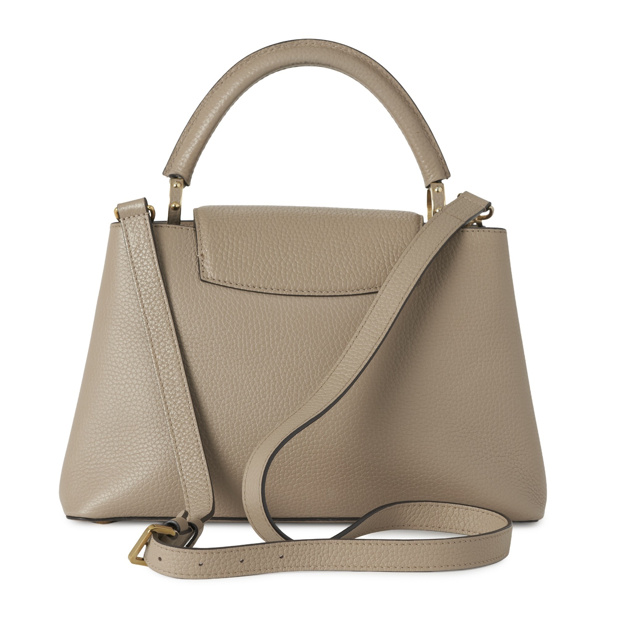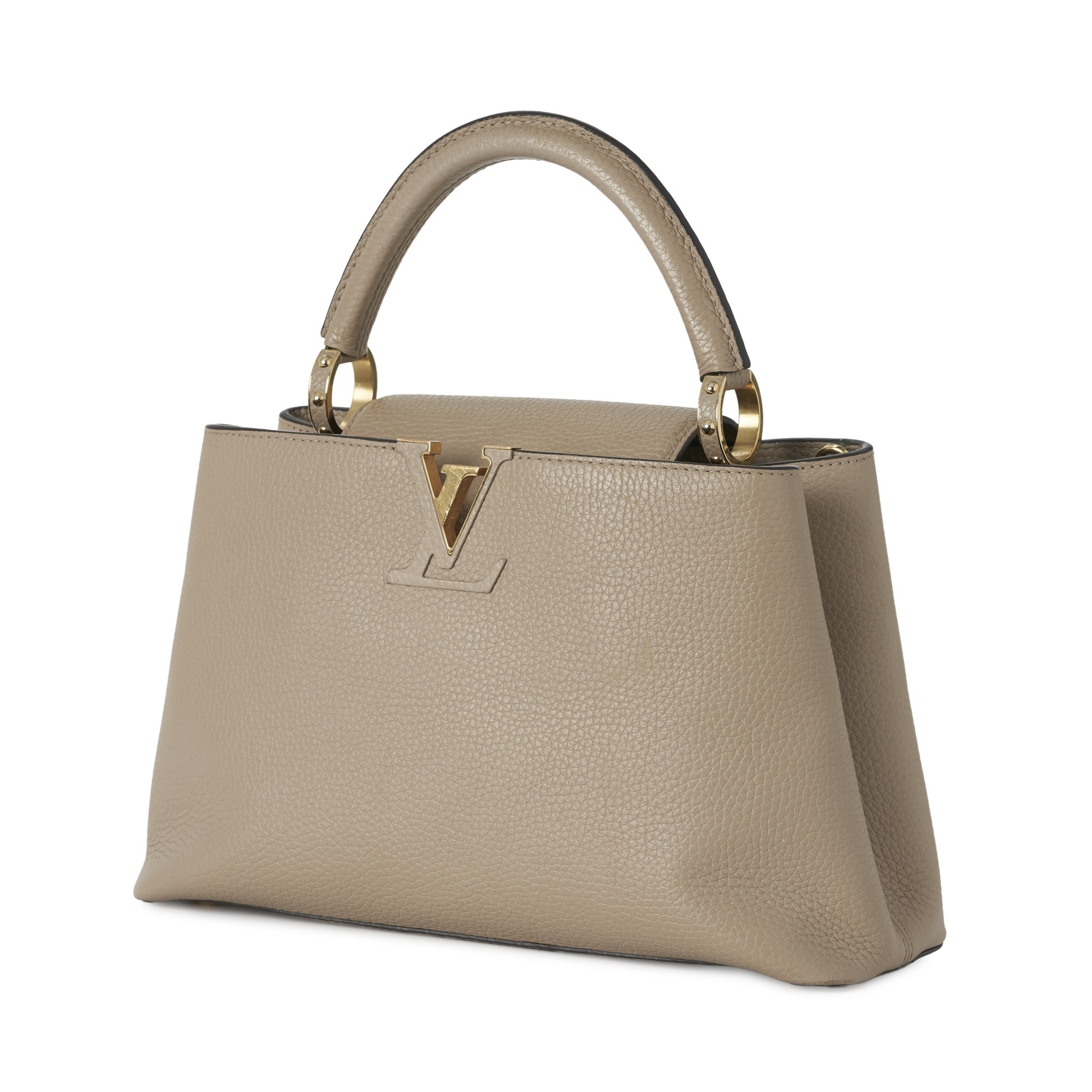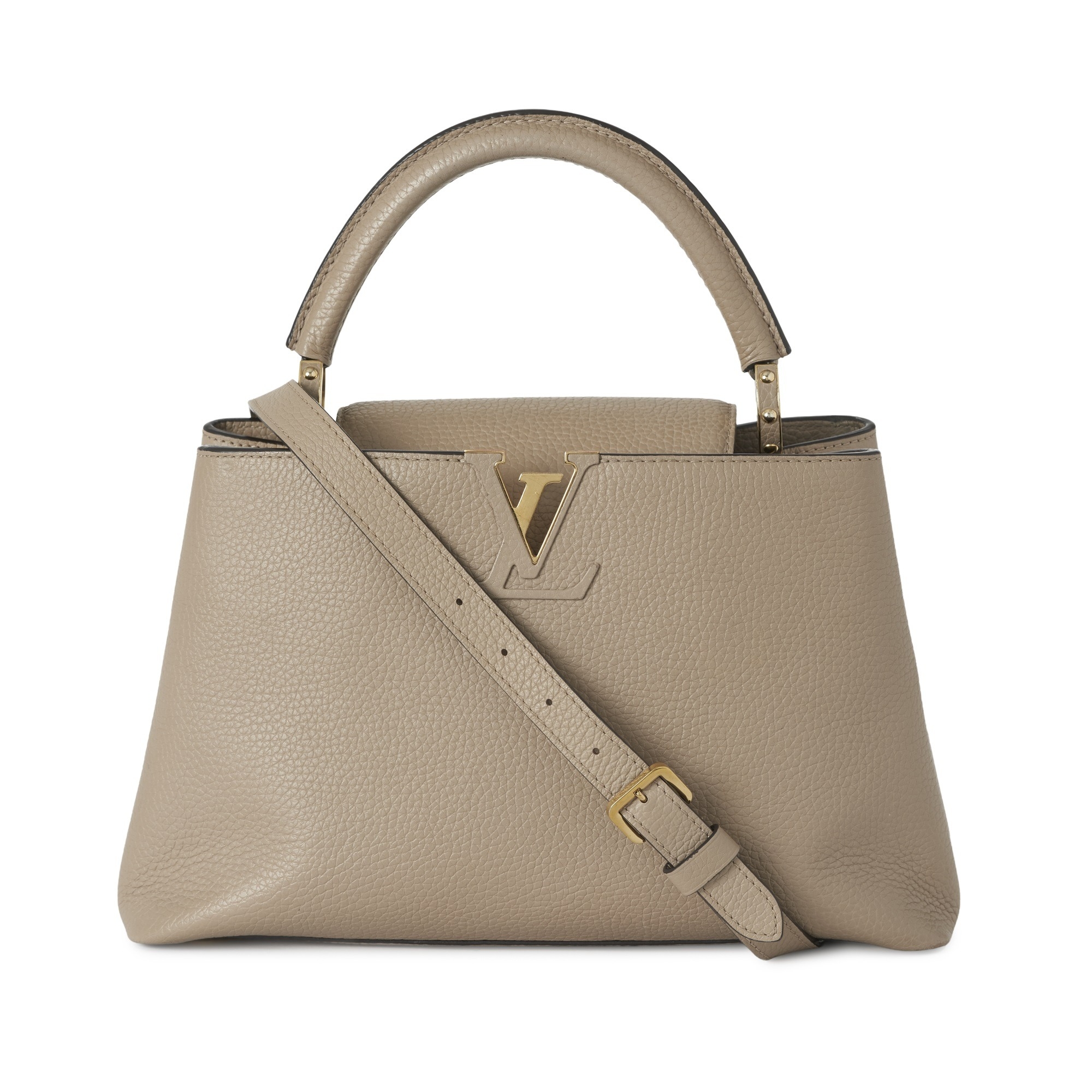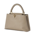 Louis Vuitton, a Capucines PM handbag, crafted from grey Taurillion leather with gold-tone hardware, featuring a single rigid leather handle, detachable leather shoulder strap, top flap closure and a brown leather interior lining, measuring 11 by 20 by 31cm