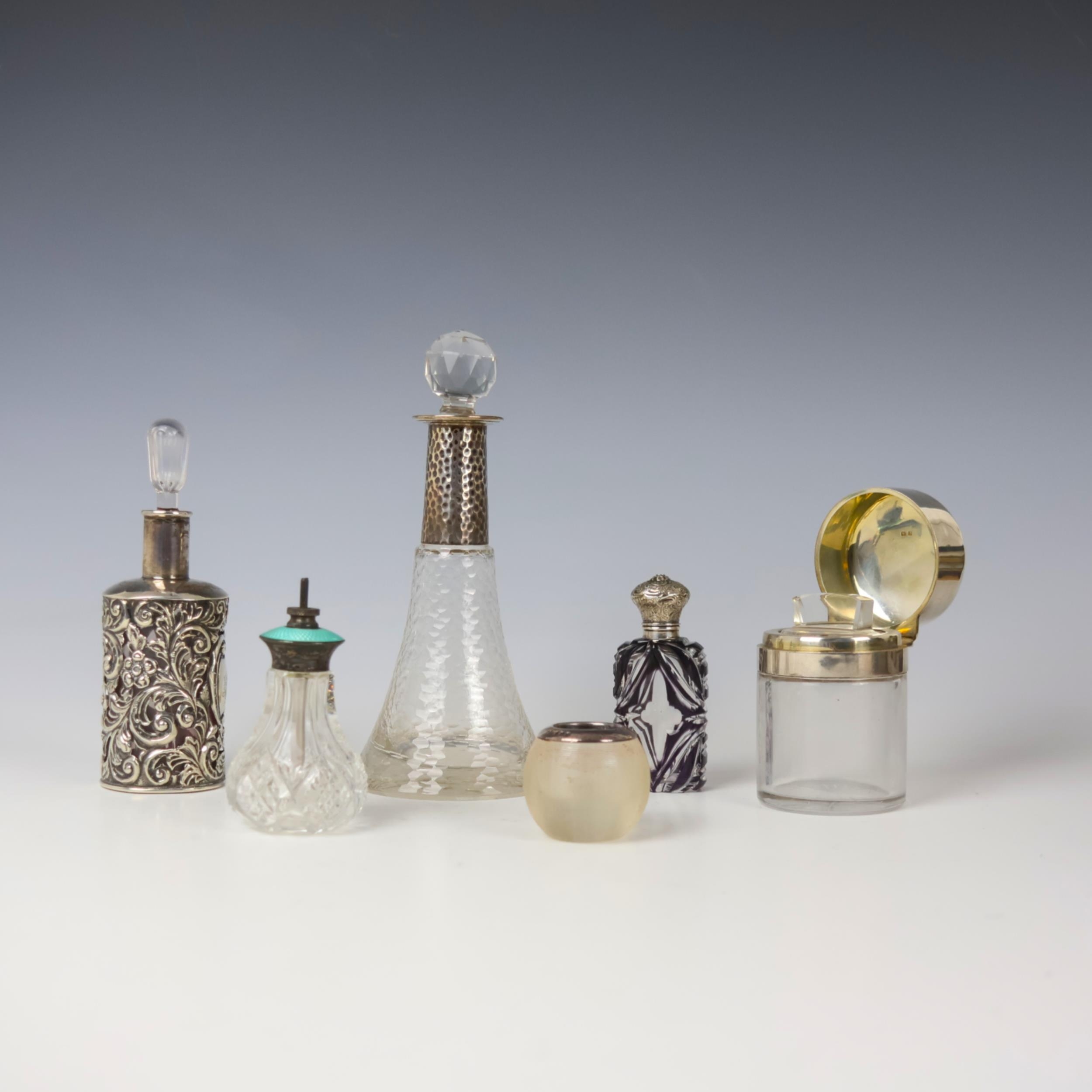 A selection of silver mounted dressing table pieces, including a George V glass table match striker, Schindler & Co, London 1922, the glass body of ribbed form with plain polished collar, 4cm high, a Victorian silver mounted scent bottle, James Deakin & Sons, Chester 1899, the mount of embossed form, 16cm high, and four further silver mounted pieces (6) (at fault)