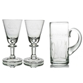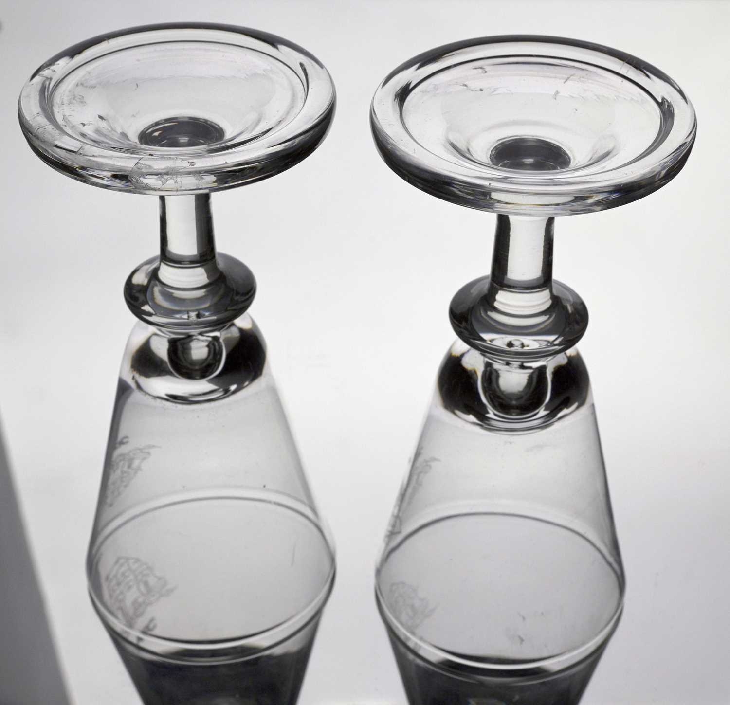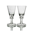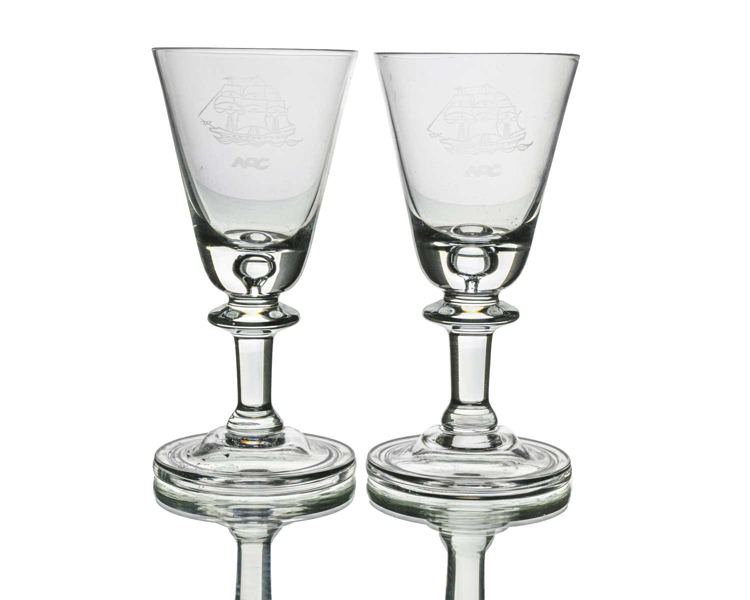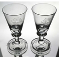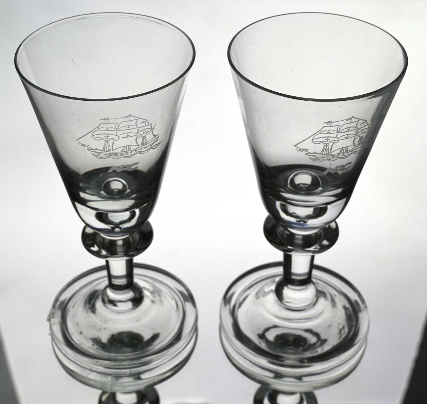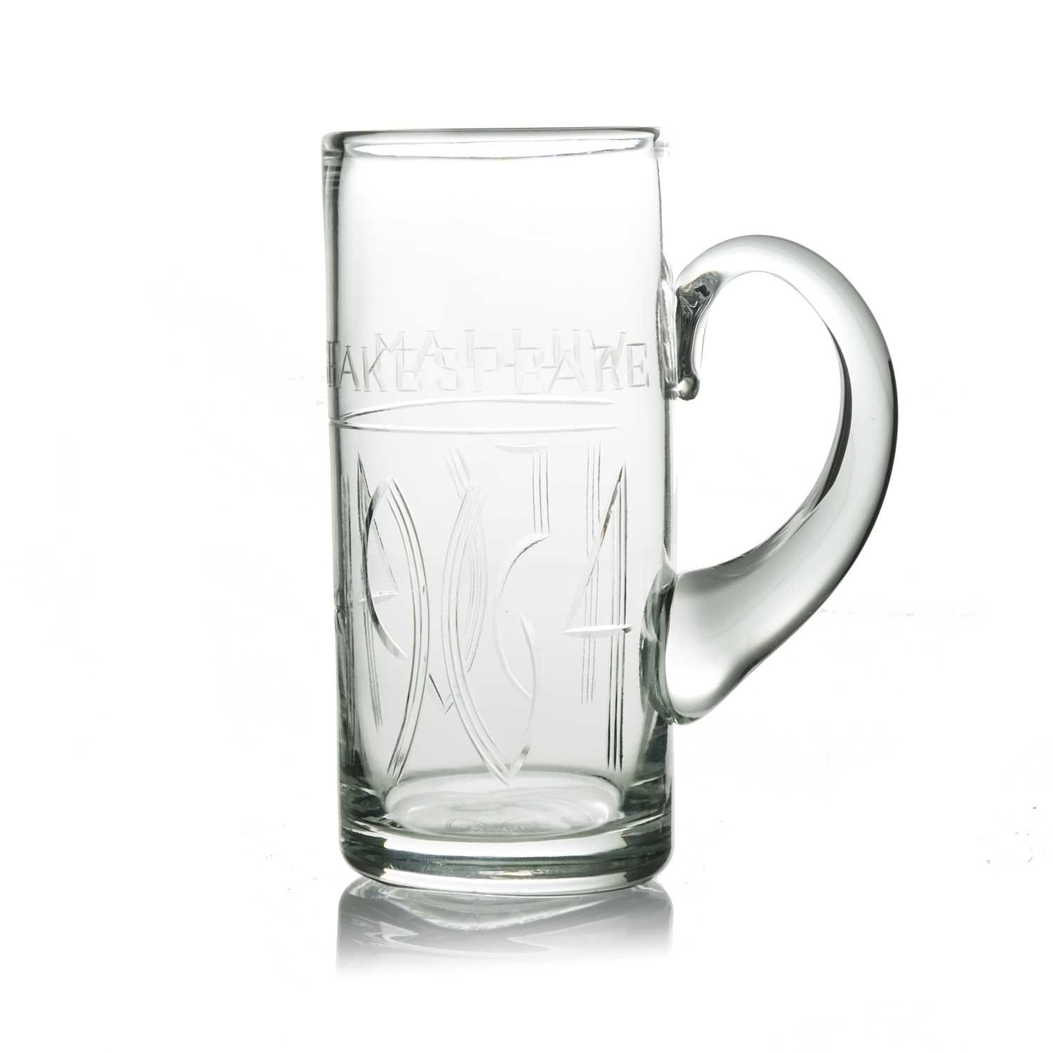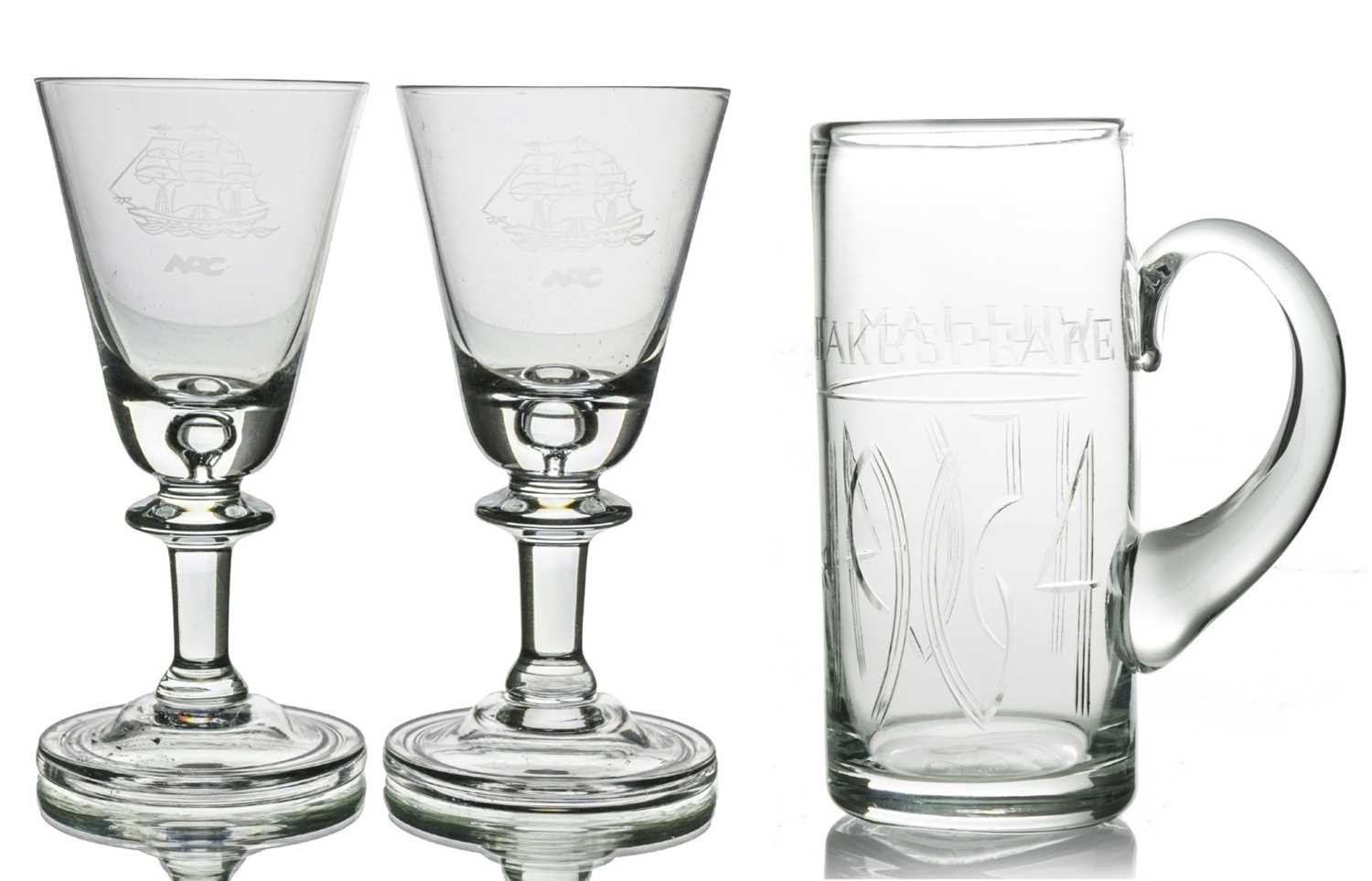 Cruise Line interest, Willy Johansson for Hadeland, a pair of Tangen wine glasses, for Norwegian American Cruises, circa 1980s, conical bowls with teardrop inclusions, engraved with the emblem of the NAC, on knopped stems and folded style feet, 14cm high, together with David Hammond for Thomas Webb, a commemorative Shakespeare glass tankard or mug, 1964, cylindrical form, engraved with the name William Shakespeare, above mitre and line cut dates 1564 1964, etched marks design sponsored by the Shakespeare anniversary council, 15.5cm high (3)