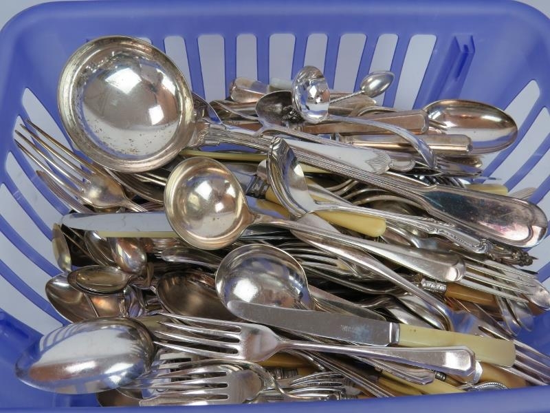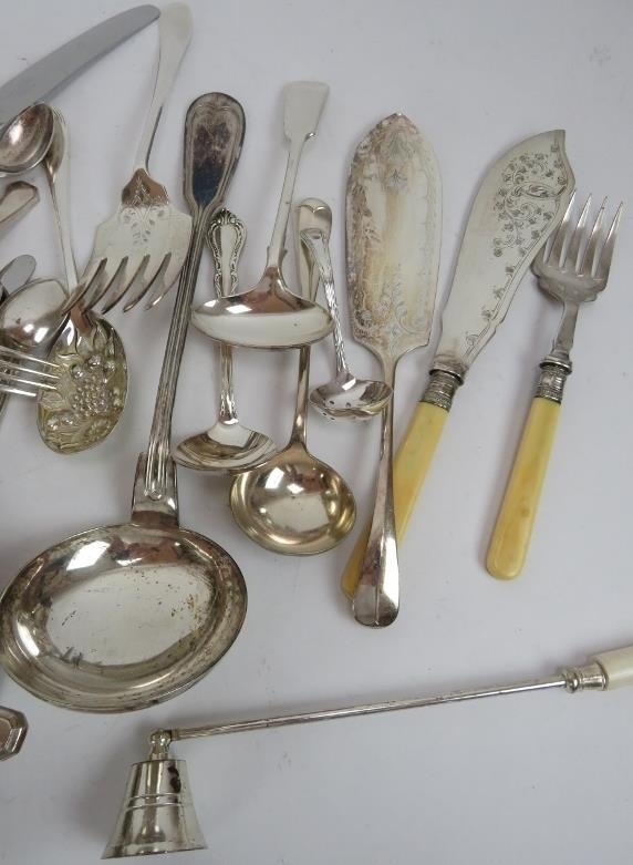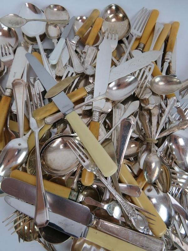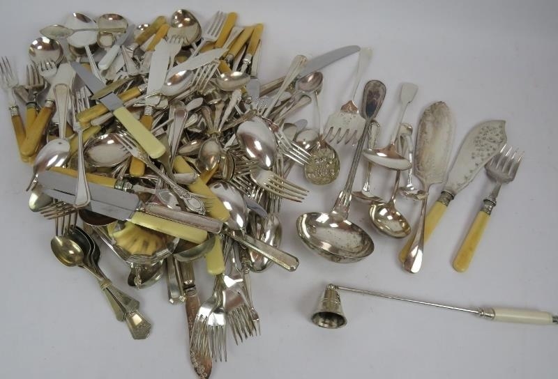 A large quantity of mainly antique silver plated cutlery including ladles, fish servers, berry spoons, knives, forks, spoons etc. (qty).