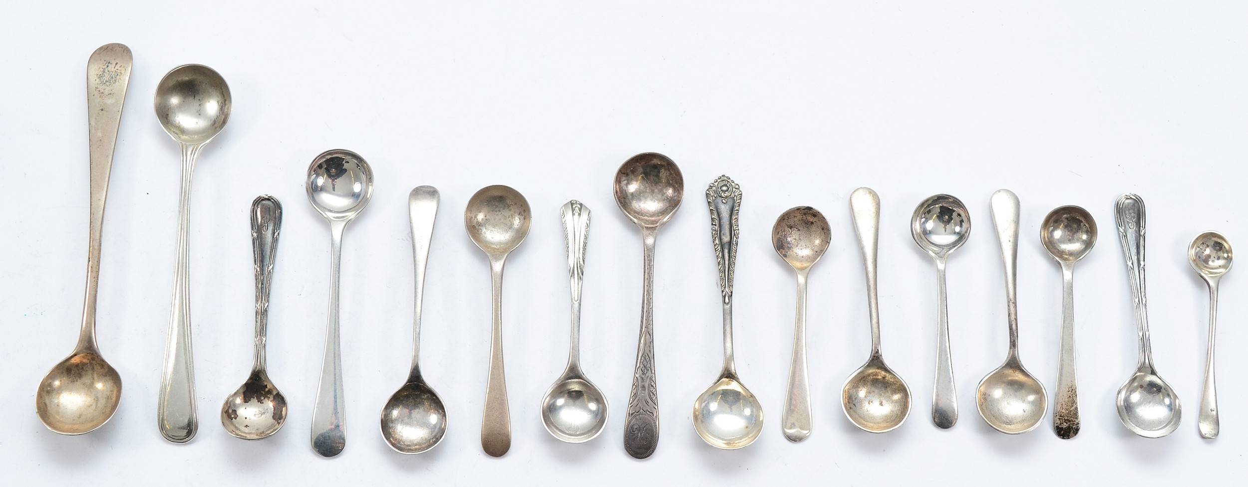 A collection of sixteen Georgian and later silver condiment spoons, 108gm.