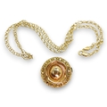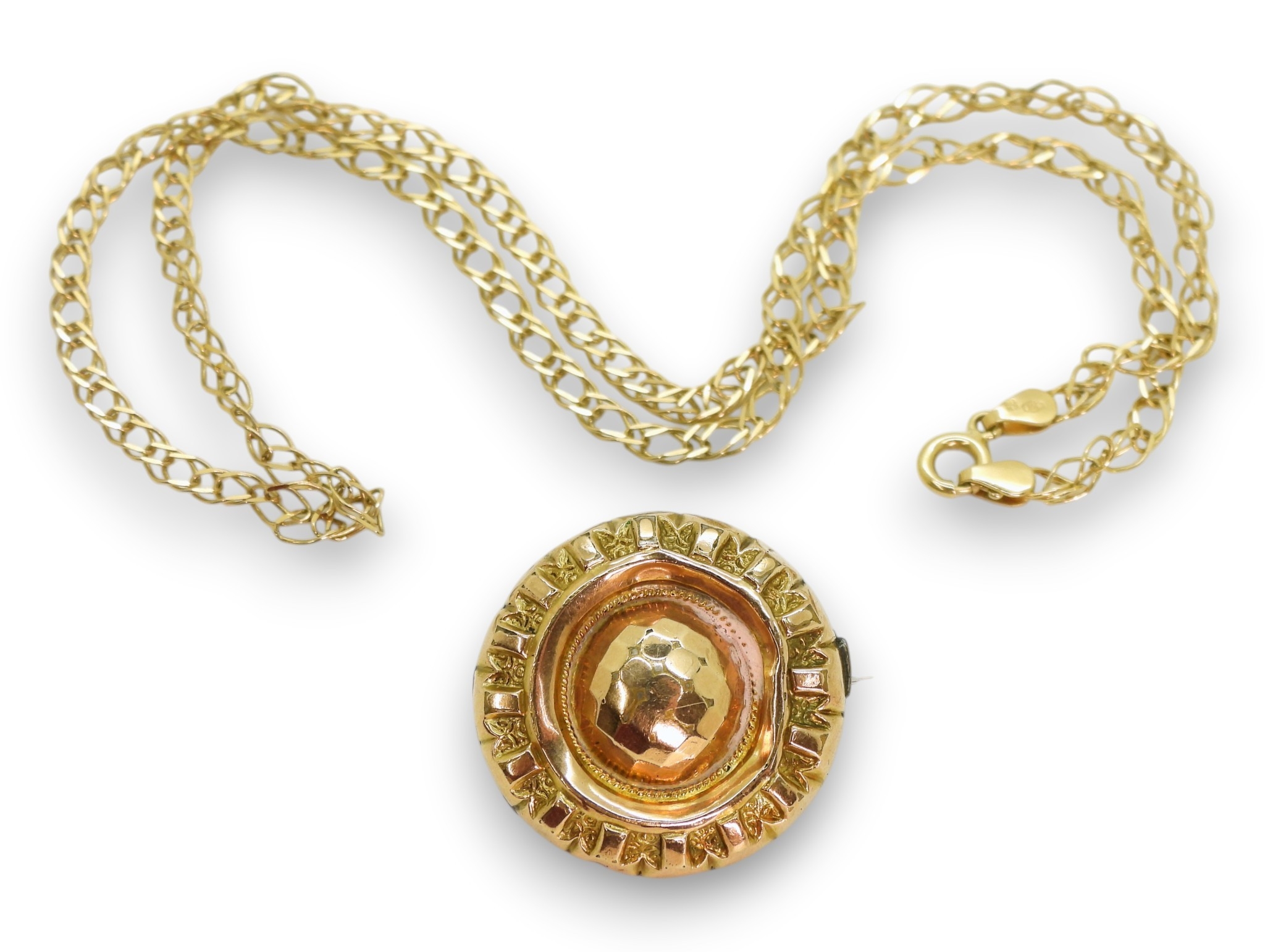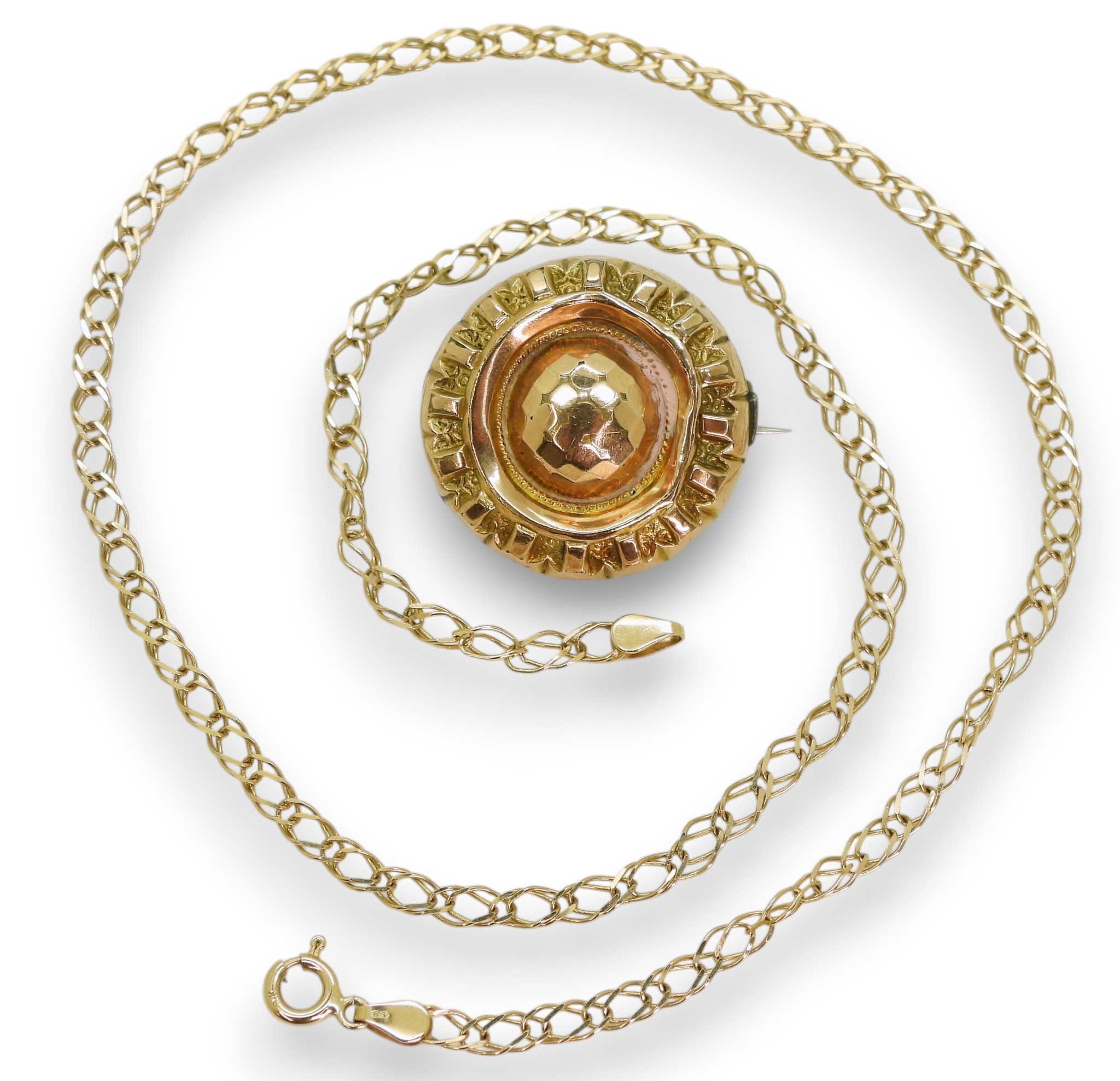A 9ct gold double curb chain , length 45cm, together with a yellow metal Victorian brooch, weight combined 8.4gms