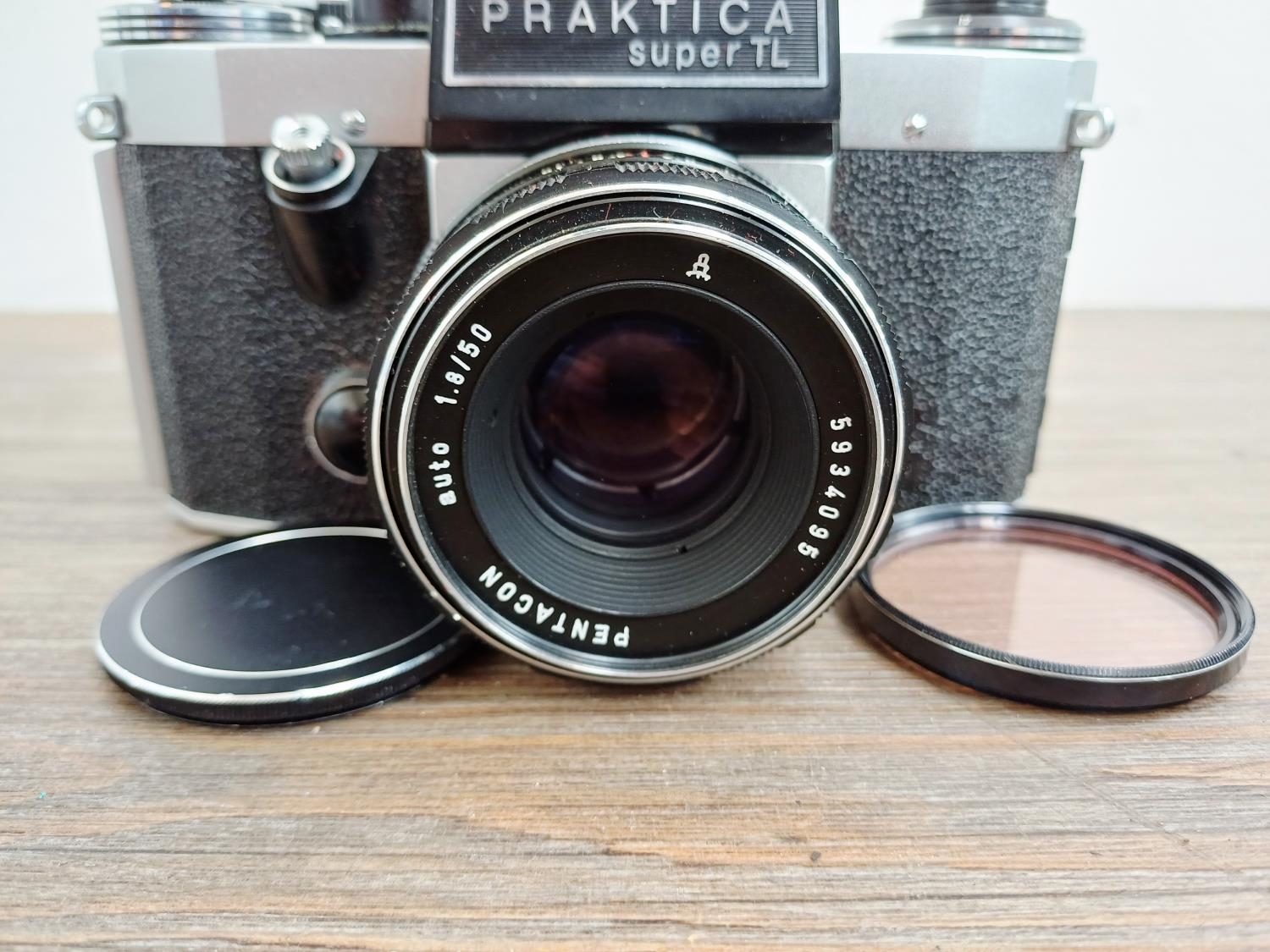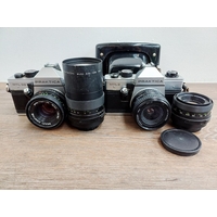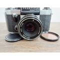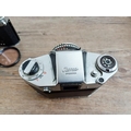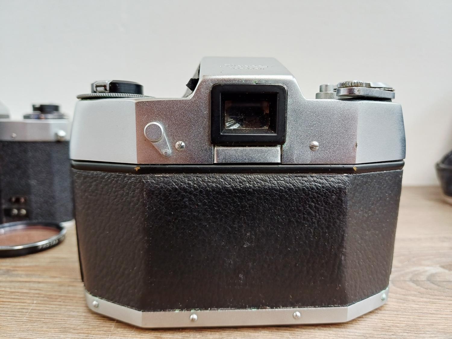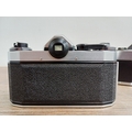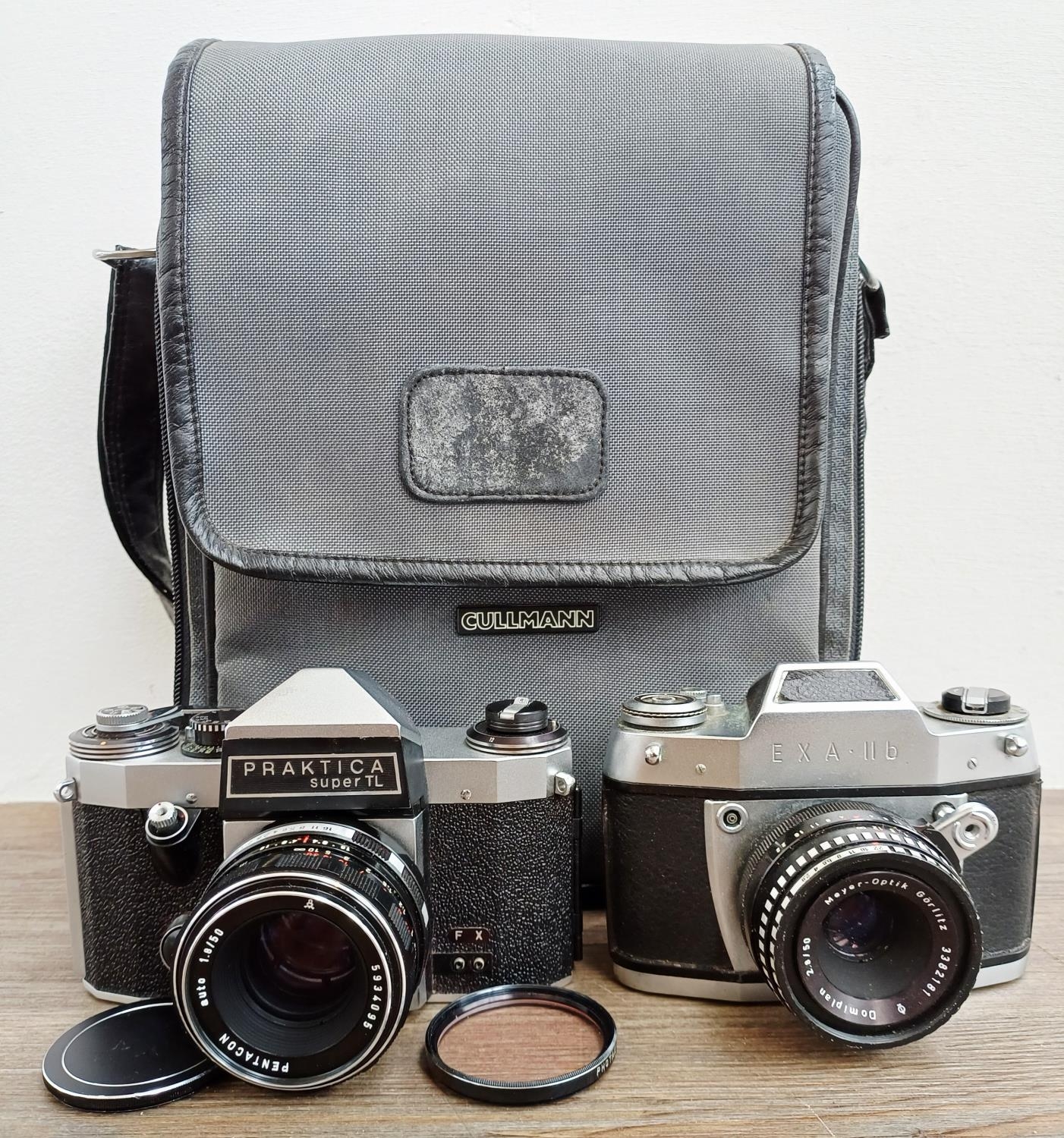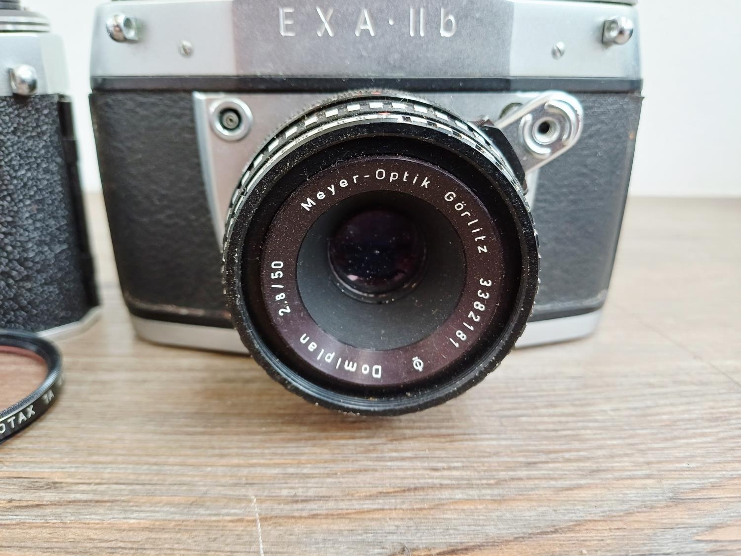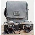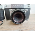 Two German 35mm SLR cameras, one Ihagee Exa IIb fitted with Meyer-Optik Domiplan Q1 1:2.8 50mm lens and one Praktica Super TL fitted with Pentacon auto 1:1.8 50mm lens