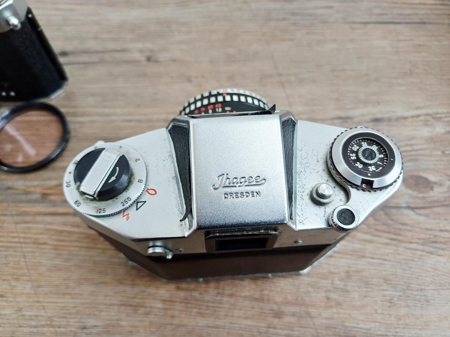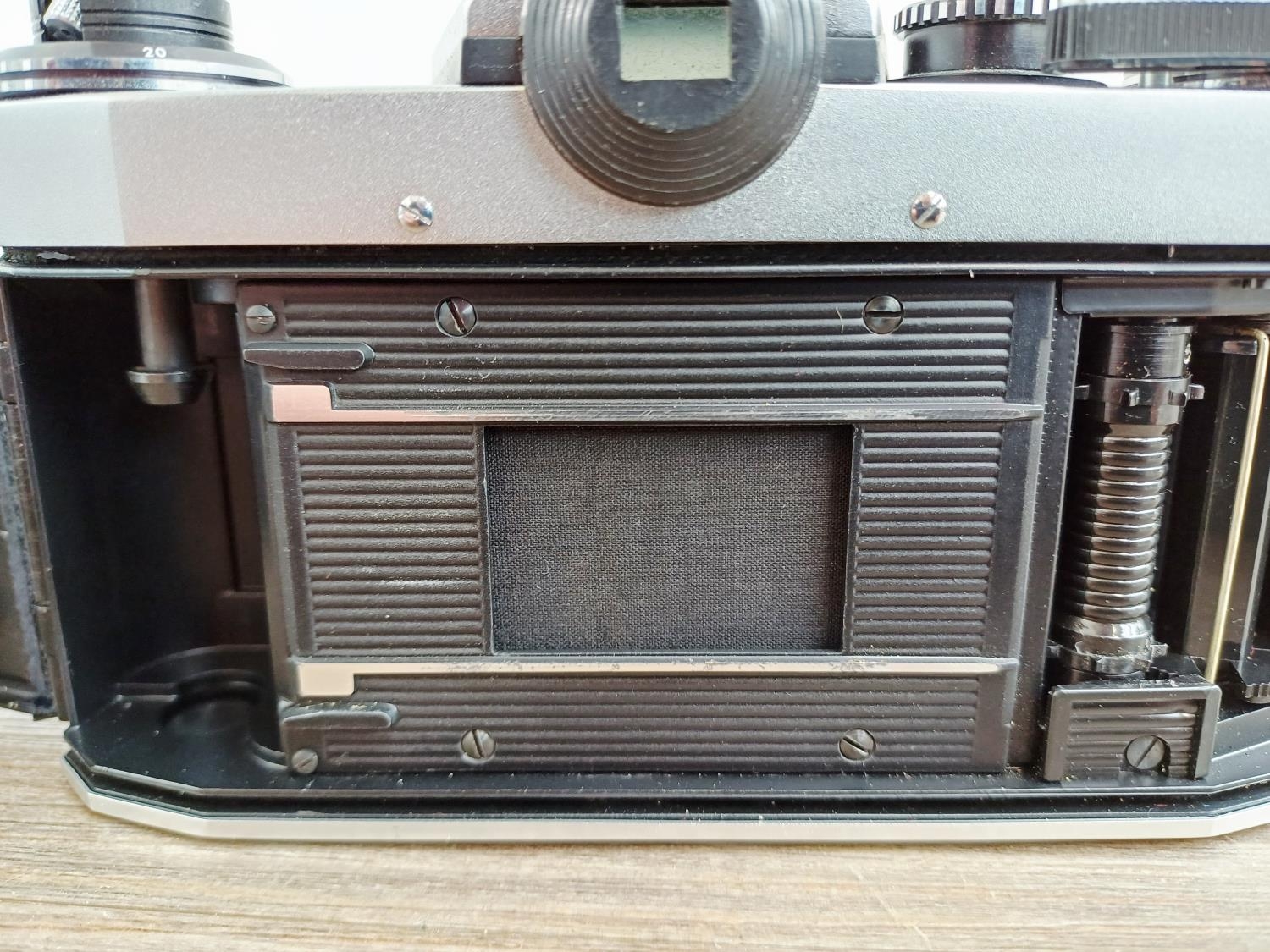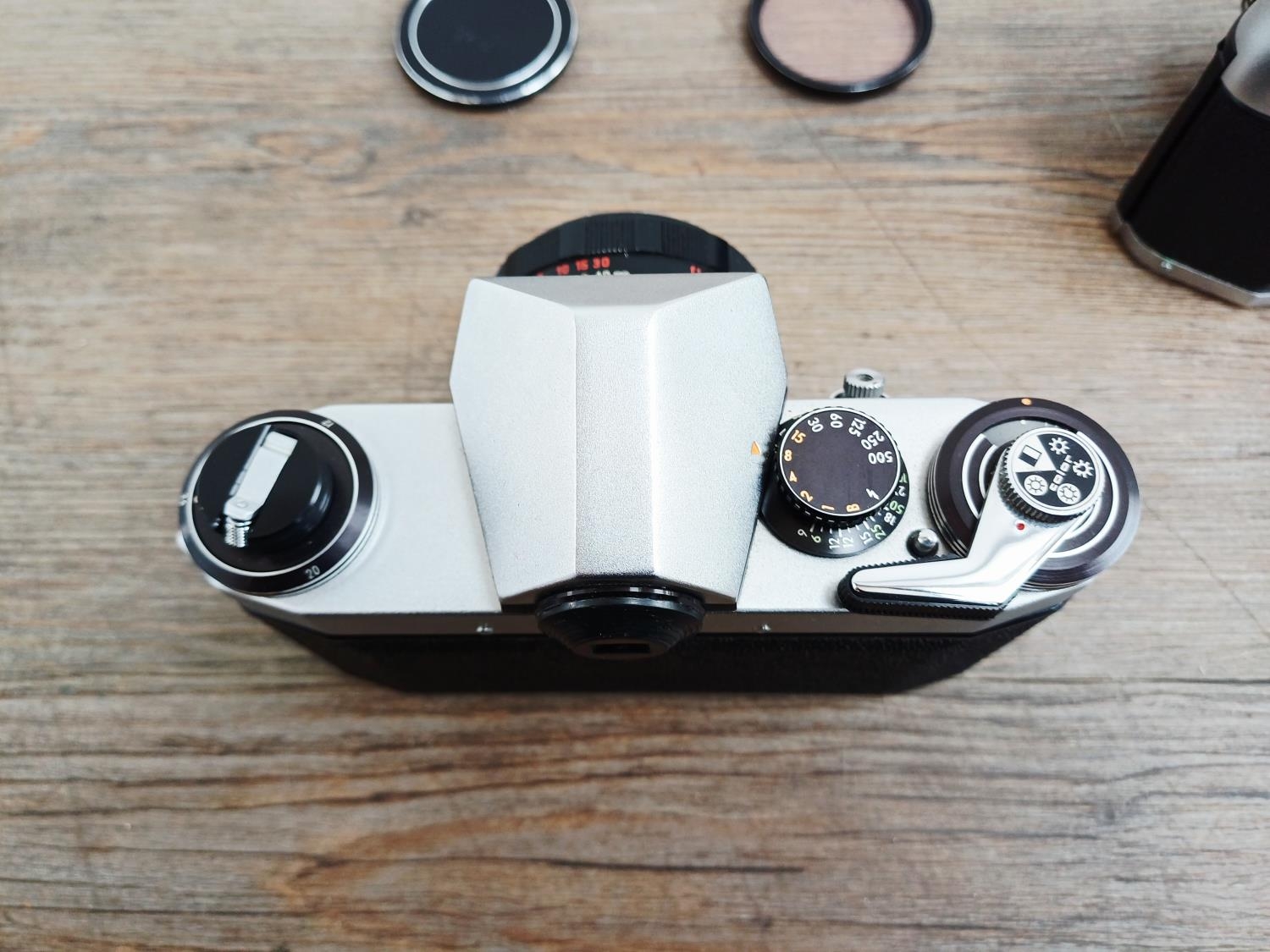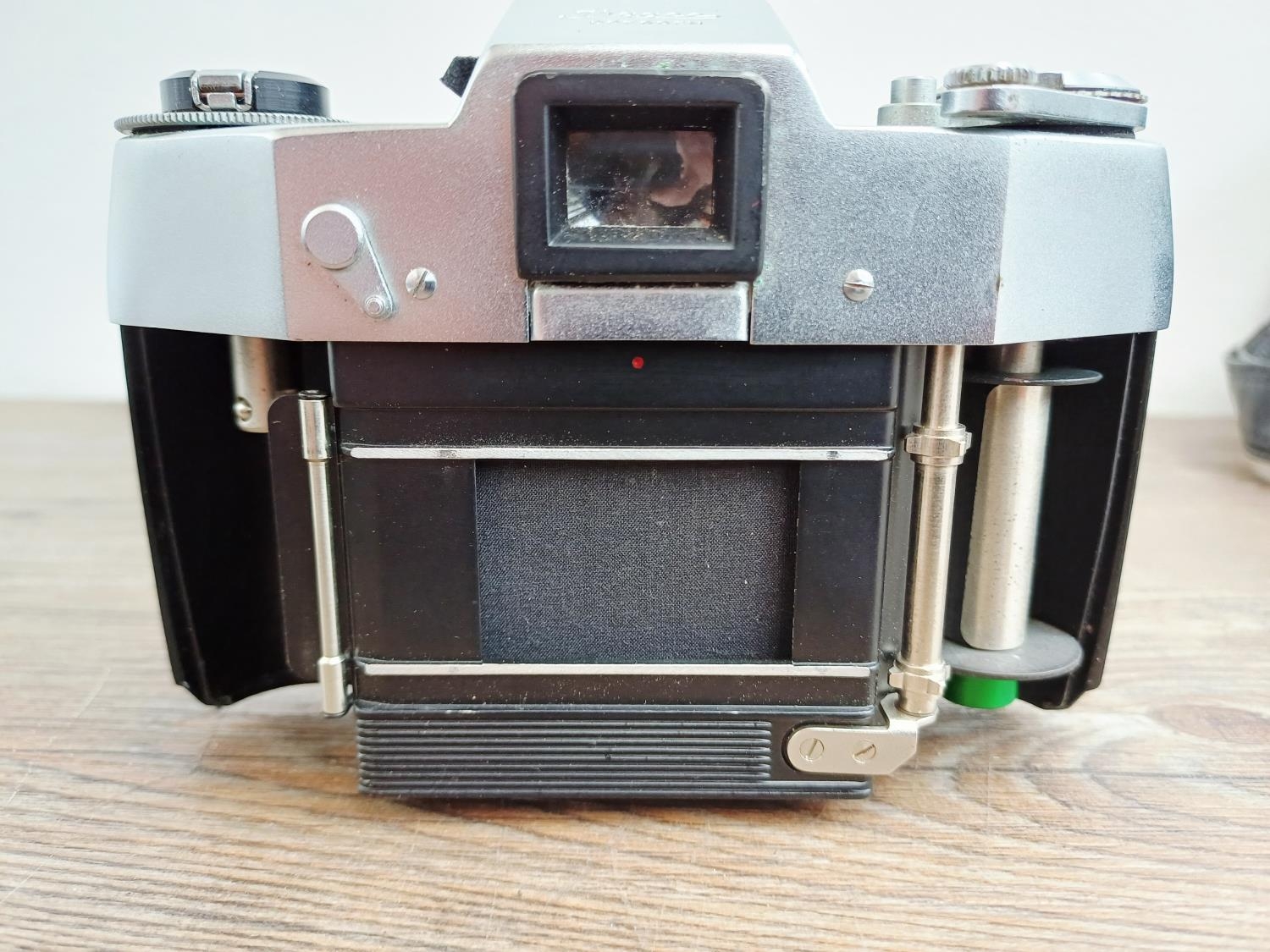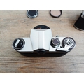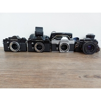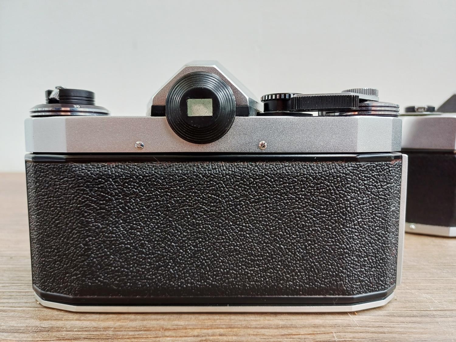 Two German 35mm SLR cameras, one Ihagee Exa IIb fitted with Meyer-Optik Domiplan Q1 1:2.8 50mm lens and one Praktica Super TL fitted with Pentacon auto 1:1.8 50mm lens