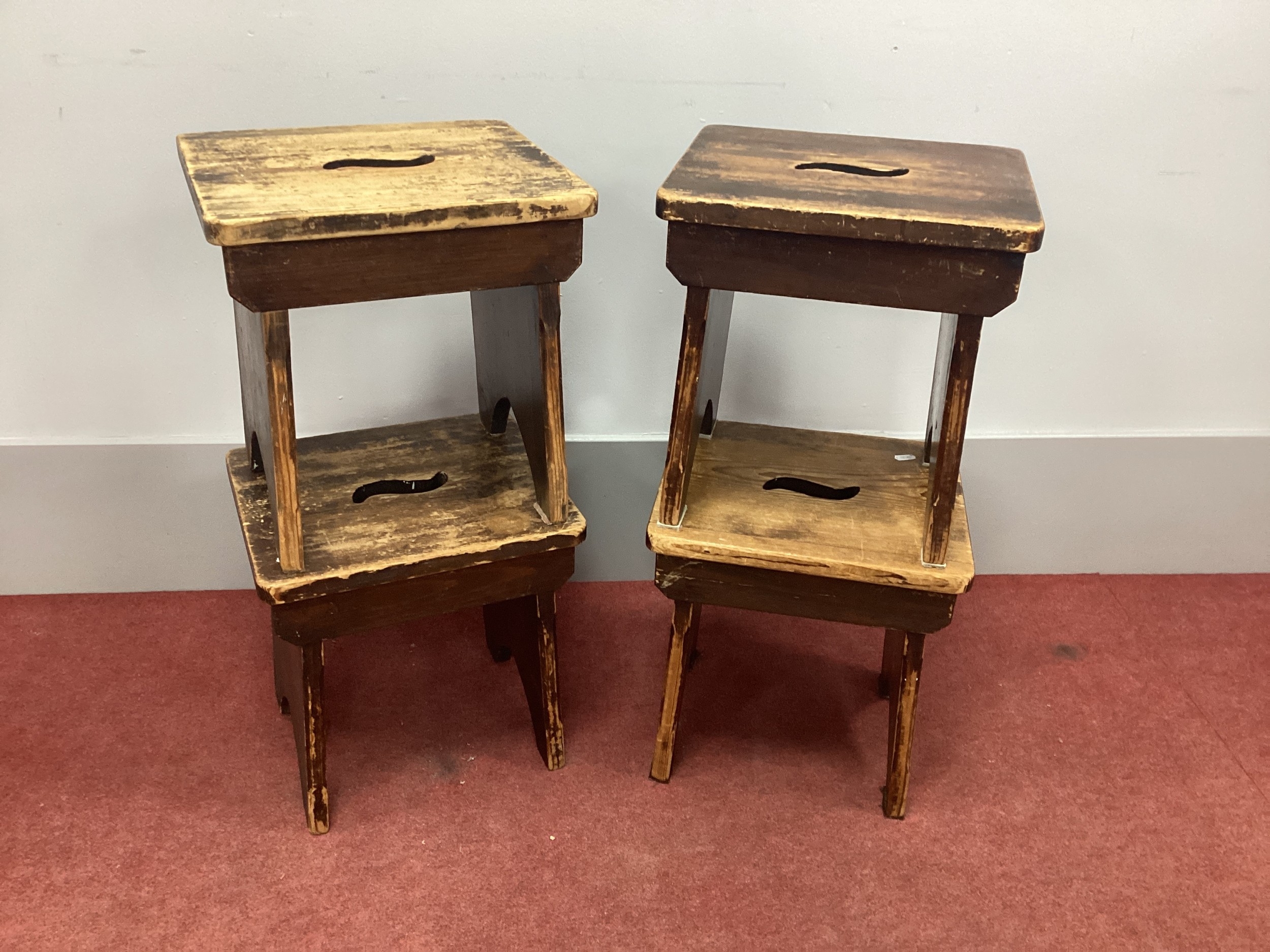 Four Pine Prayer Kneelers, with pierced hand grips, 34cm wide. (4)