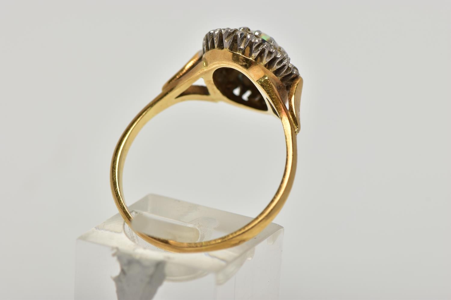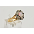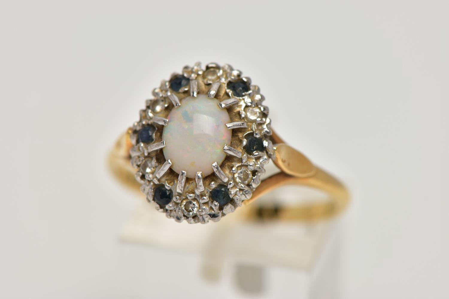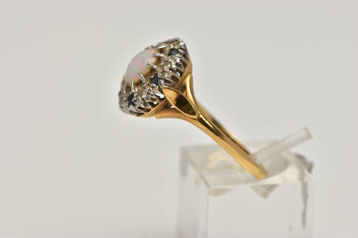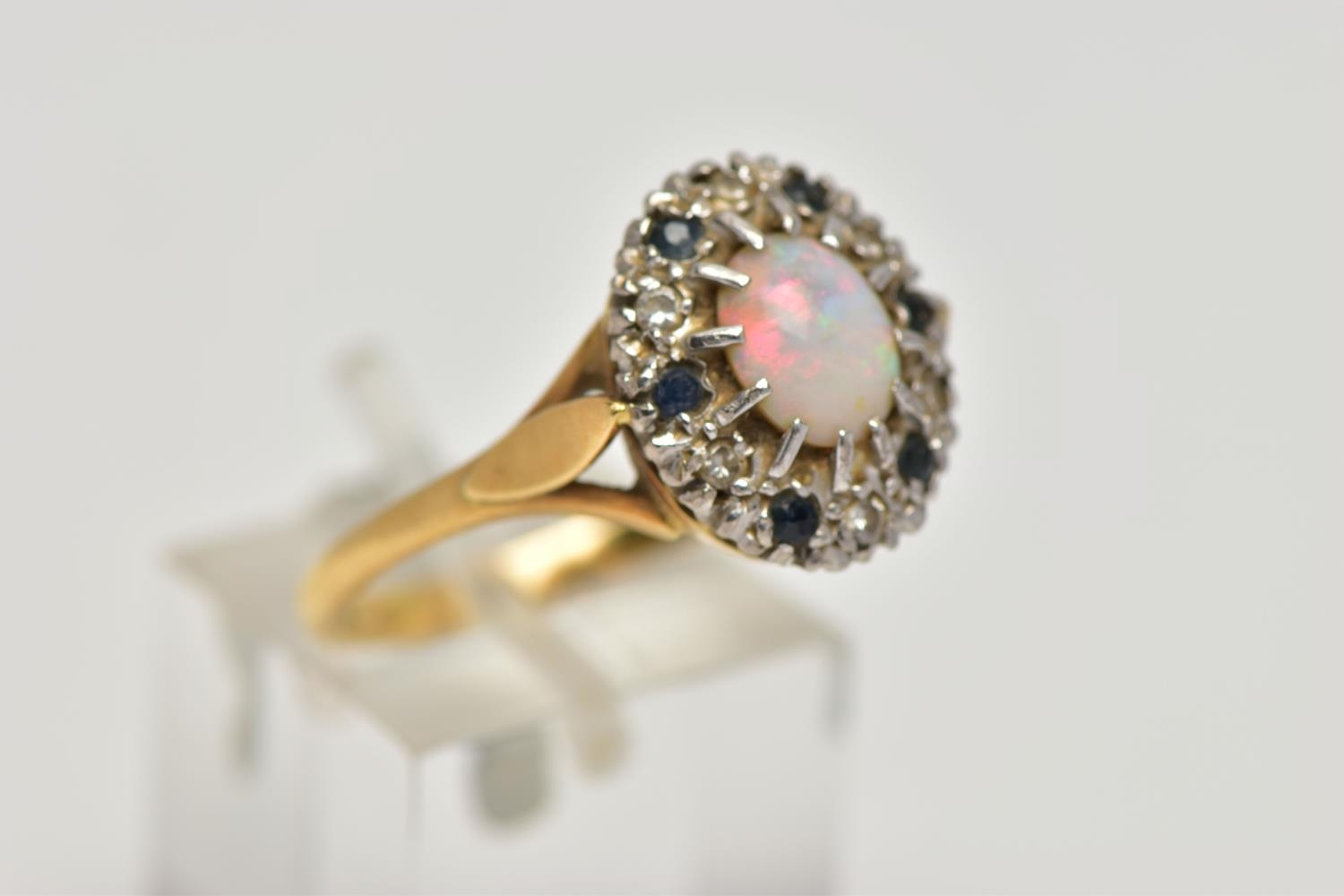 AN 18CT GOLD, OPAL, SAPPHIRE AND DIAMOND CLUSTER RING, of an oval form centring on a twelve claw set oval opal cabochon, within a surround of circular cut blue sapphires and brilliant cut diamonds, trifurcated shoulders, leading onto a polished band, hallmarked 18ct London 1980, ring size V, approximate gross weight 5.8 grams (condition report: would benefit from a gentle clean, all stones are intact, the opal is in good condition)