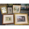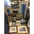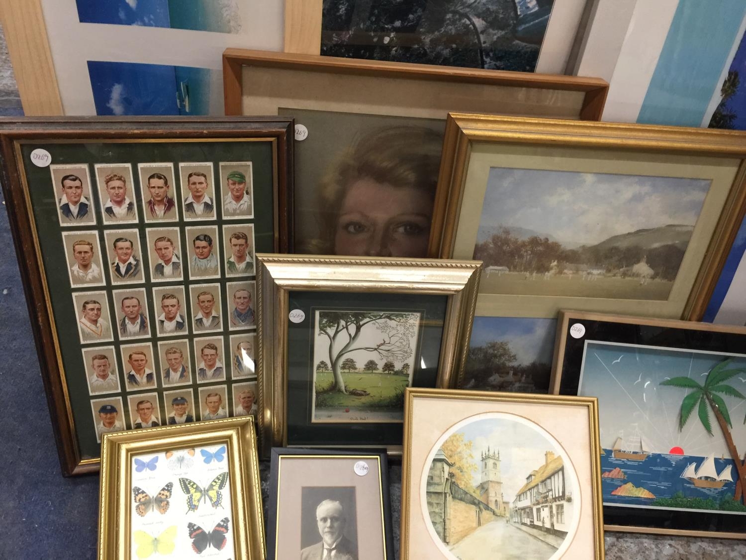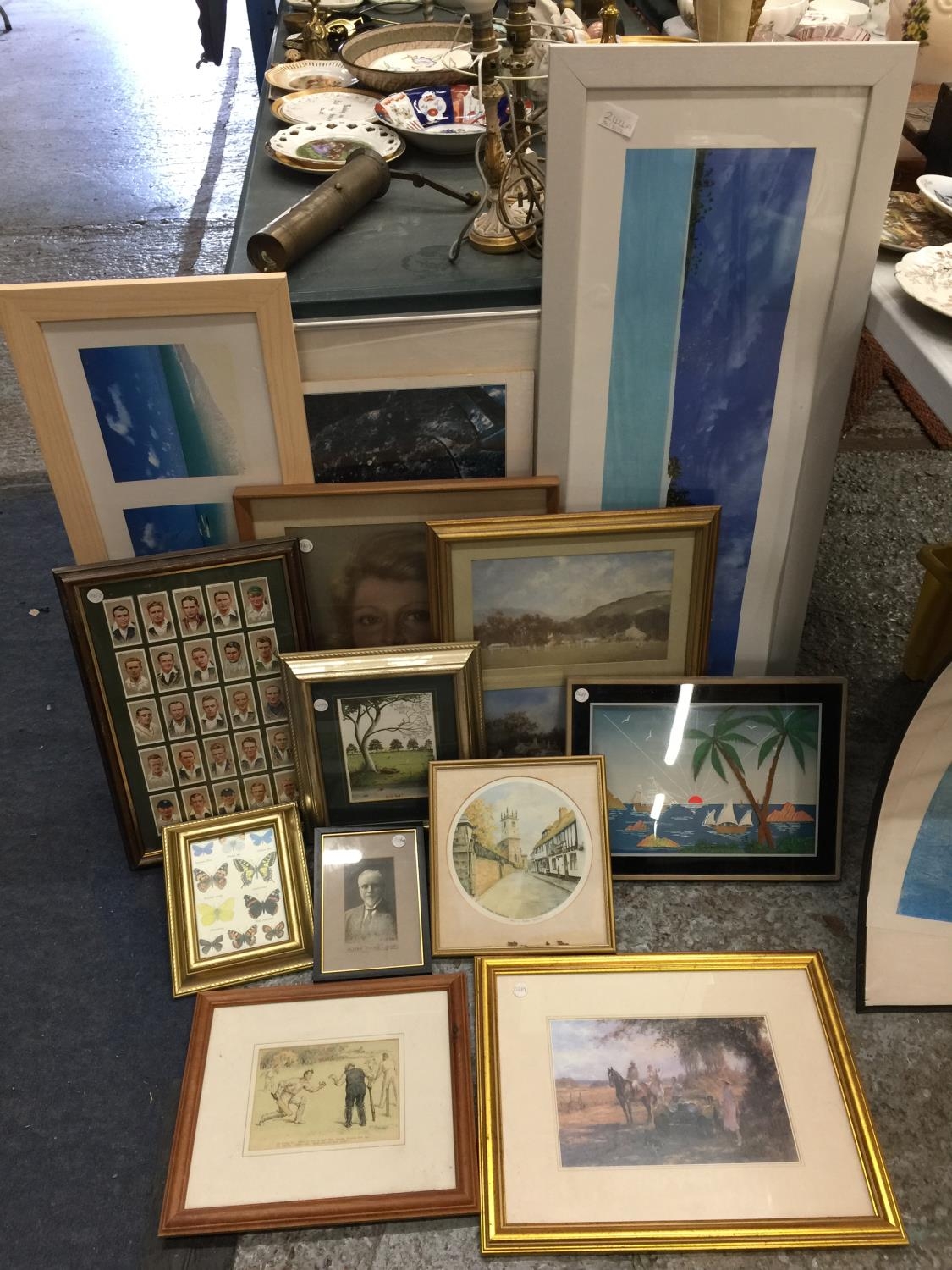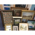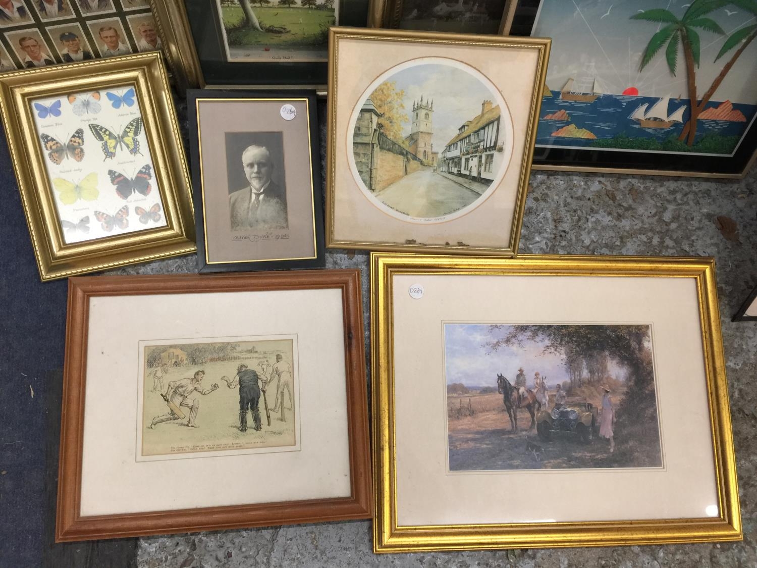A QUANTITY OF FRAMED PRINTS, CIGARETTE CARDS, ETC