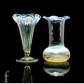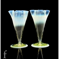 An early 20th Century straw opal posy vase designed by Harry Powell for James Powell and Sons, Whitefriars with a circular foot rising to a flared and fluted trumpet with wave rim in a graduated opalescent tint, together with a similar globe and shaft form example, tallest 12cm. (2)