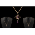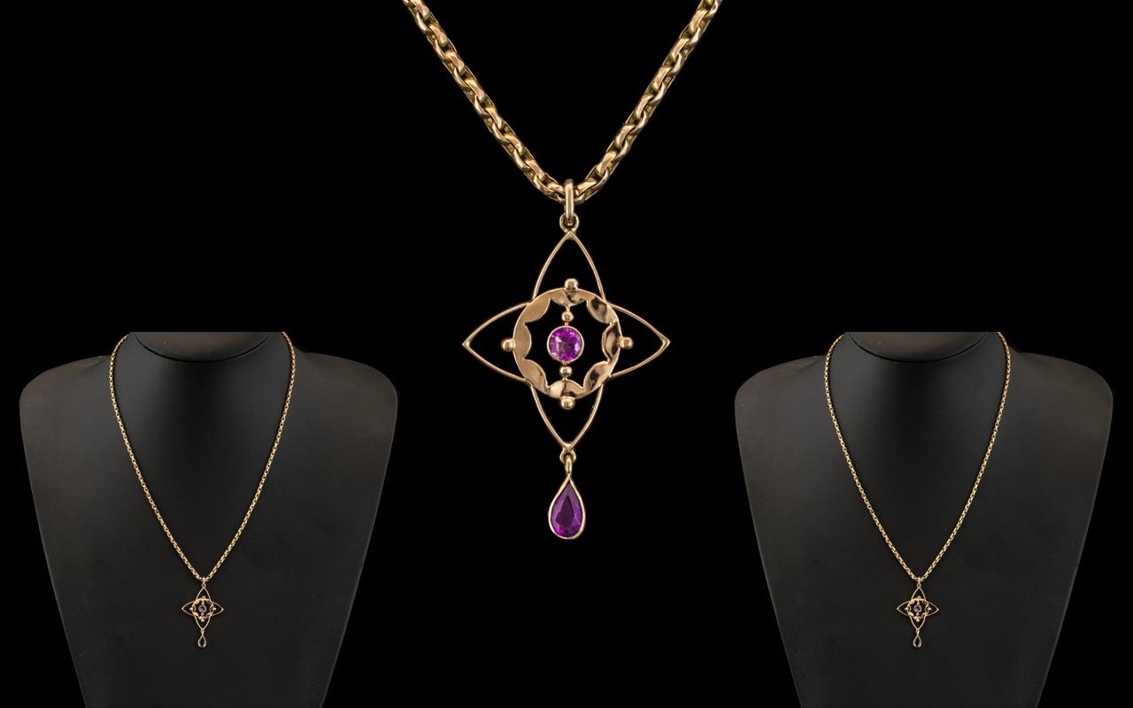 Antique Period - Attractive 9ct Gold Amethyst Set - Ornate Pendant Drop with Attached 9ct Gold Belcher Chain. Chain and Pendant Marked 9ct. Length of Pendant / Chain 20..25 Inches - 50.70 cms. 6.3 grams. Excellent Condition In All Aspects.