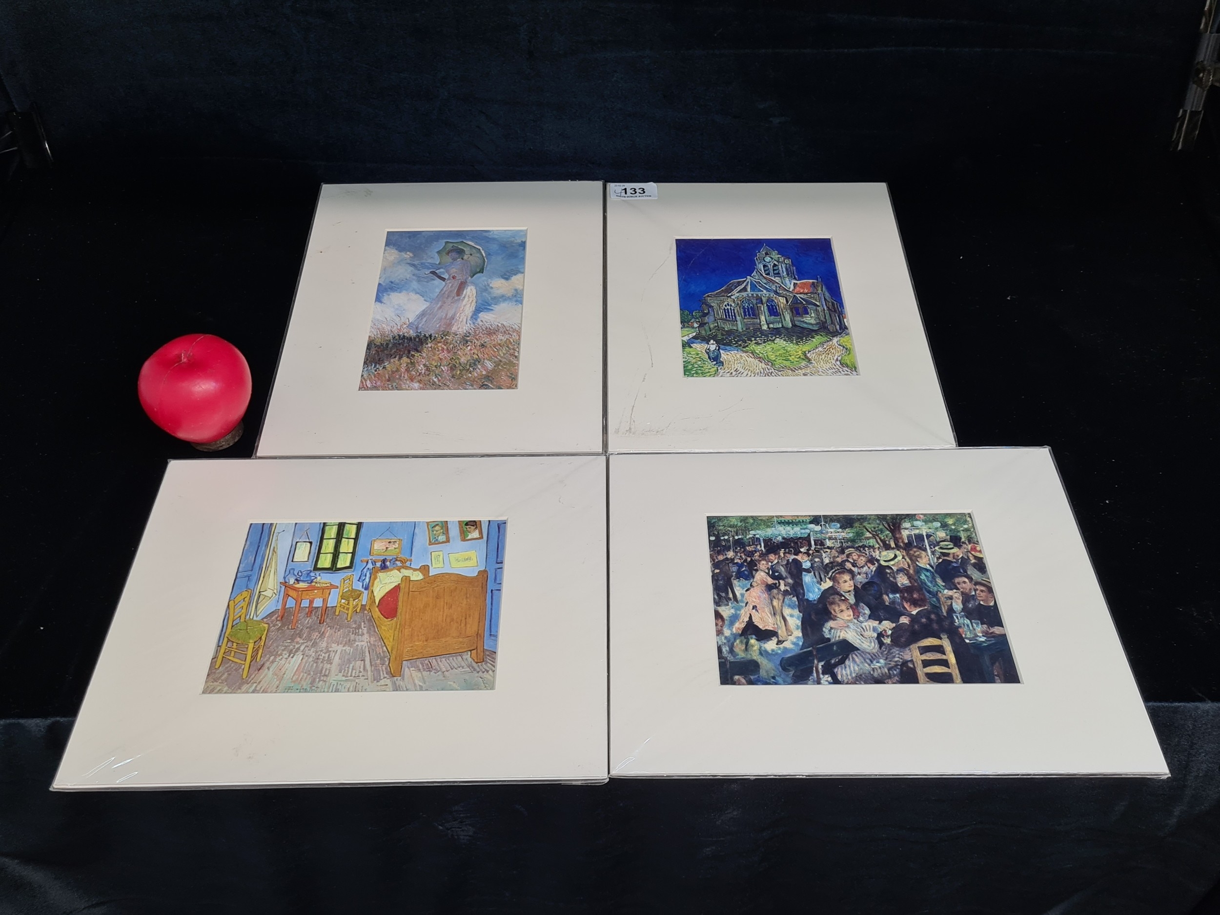 Four circa 2002 prints from Musée d'Orsay Paris. Lot includes Claude Monet - Femme á l'ombrelle tourneé vers la gauche, Pierre - Ausguste Renoir - Bal du Moulin de la Galette, Vincent Van Gogh - La Chambre de Van Gogh and L'Eglise A Auvers sur Oise vue du Chevet. All as new in original packaging.