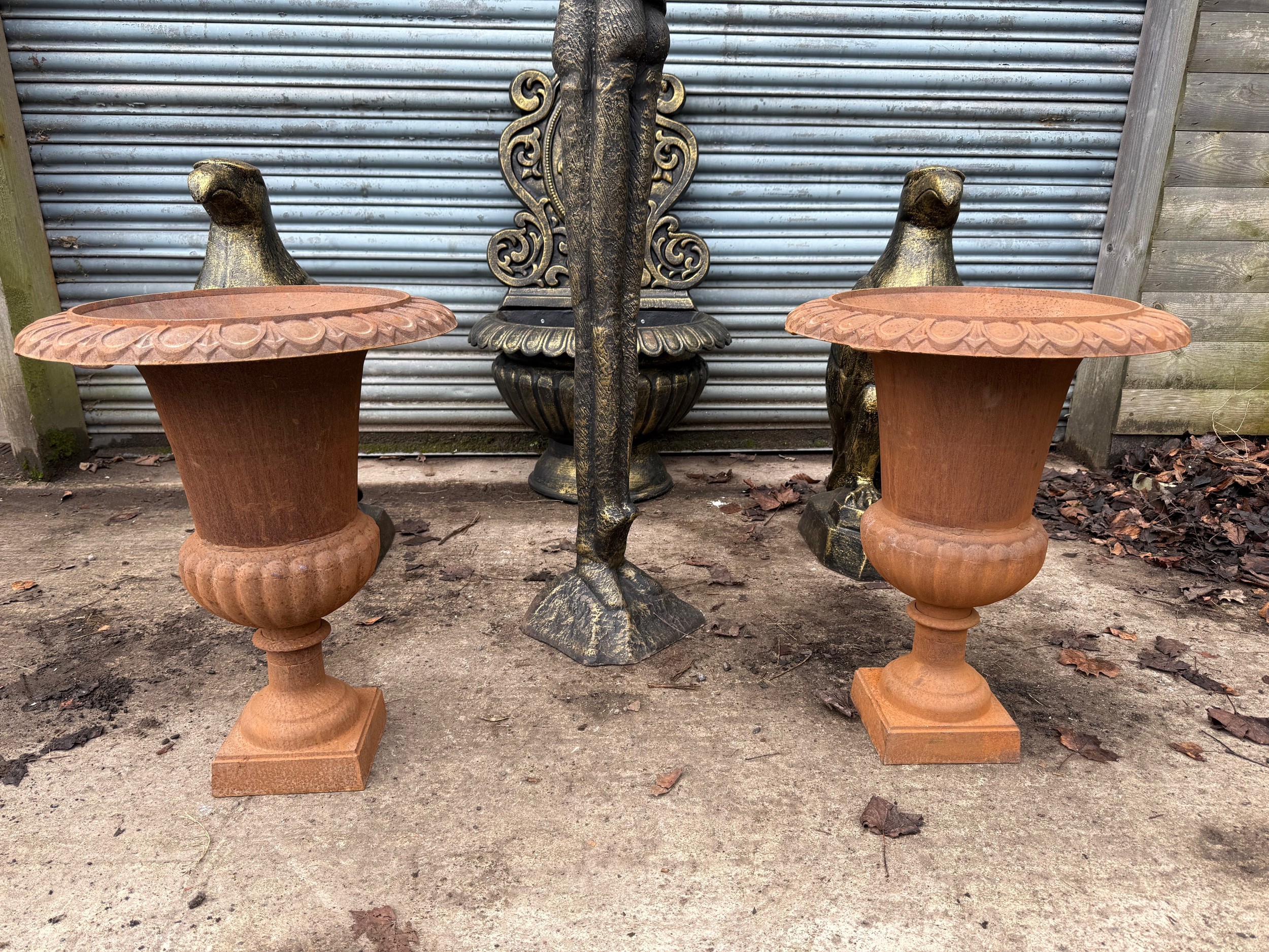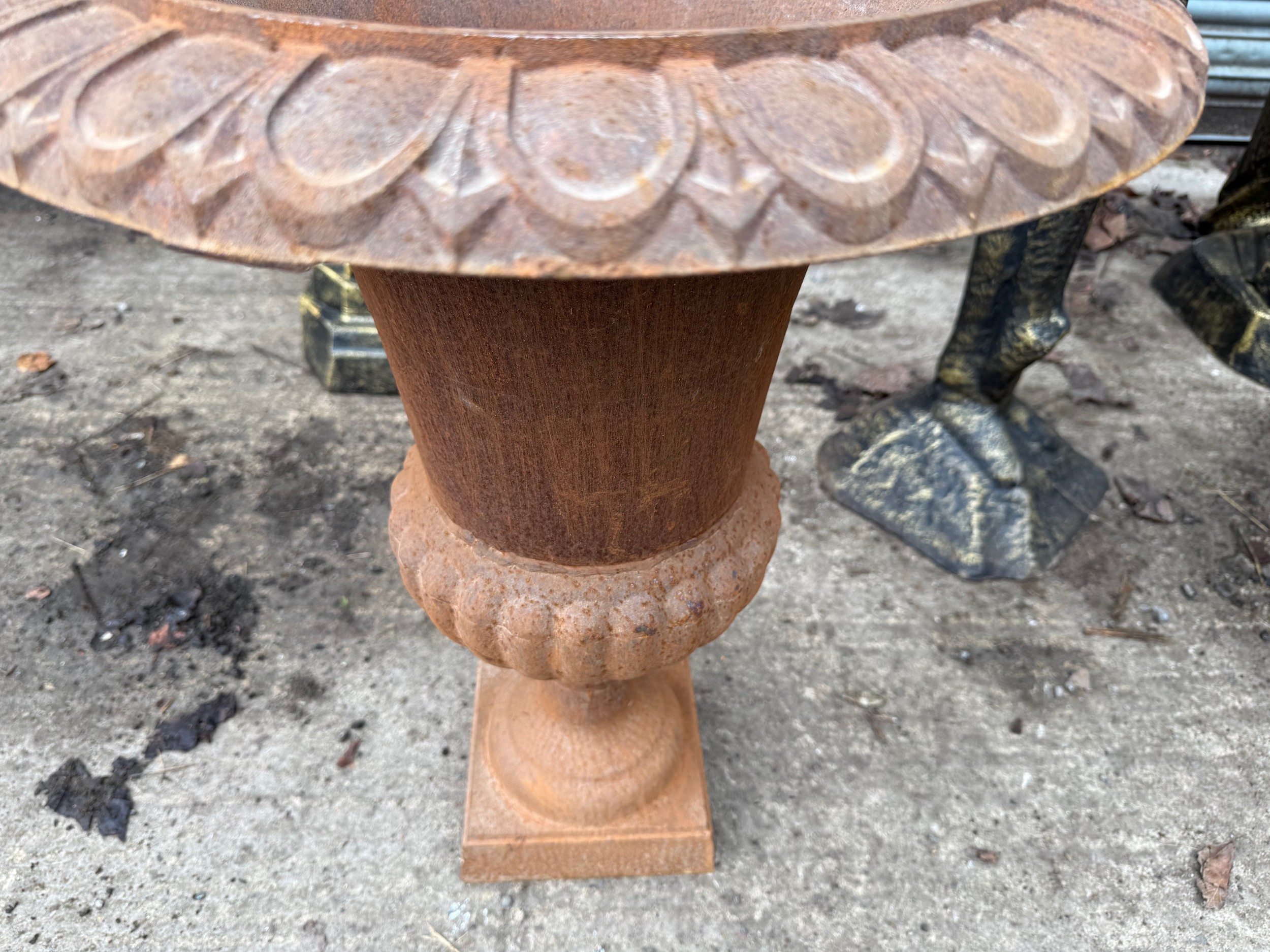 PAIR RUSTY 63CM HIGH CAST IRON URNS