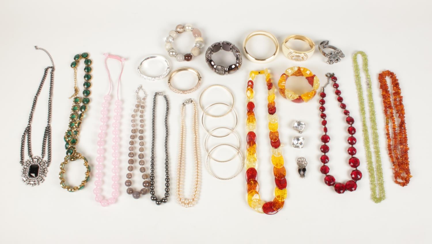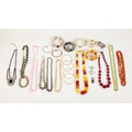 A bag of assorted costume jewellery - to include a rose quartz bead coloured necklace & bracelets etc.
