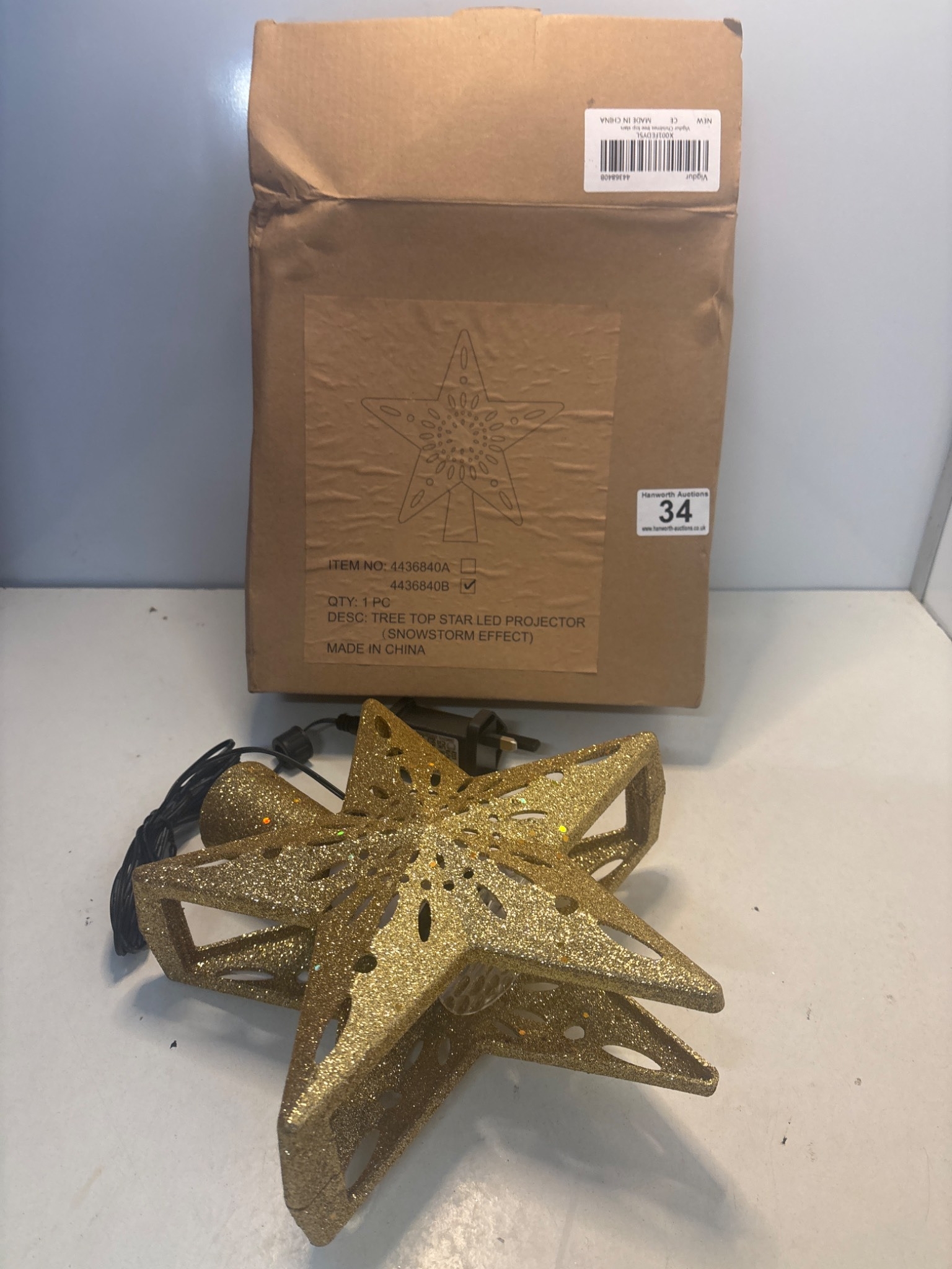 Gold glitter star-shaped LED tree topper with projection feature included in original packaging.