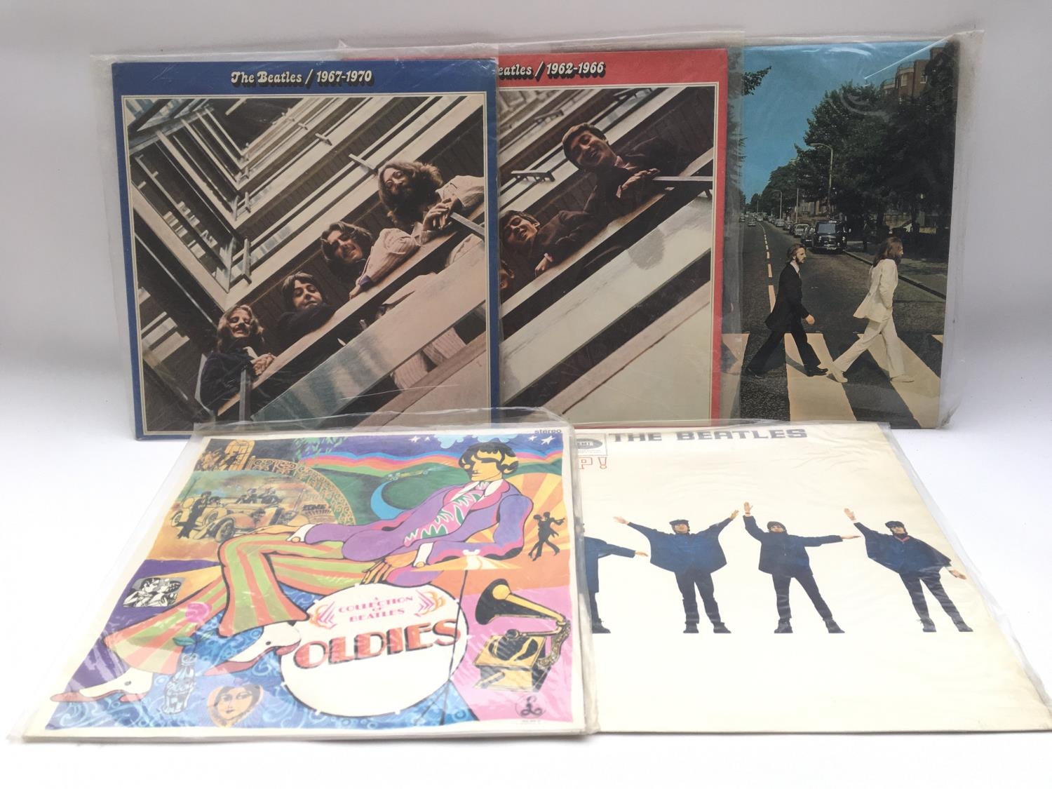 Five Beatles LPs including an early pressing of 'Abbey Road', 'Help!', 'A Collection Of Beatles Oldies' and both 'Red' and 'Blue' albums.