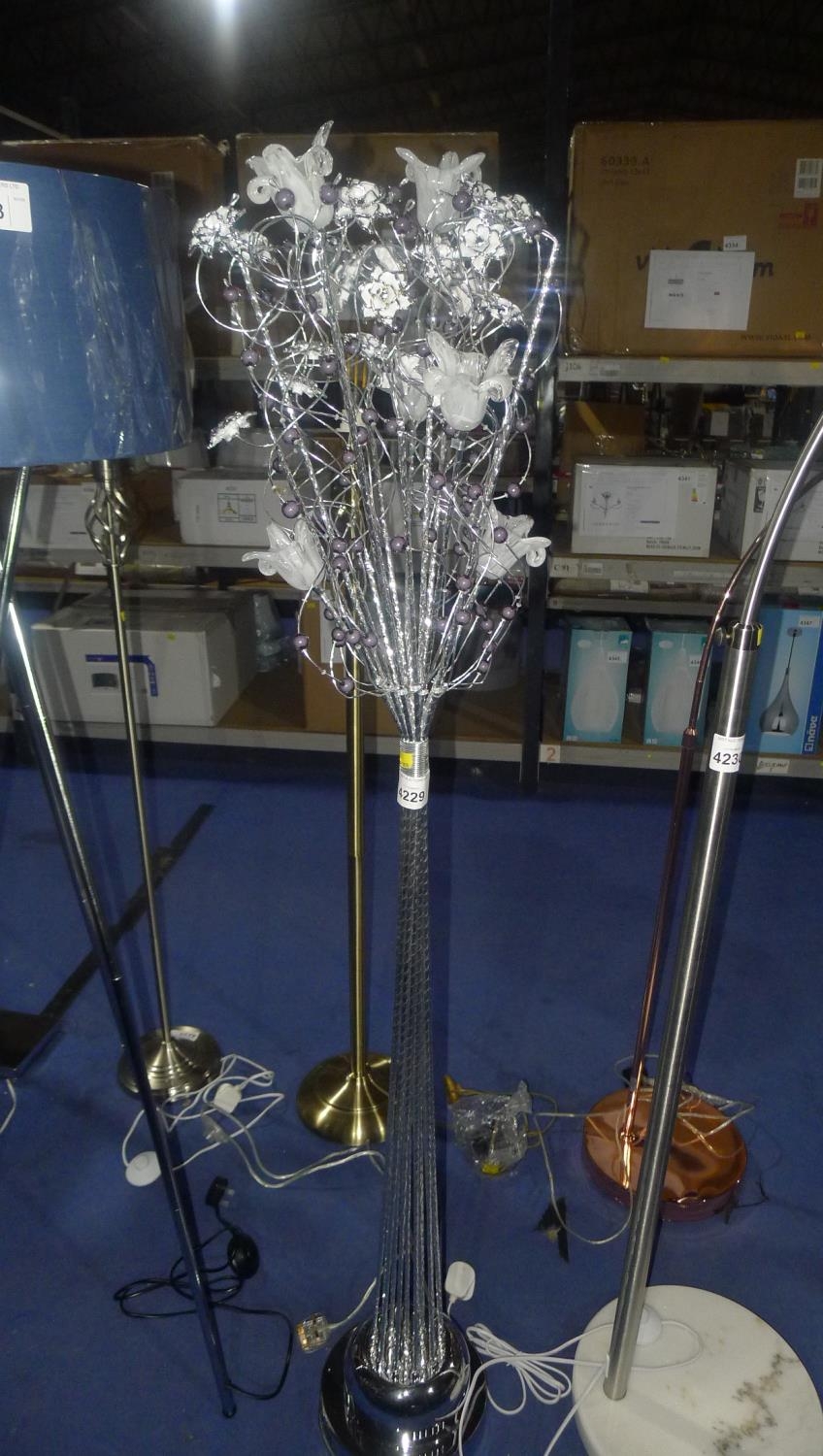 1 floor standing silver coloured lamp 240v with glass flower LED bulb holders and metal flower decorations approx 160cm high