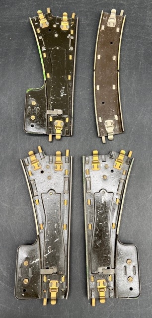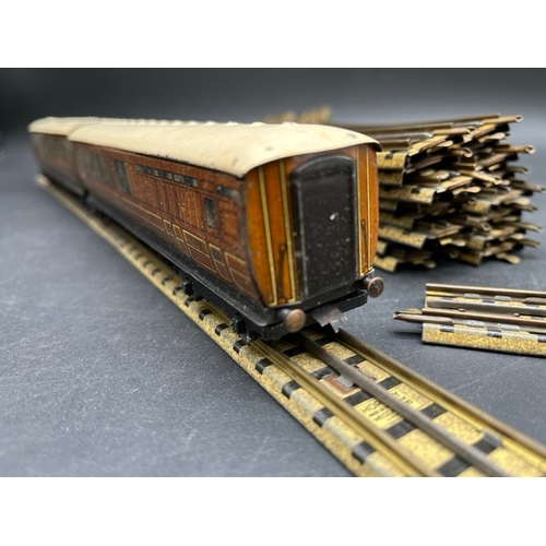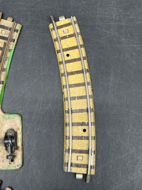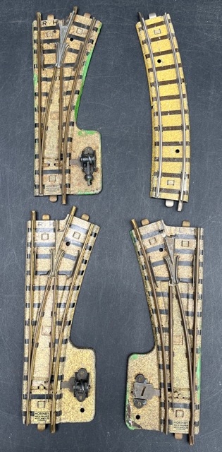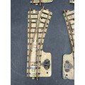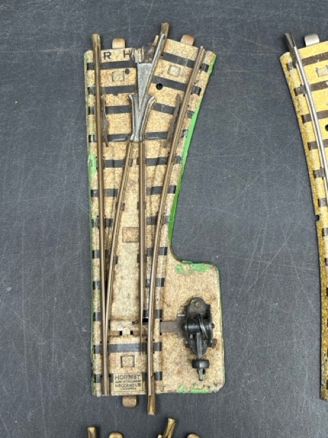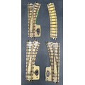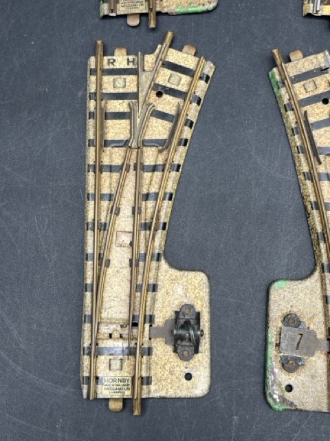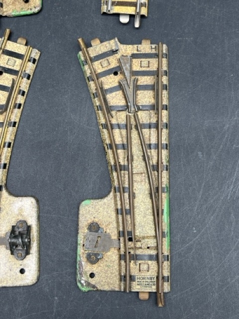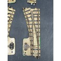 Pre-war Hornby Meccano 2-Rail Clockwork Track; 2 RH Points, 1 LH Point and small curve