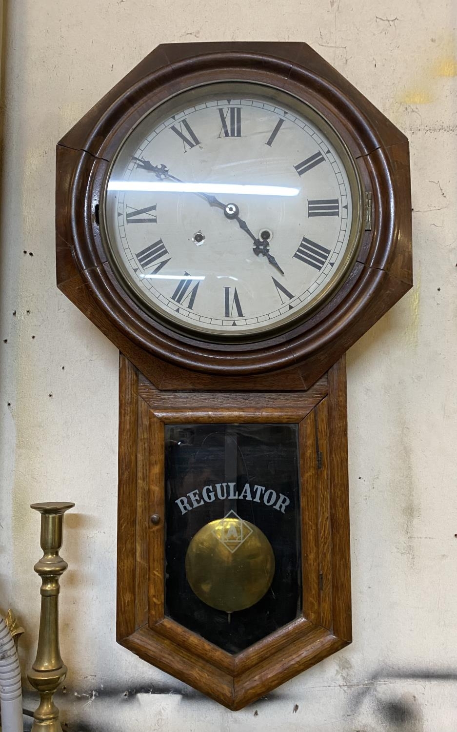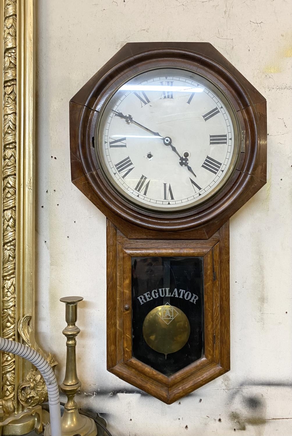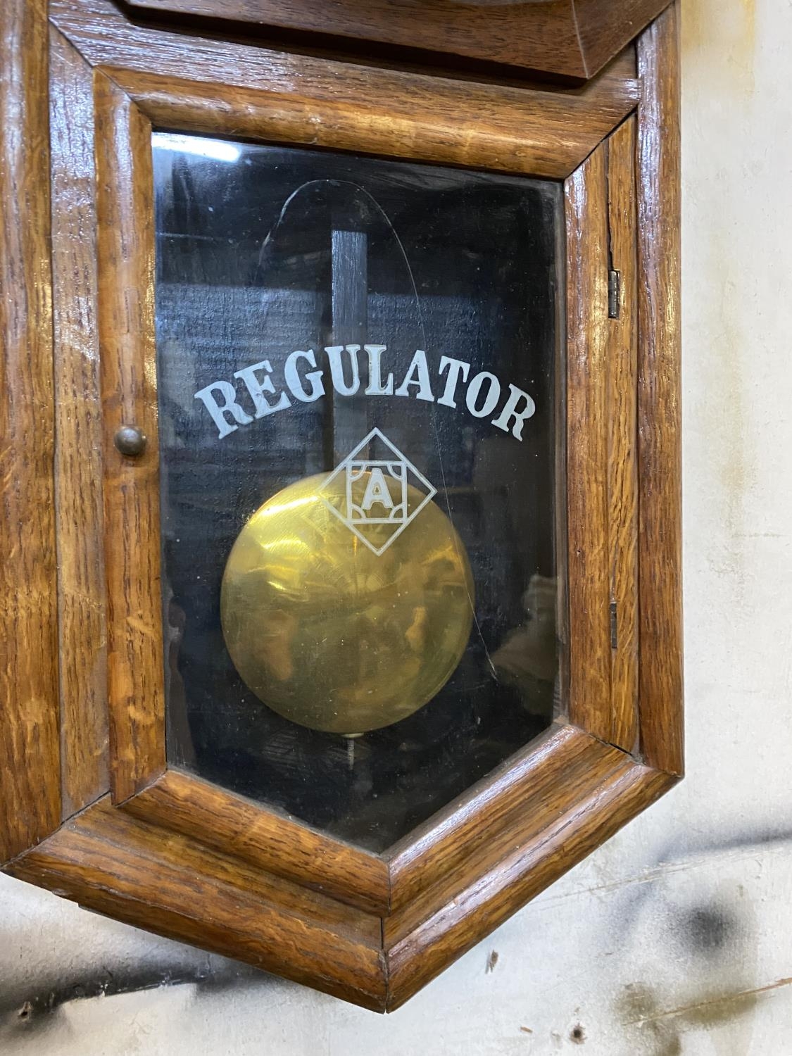 A FINE VICTORIAN ASTONIA REGULATOR WALL CLOCK, roman numerals to dial, within octagonal frame atop long drop base with glass door reading Regulator and Astonia mark, glass door revealing pendulum. Dimensions: 81cm long x 45cm wide approx.